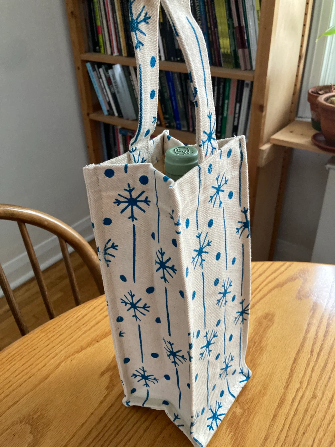 This is a cute reusable wine gift bag made of sturdy canvas. with a snowflake pattern! Perfect for gifting a bottle of wine during the holidays or any time of year. It's in great condition and ready to use for your next gift-giving occasion.