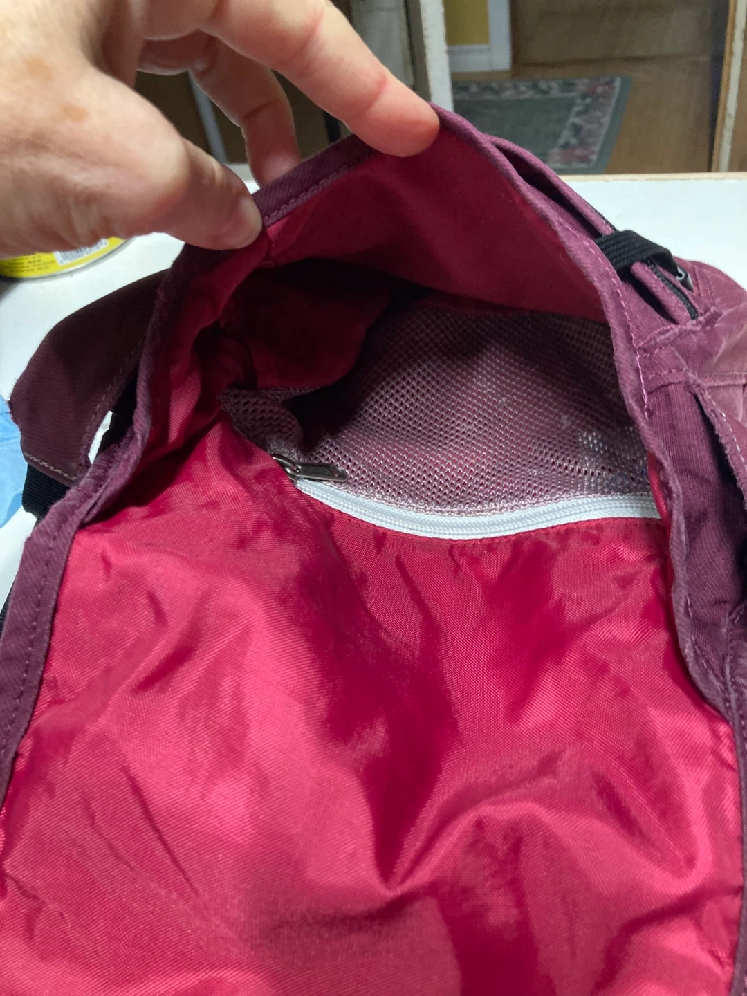 A cute burgundy crossbody bag perfect for everyday use! It features two front zipper pockets, an extra pouch,and a unique embroidered design. The inside is lined with a coordinating red fabric and includes another zipper pocket. The strap is adjustable for comfortable wear. Has been machine-washed and is in pristine condition.