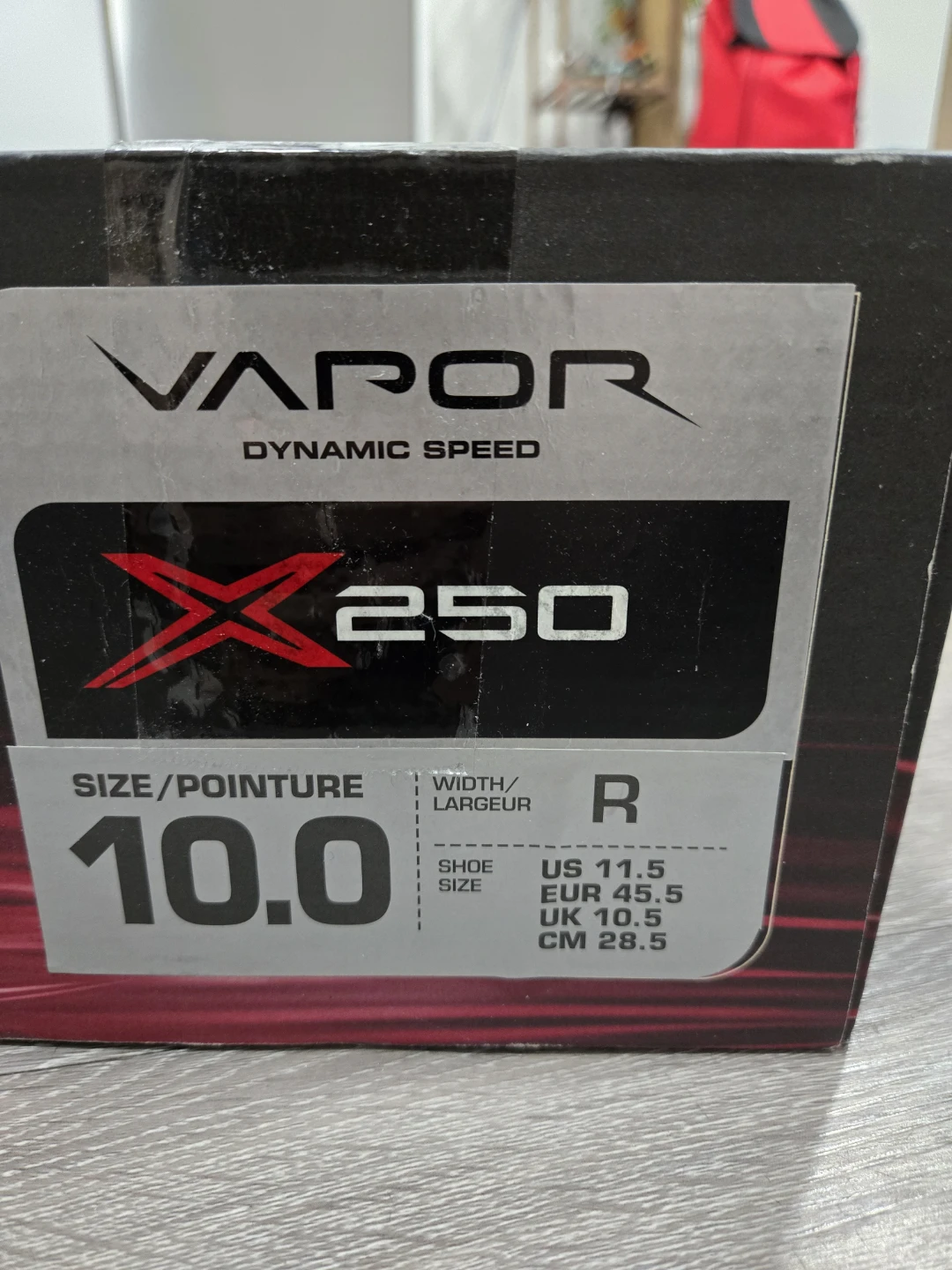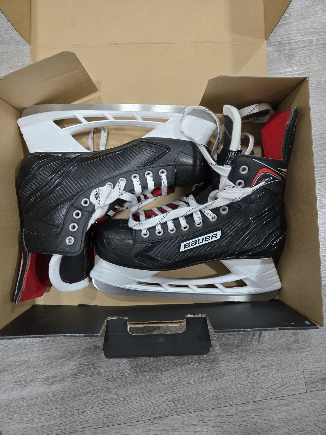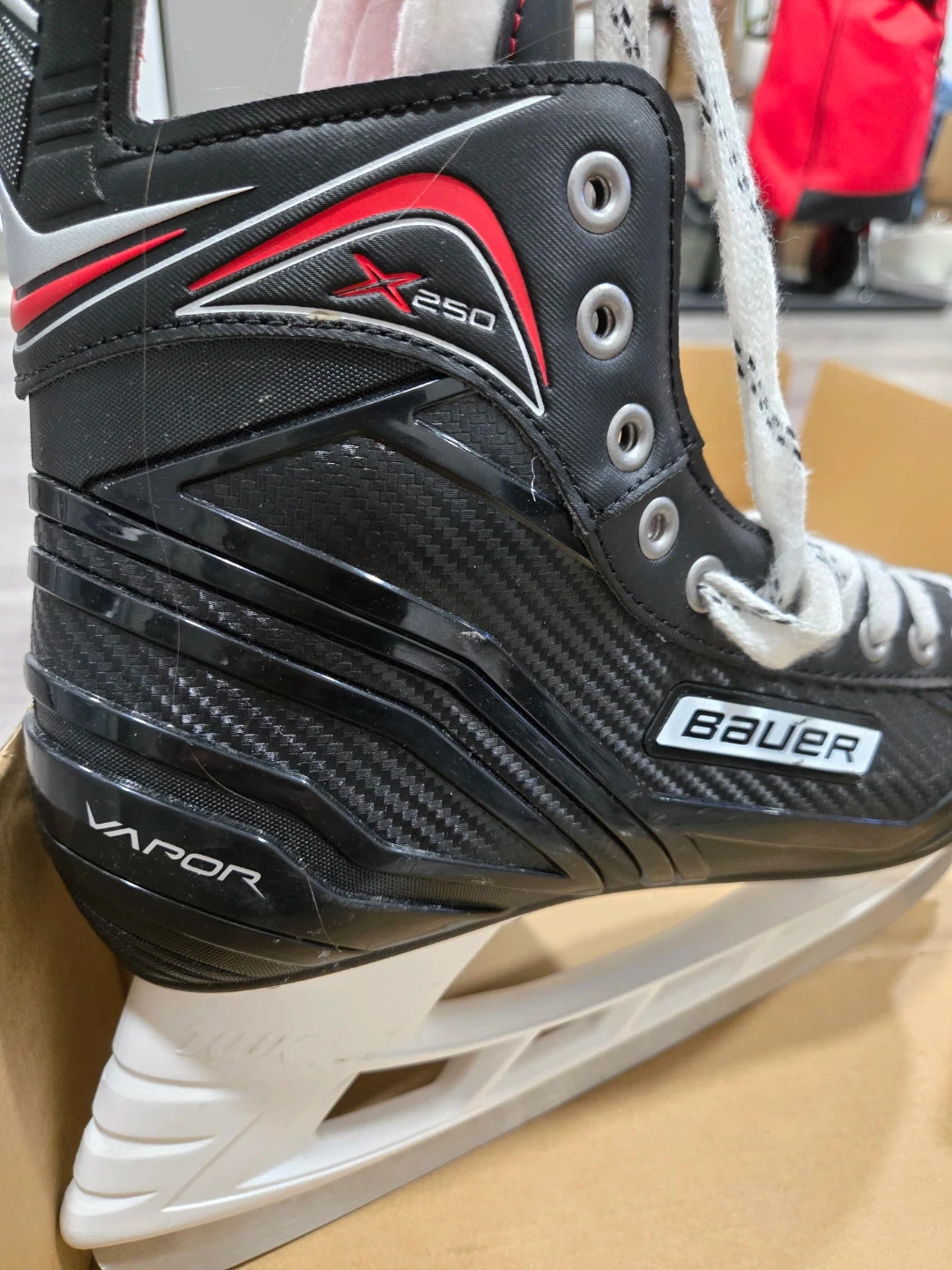 Selling a pair of Bauer Vapor X2 ice hockey skates. They are black with red and silver accents. The skates are in great condition and come with the original box.