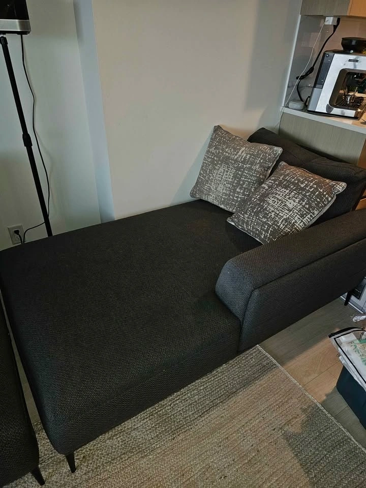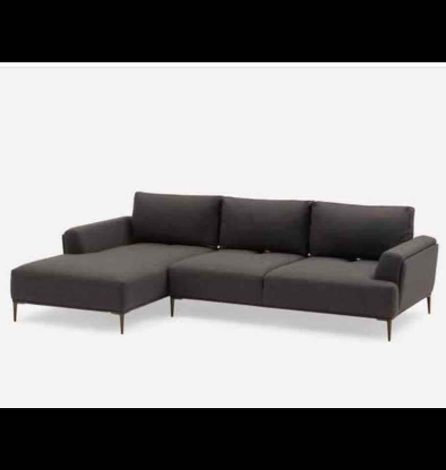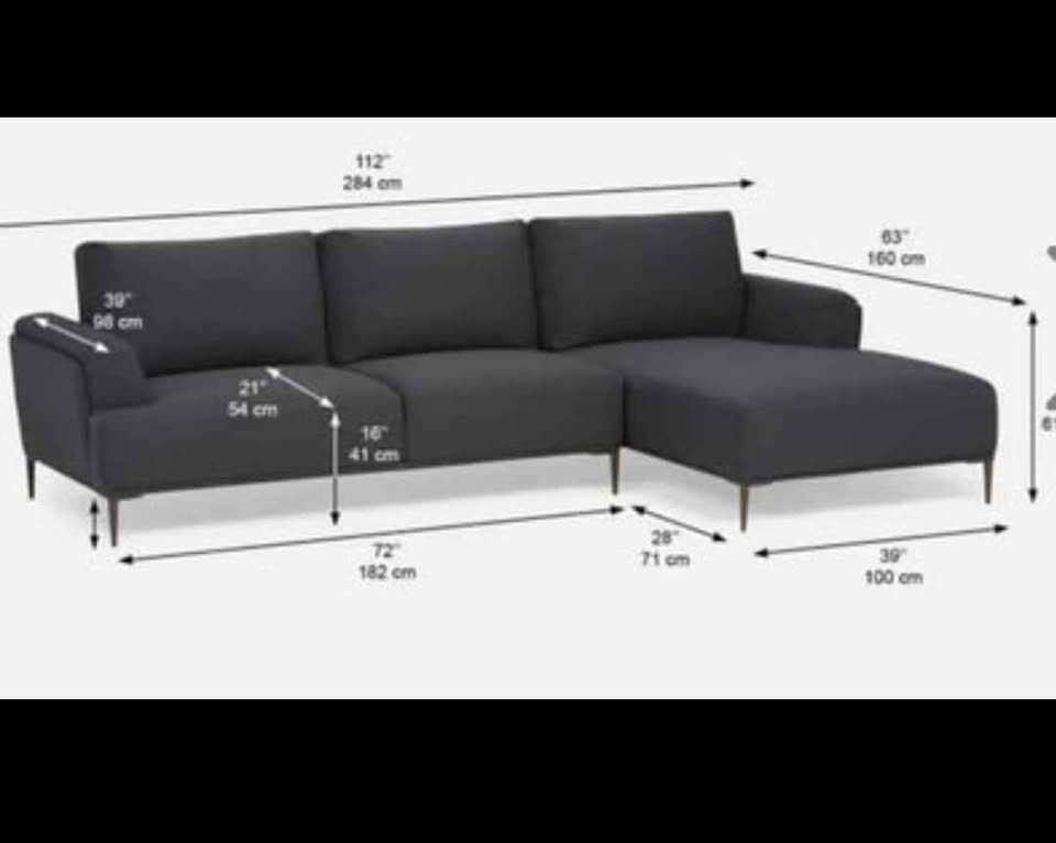 Great gray sectional sofa! 3-seater with chaise lounge. Dimensions: 284cm wide, 182cm deep (chaise side), 160cm deep (other side), 98cm tall (arm height), 54cm deep (arm width), 41cm high (seat height). Has metal legs. Comfortable and spacious.