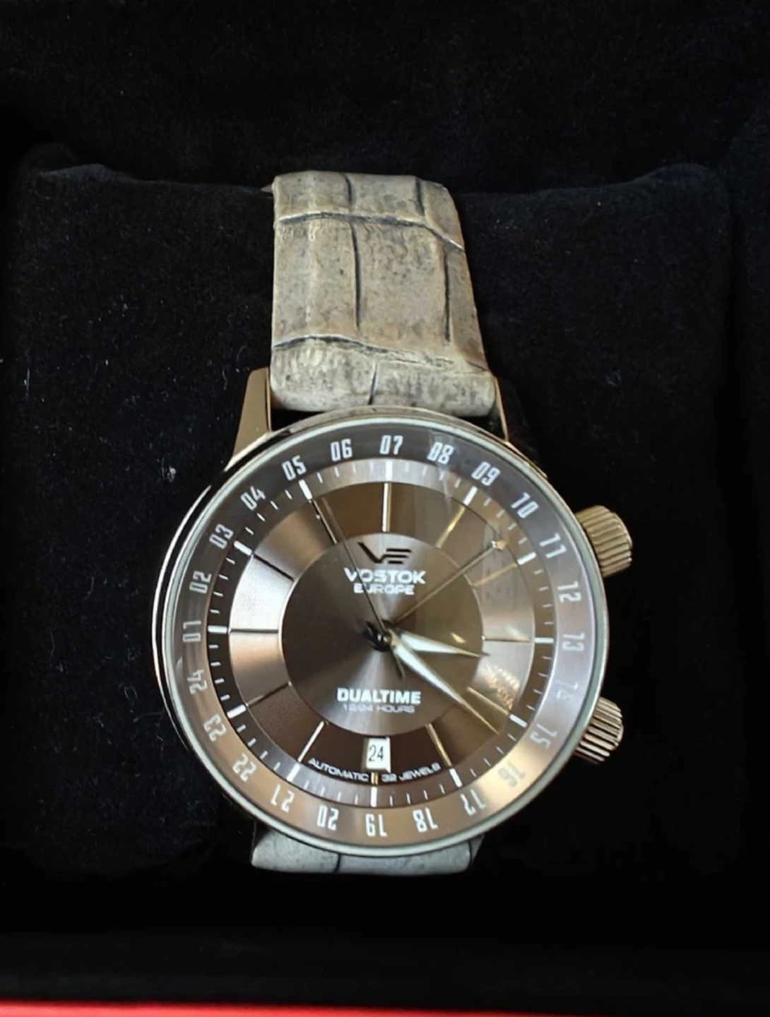 Selling a Vostok Europe Dualtime watch. It comes with the original box and is in great condition. The watch is water-resistant to 5 ATM and has 32 jewels. The back casing is all stainless steel. A stylish and functional timepiece and a great addition to any watch collection.