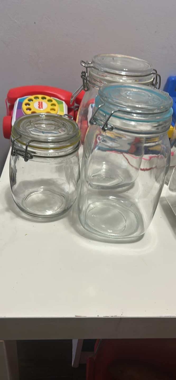 Selling a set of glass jars with metal lids. They're in great shape and ready for your kitchen or pantry! Perfect for storing spices, snacks, or anything else you need to keep fresh. They come in various sizes.