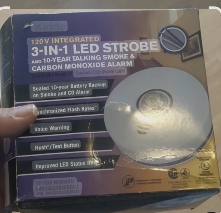Selling a Kidde 3-IN-1 LED Strobe and 10-Year Talking Smoke & Carbon Monoxide Alarm. It features a sealed 10-year battery backup on smoke and CO alarm, synchronized flash rates, voice warning, hush/test button, and improved LED status ring. The box includes a 10 year warranty