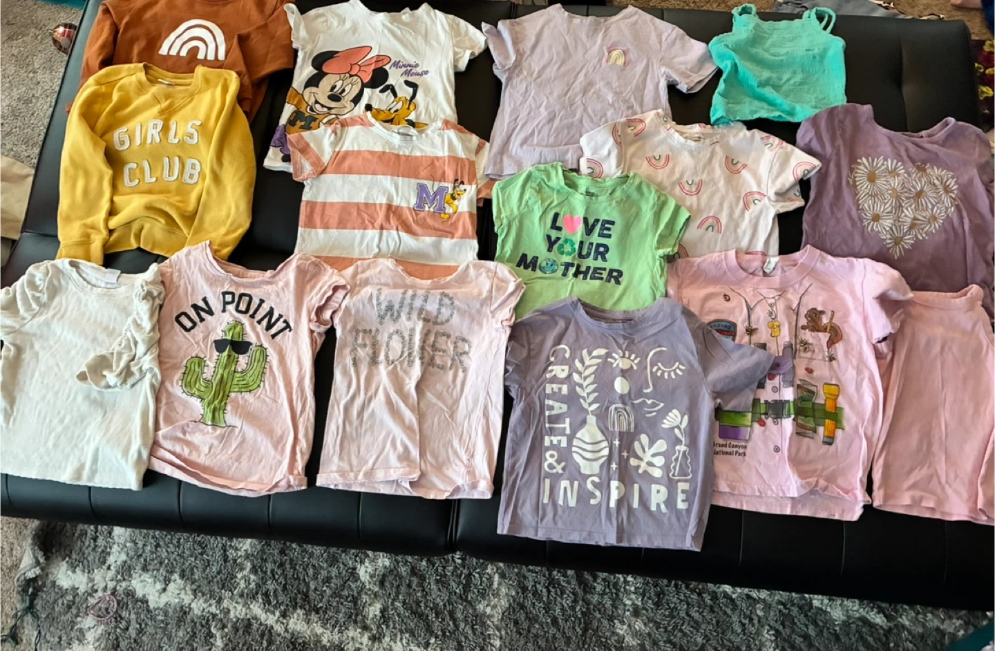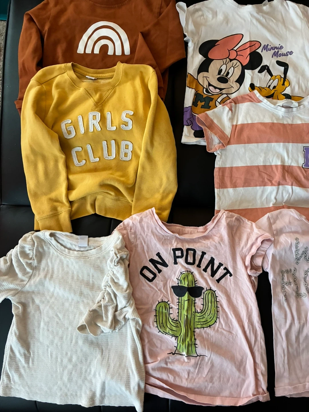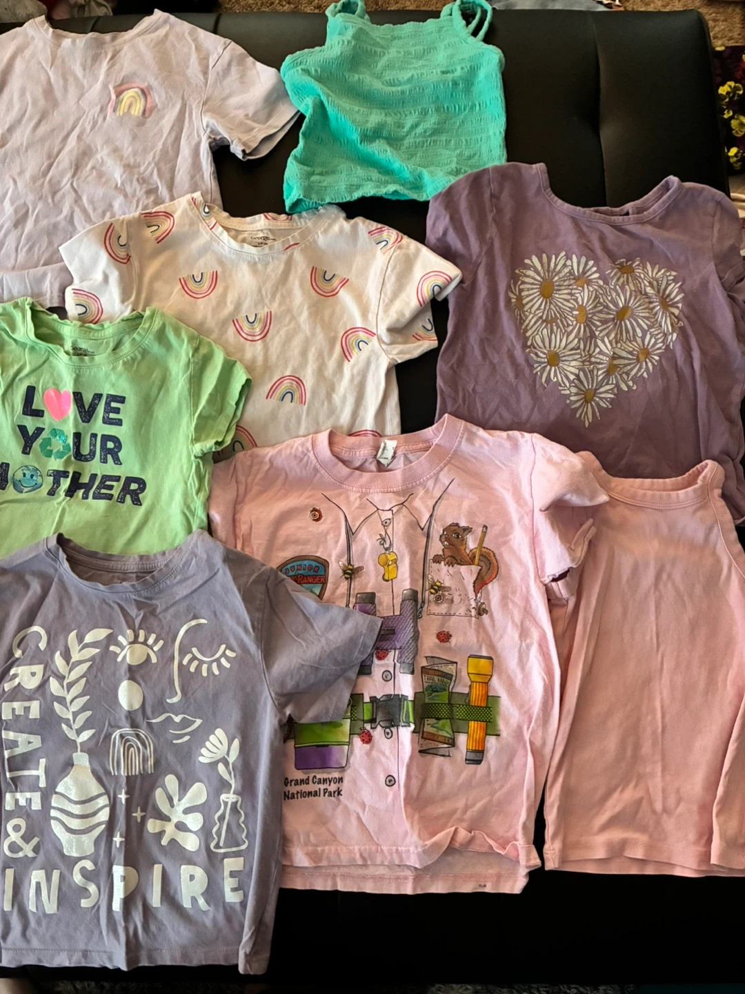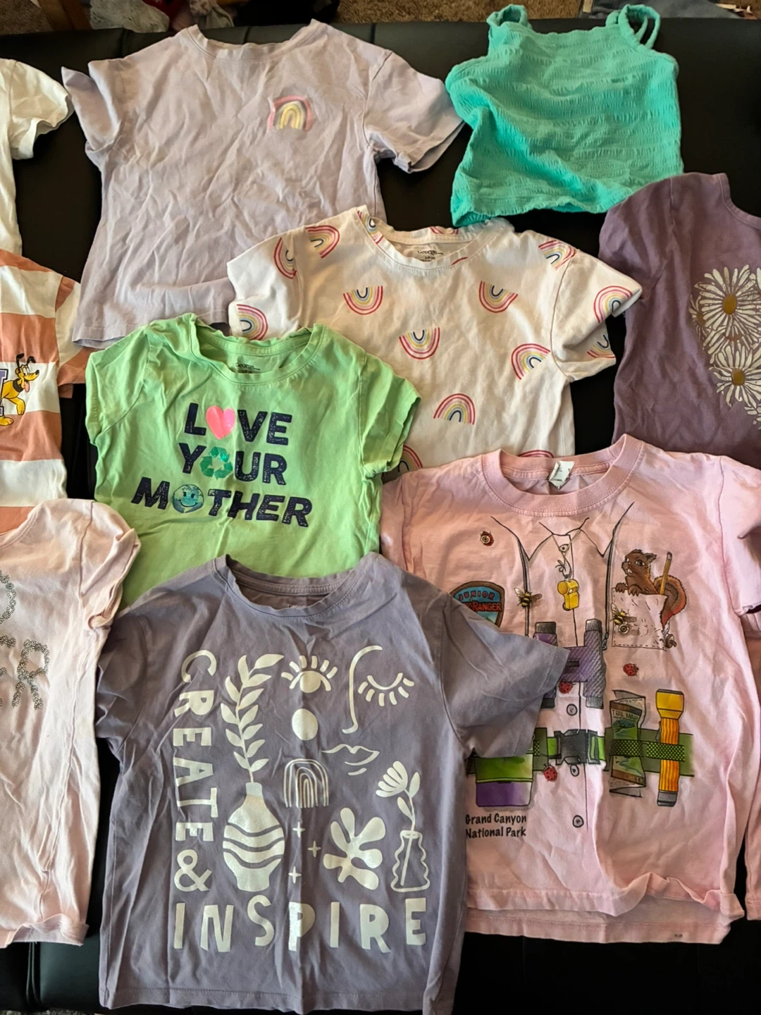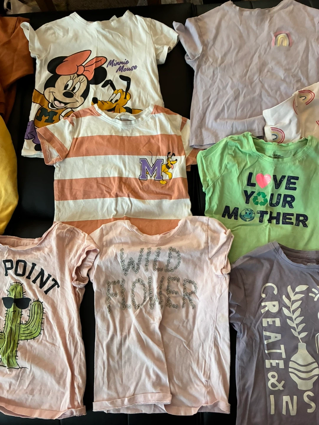 Selling a big bundle of girls' t-shirts! There's a mix of different sizes and styles, from graphic tees to cute patterns. Perfect for stocking up her wardrobe with some fun and comfy options!