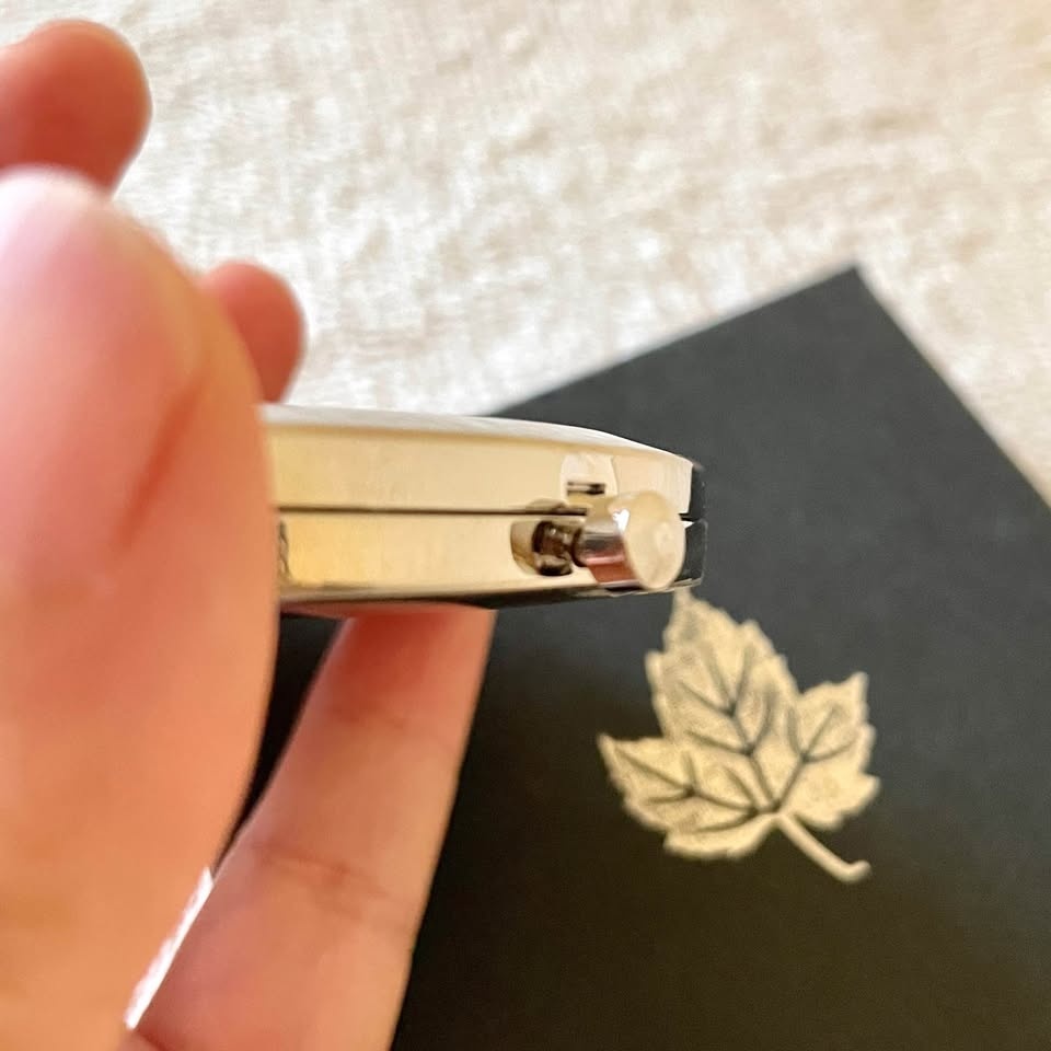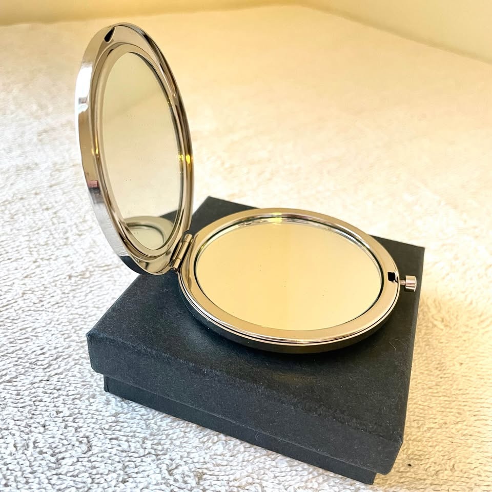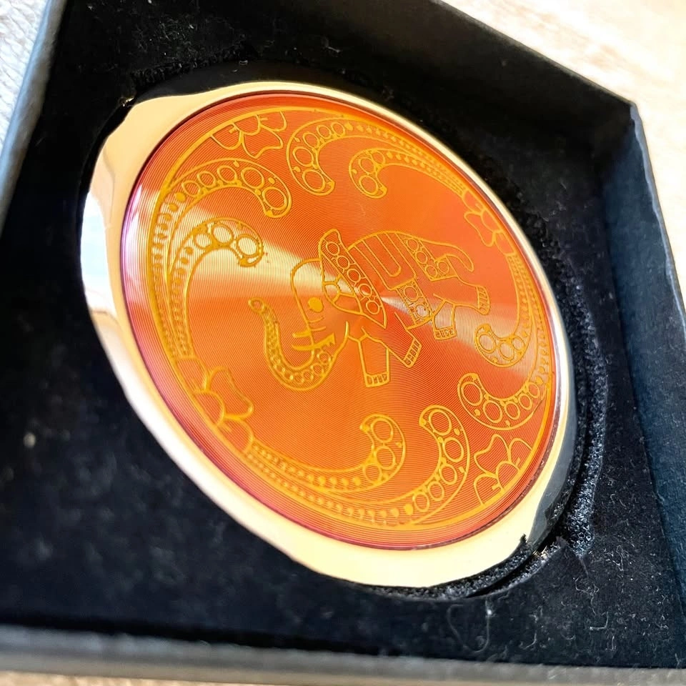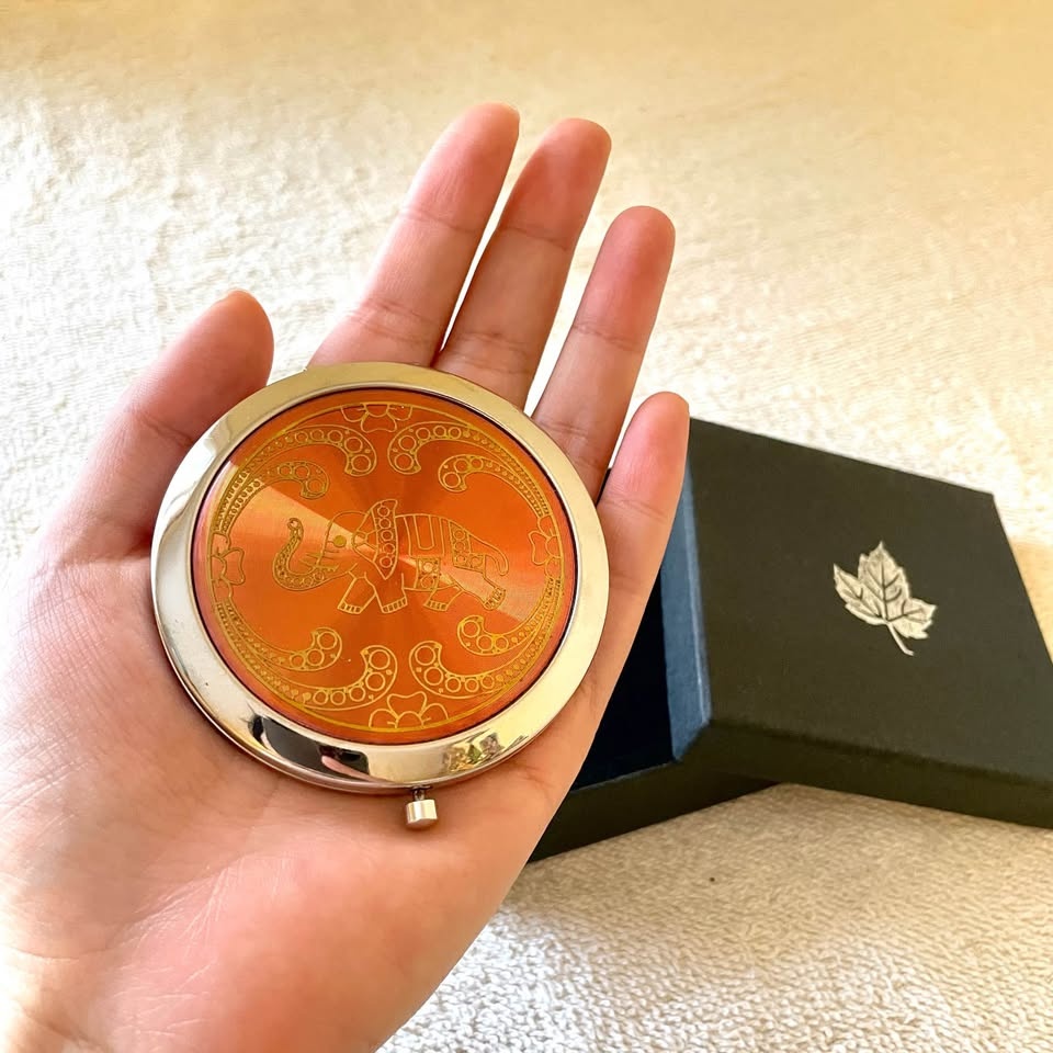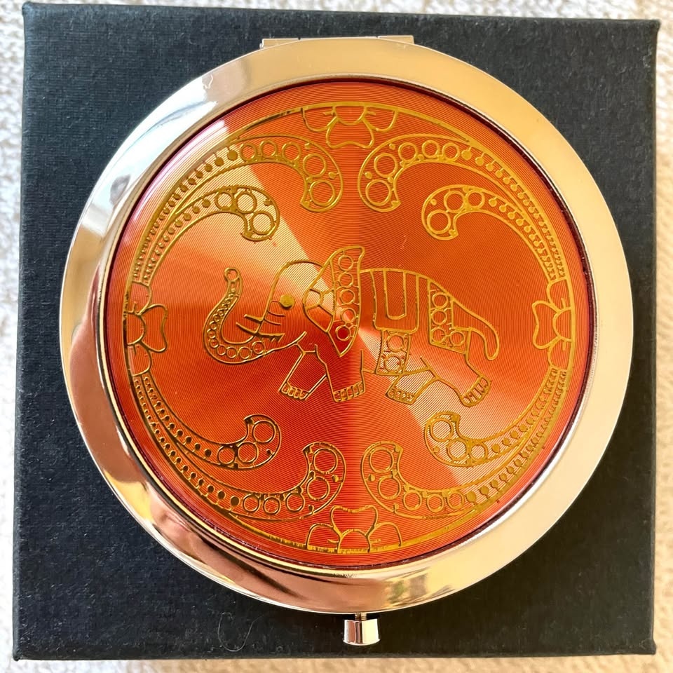 A charming double-sided compact mirror featuring a cute elephant motif surrounded by delicate gold detailing on a metallic orange background.