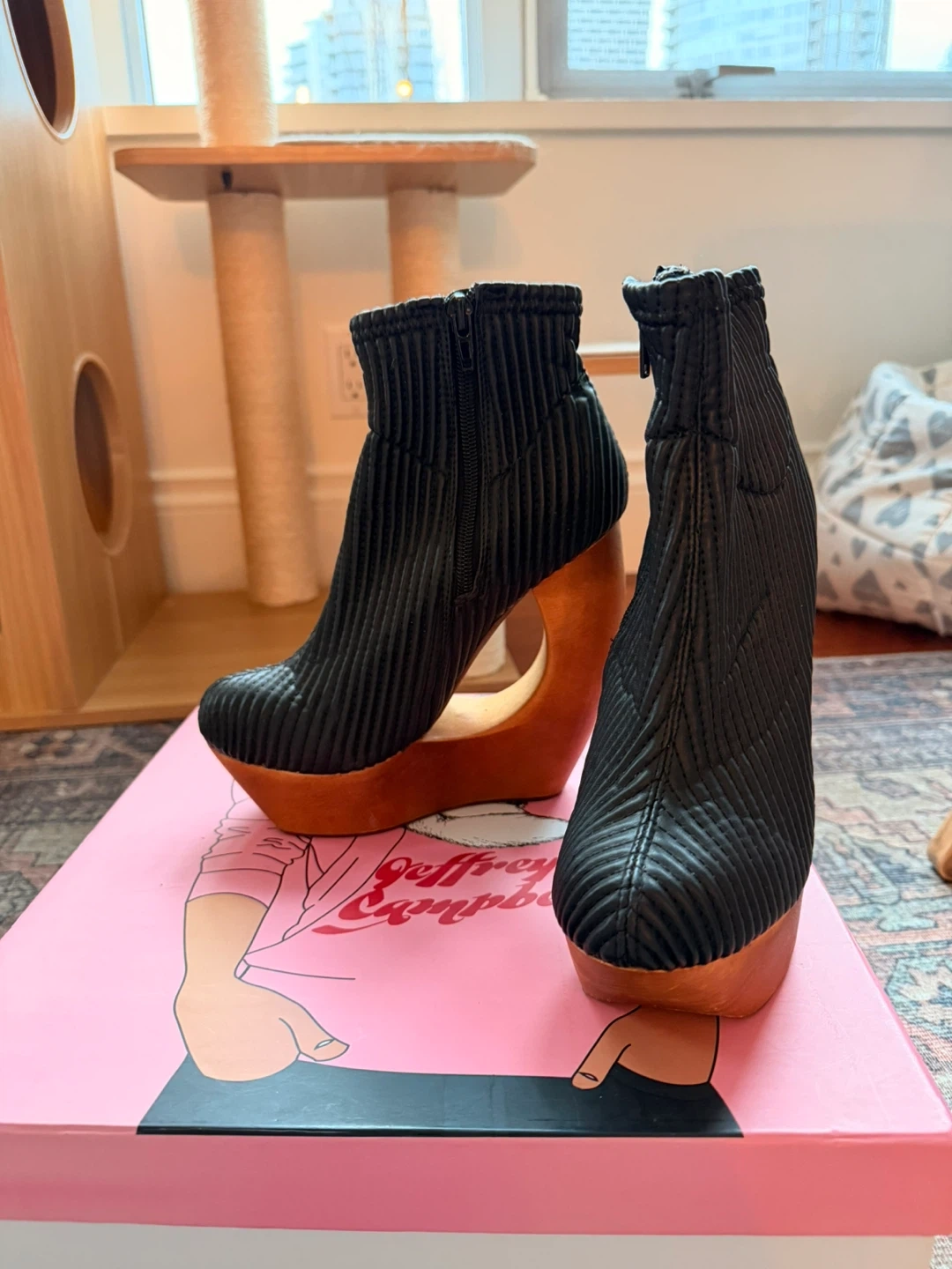 Selling a pair of Jeffrey Campbell ankle boots in black, size 6! They have a unique wooden heel and come with the original box. These are a stylish statement piece for any wardrobe