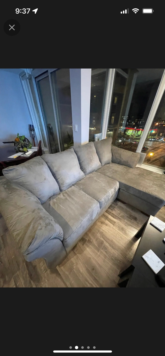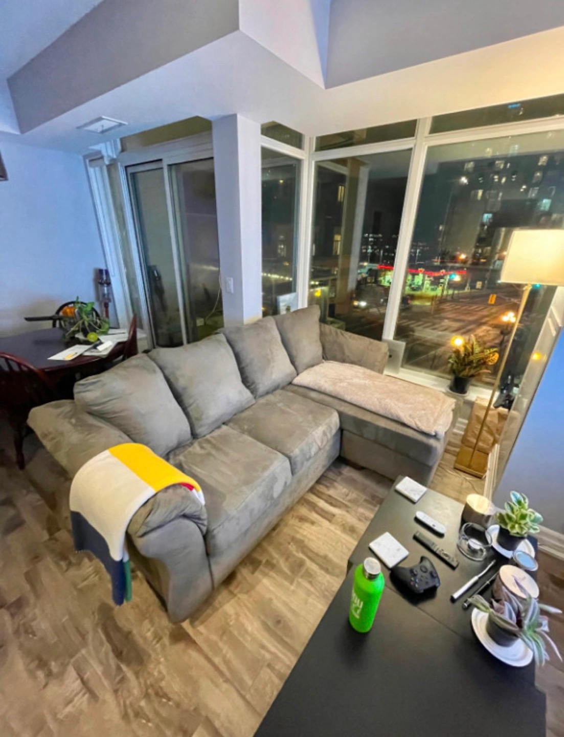 Ready for a new home! Clean, young professional couple in Yorkville near Yonge and Davenport - non smoking, no dogs. Used this sectional in our apartment for 1.5 years, added new Polyfil stuffing to cushions for added comfort/life. Regularly vacuumed and cleaned using steam cleaner. Material is microfibre which makes it pretty easy to keep clean. Cleaned with steam cleaner and ready for pickup.