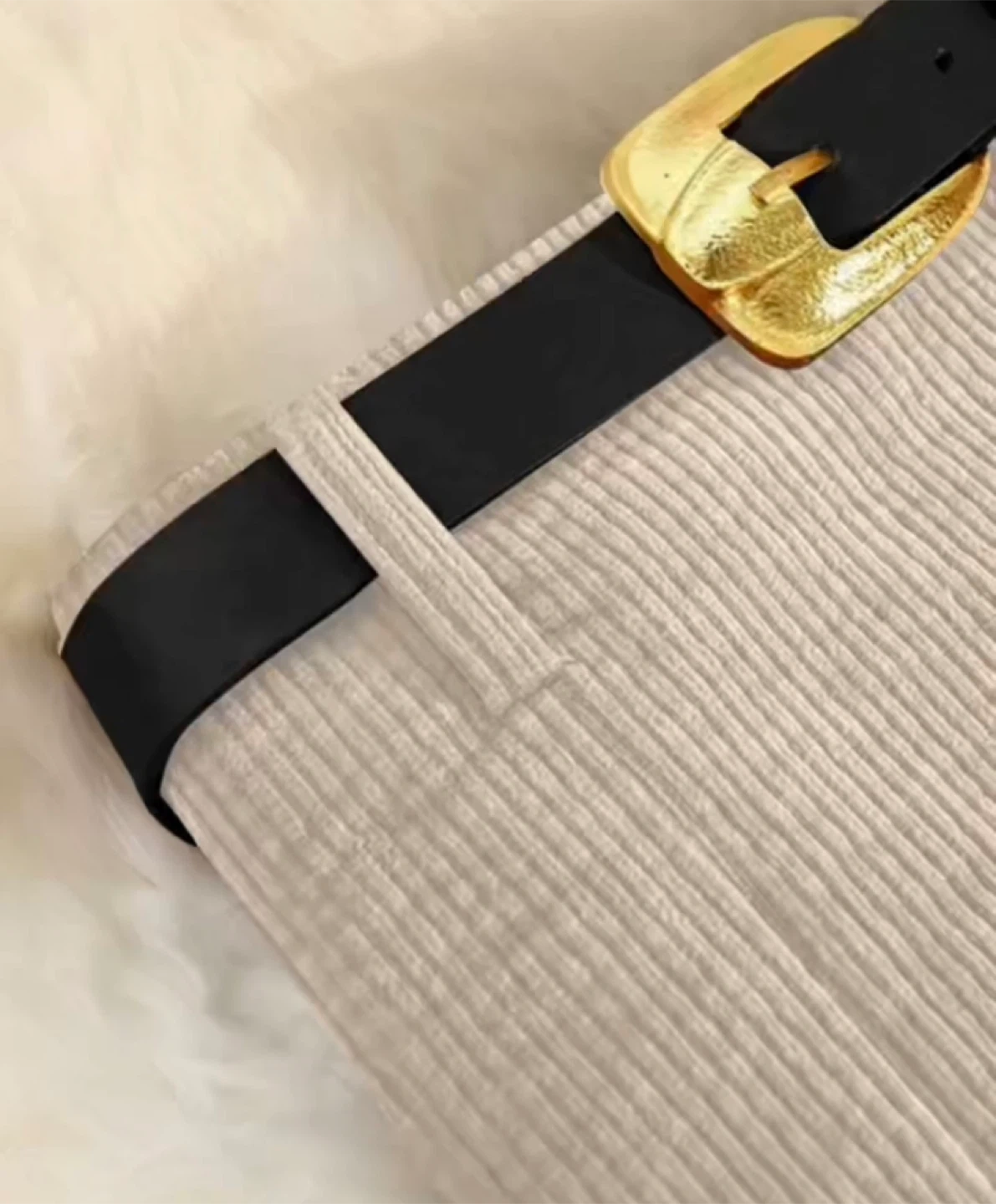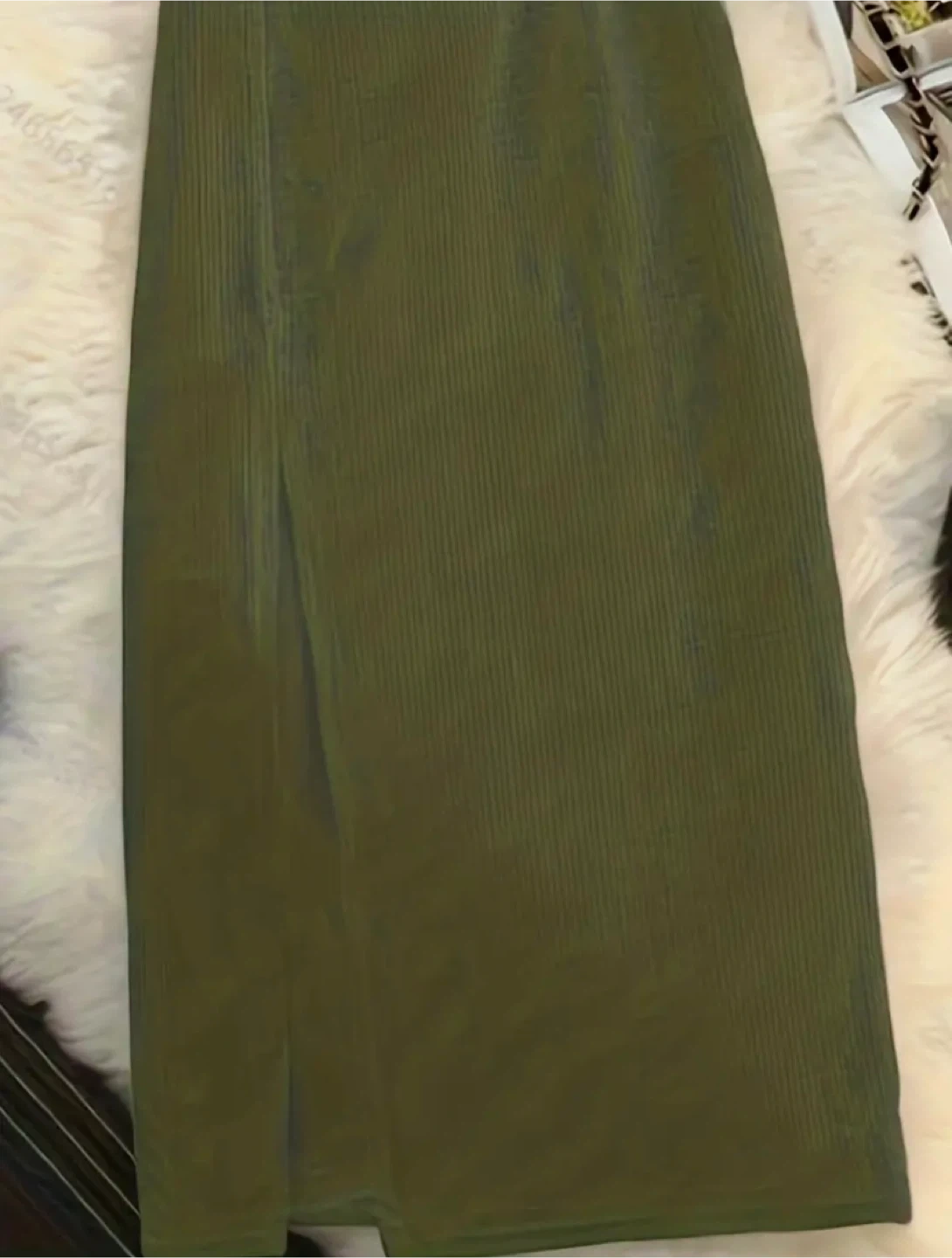 Selling a stylish corduroy midi skirt with a slit. It's a versatile piece that can be dressed up or down. The skirt features a classic corduroy texture and a flattering midi length. The slit adds a touch of modern flair, making it perfect for various occasions. Available in olive green.
