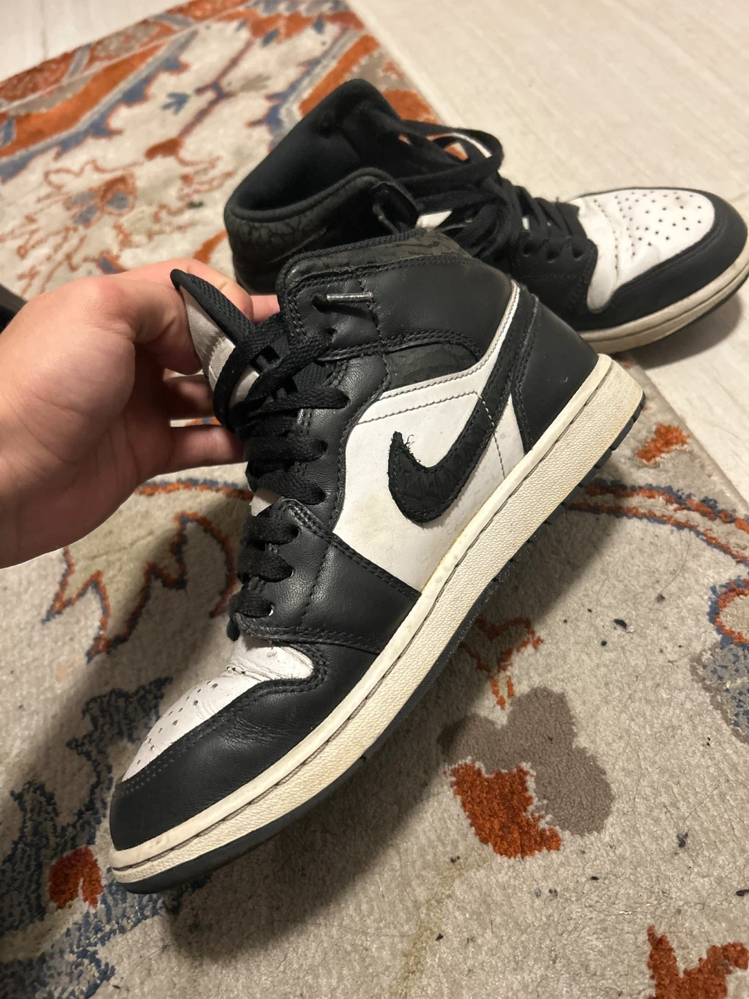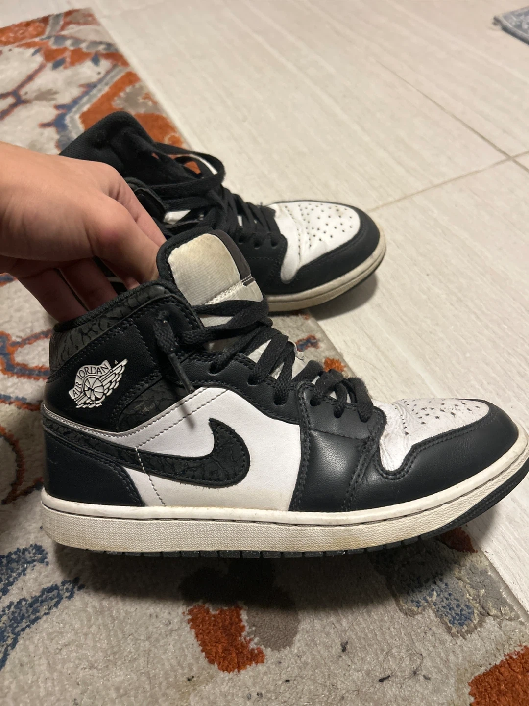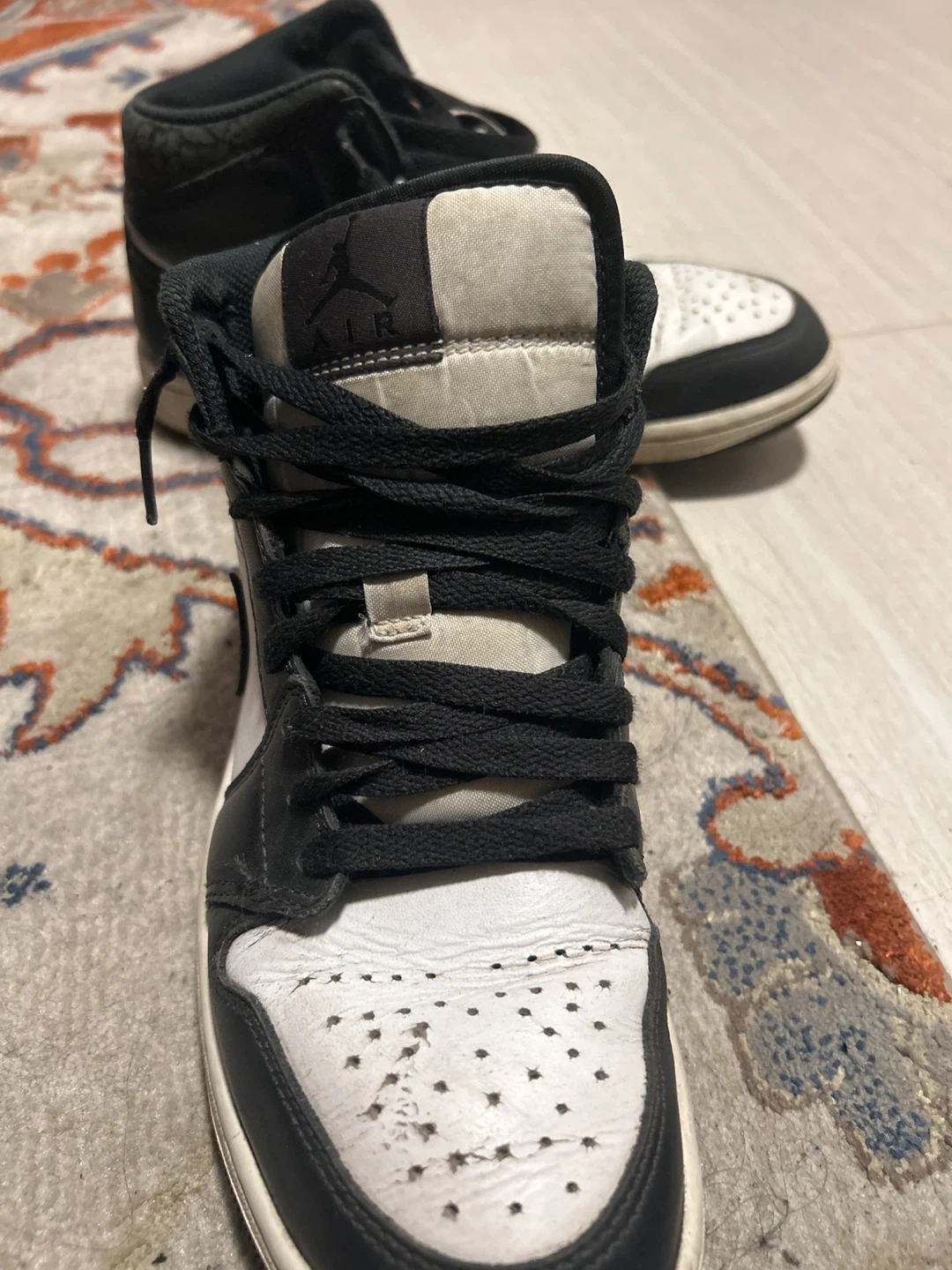 Selling a pair of Nike Air Jordan 1 Mid sneakers in black and white! They're in used condition, as you can see in the pictures, but still have plenty of life left. Perfect for everyday wear or hitting the court