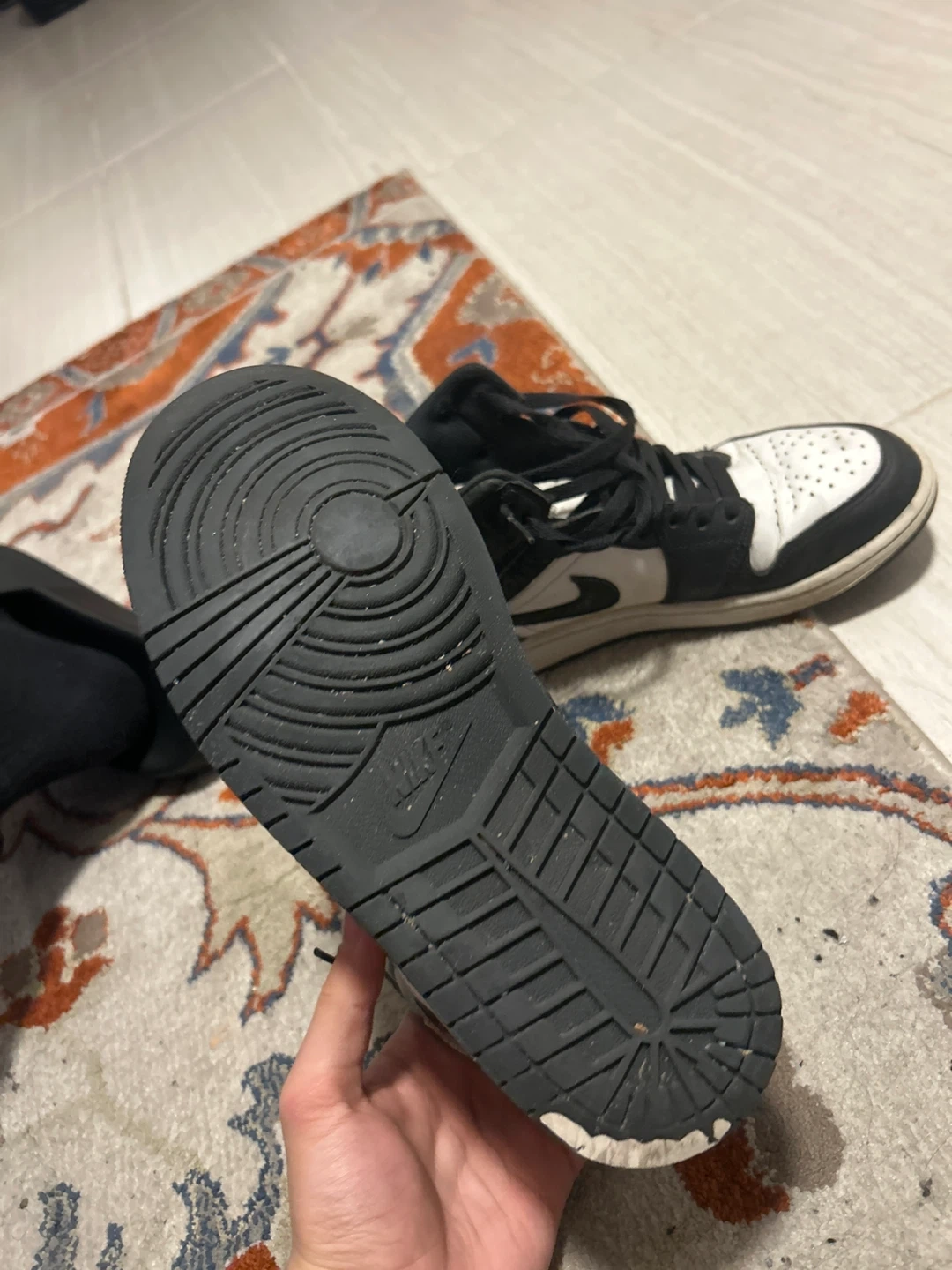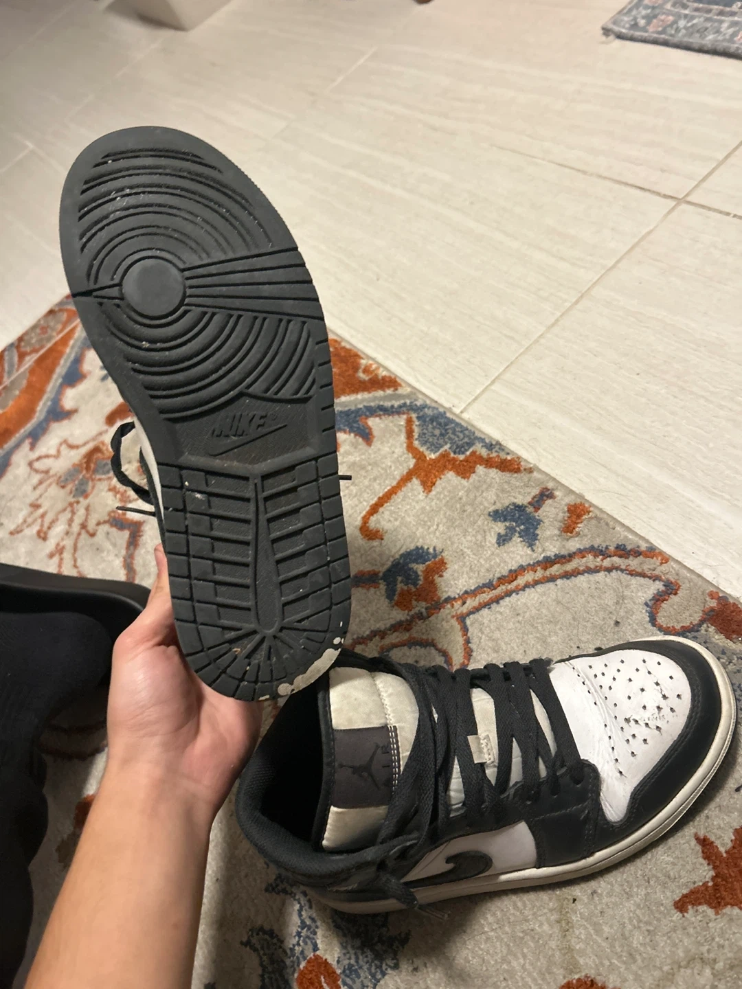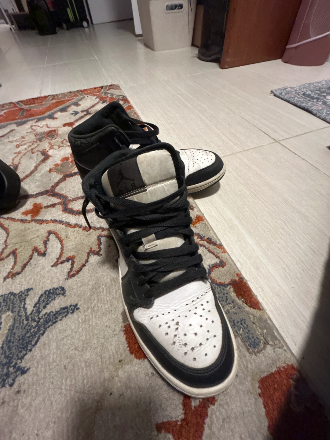 Selling a pair of Nike Air Jordan 1 Mid sneakers in black and white! They're in used condition, as you can see in the pictures, but still have plenty of life left. Perfect for everyday wear or hitting the court