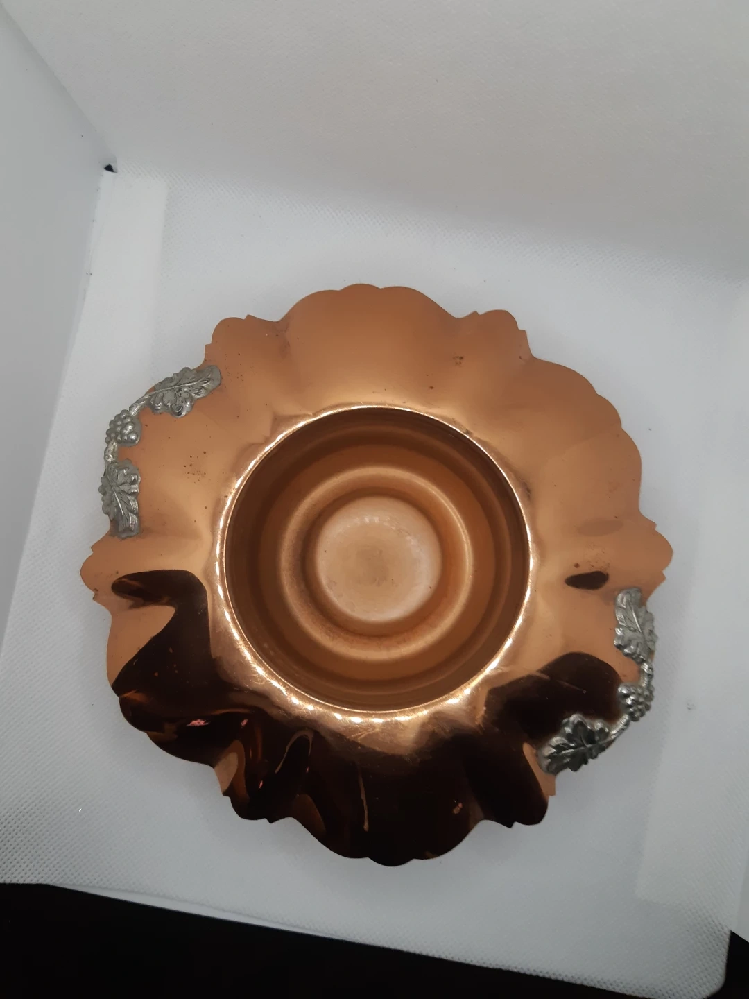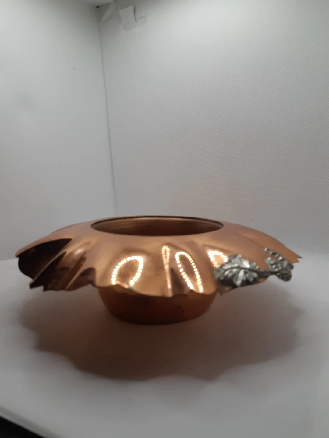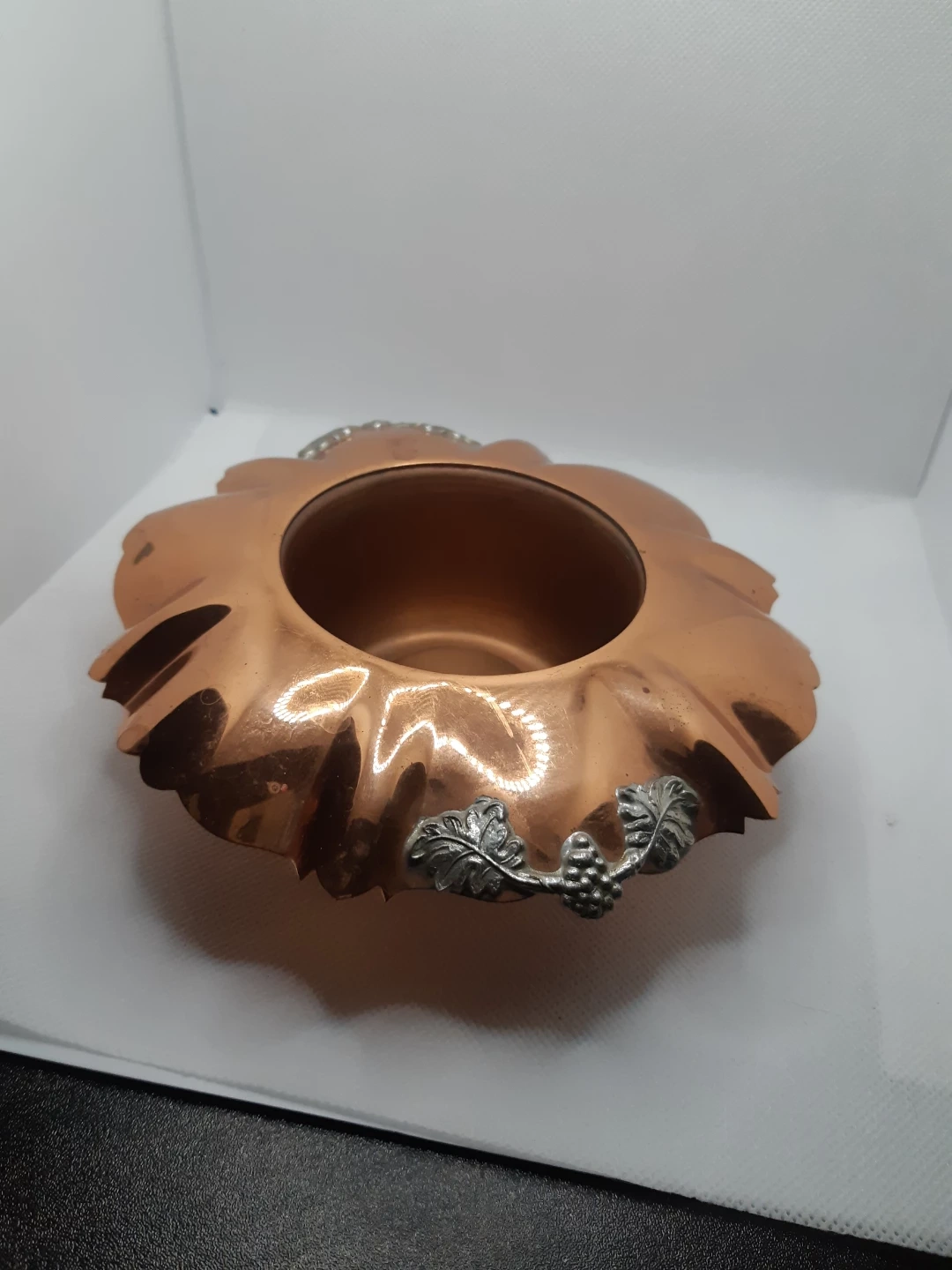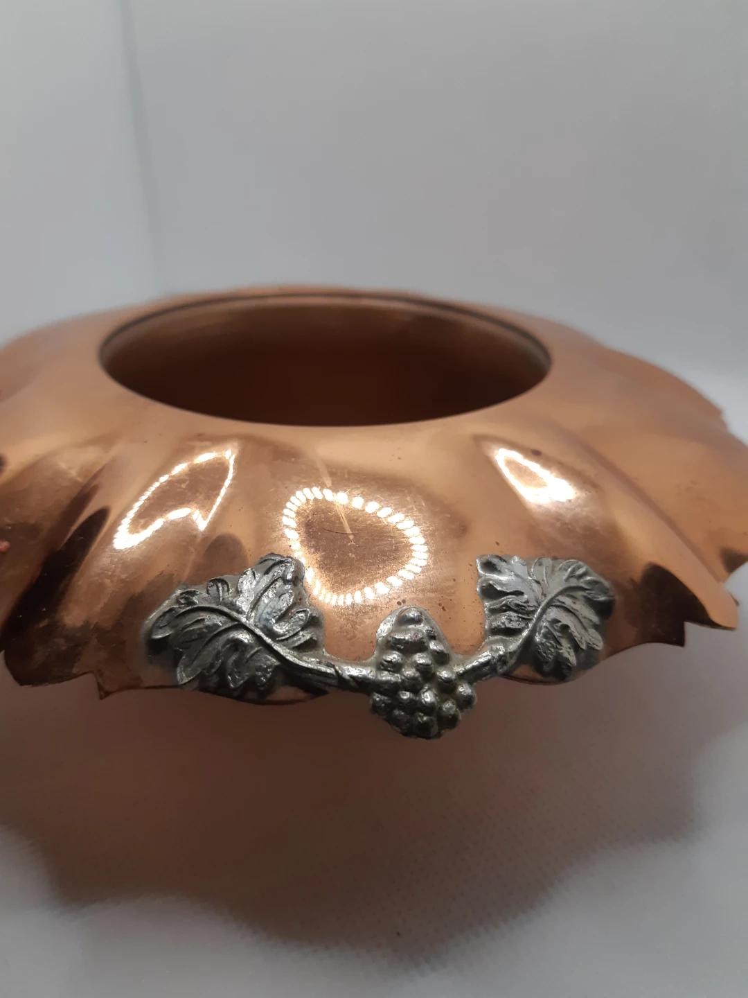 Vintage Gregorian hammered copper bowl with a ruffled edge and grape-and-leaf silver-tone accents.