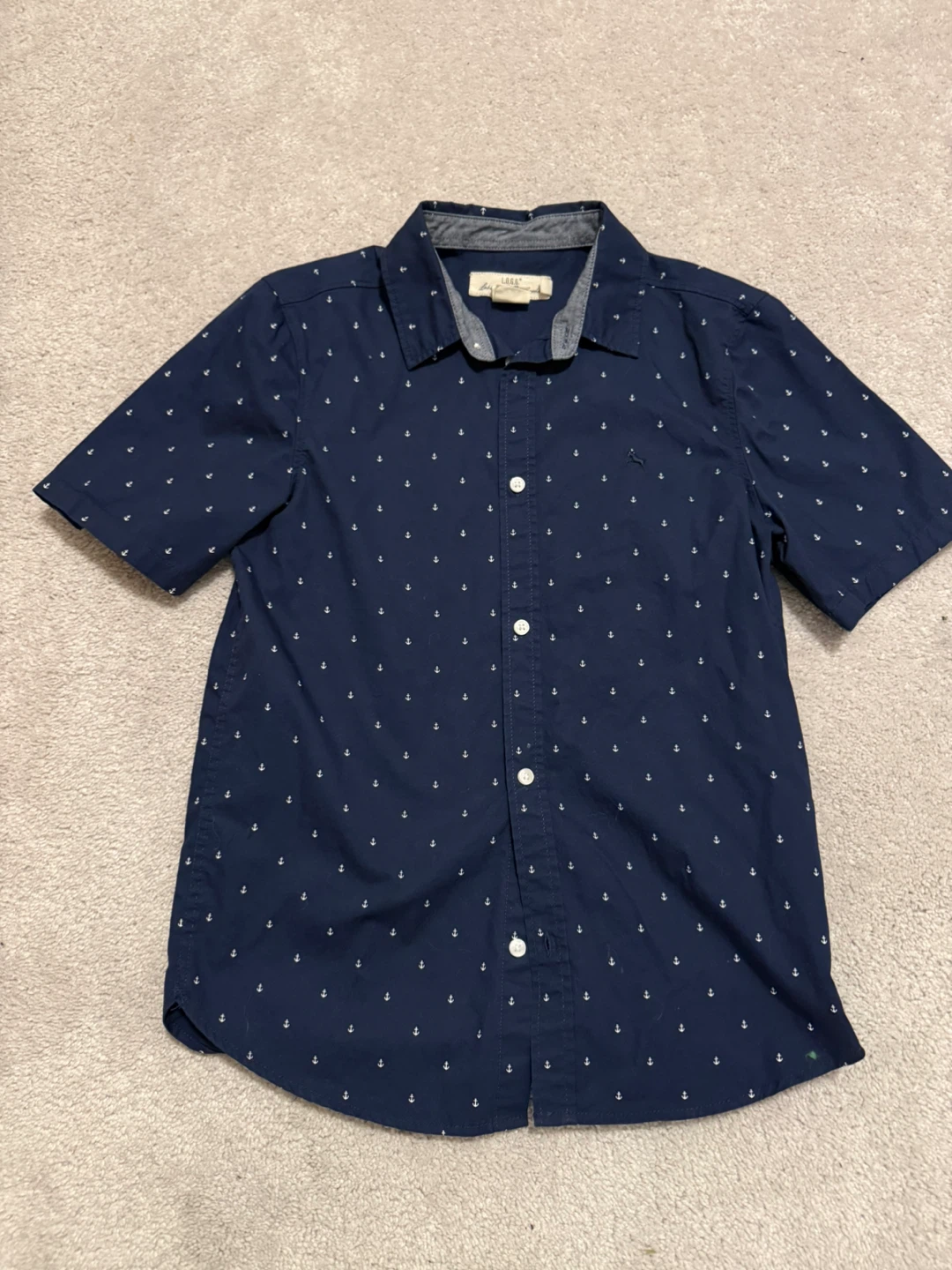 Boys' short sleeve shirt from L&O. It's a navy blue colour with a white anchor pattern. In great condition! Size 10/11