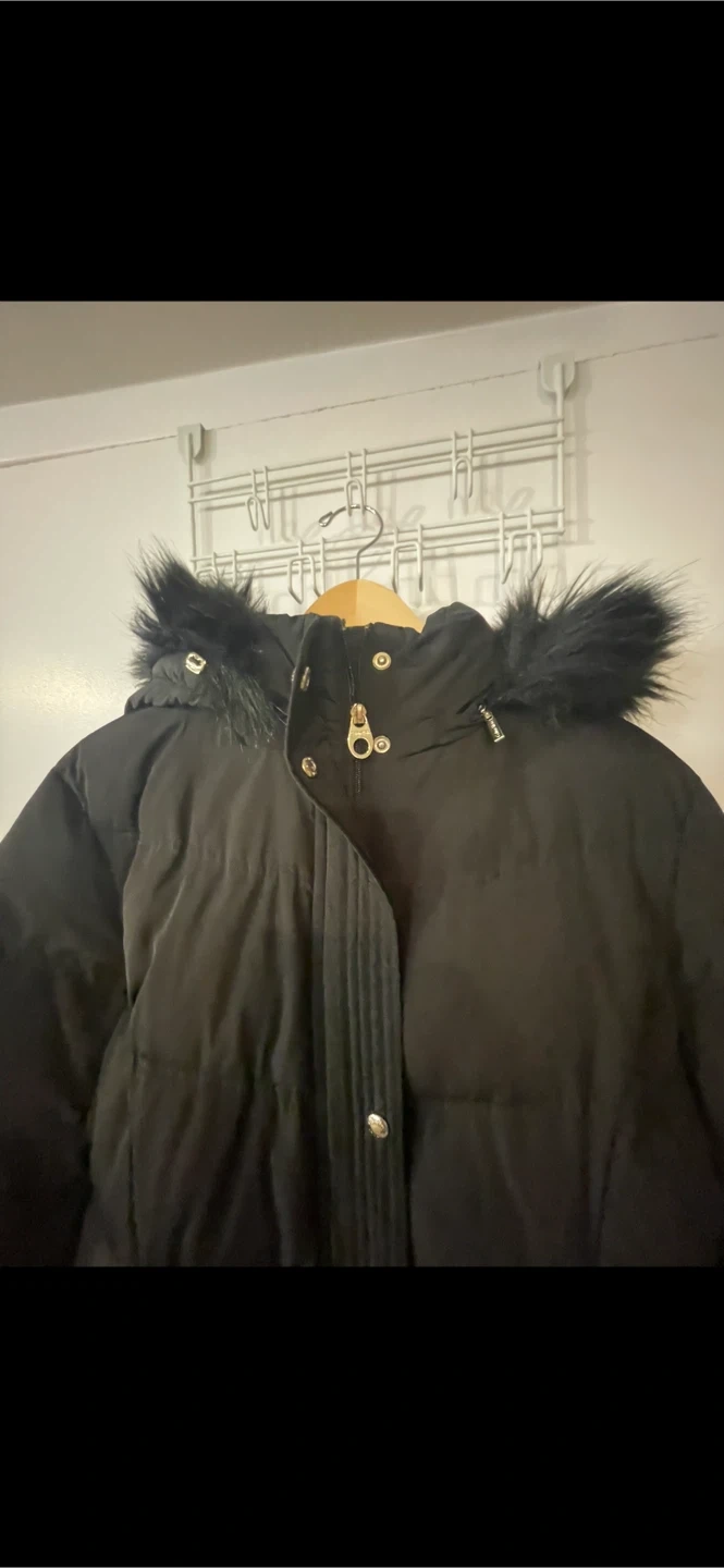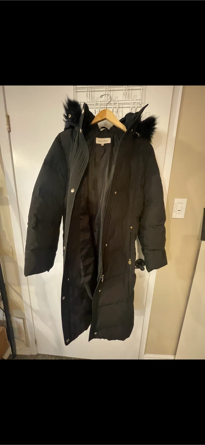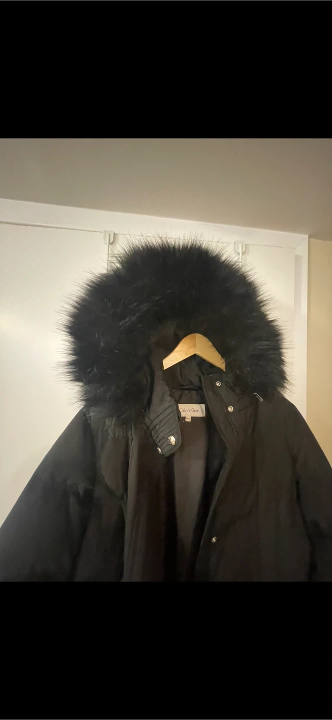 Selling a Calvin Klein black winter coat. It's in great condition and perfect for the cold weather! The coat features a faux fur hood, a zipper, and button closure. It also has pockets with zippers.