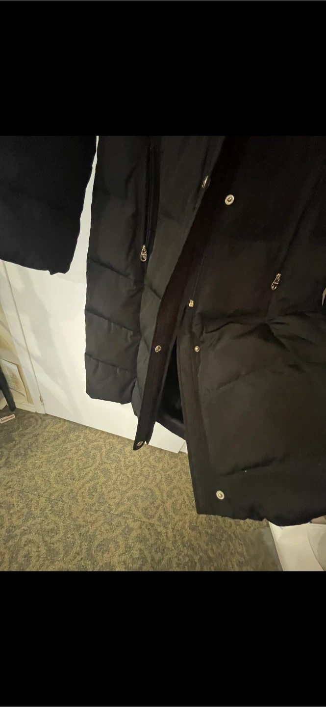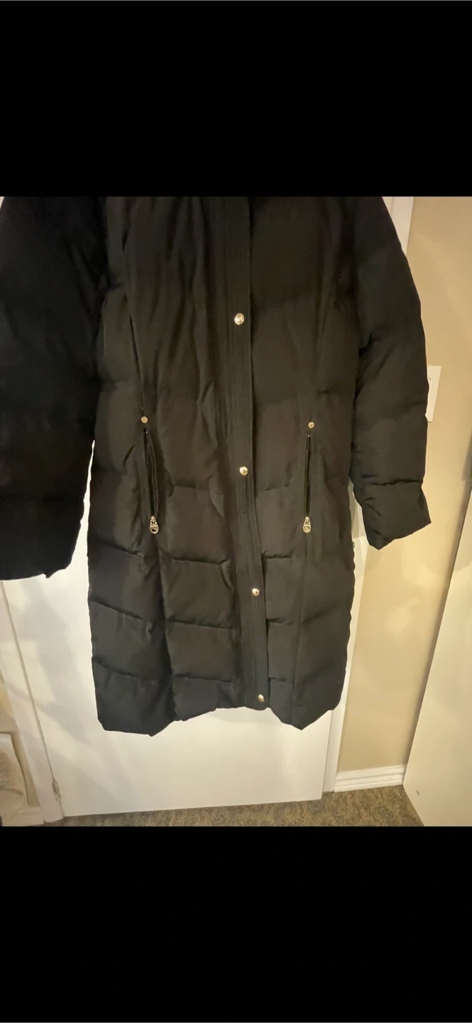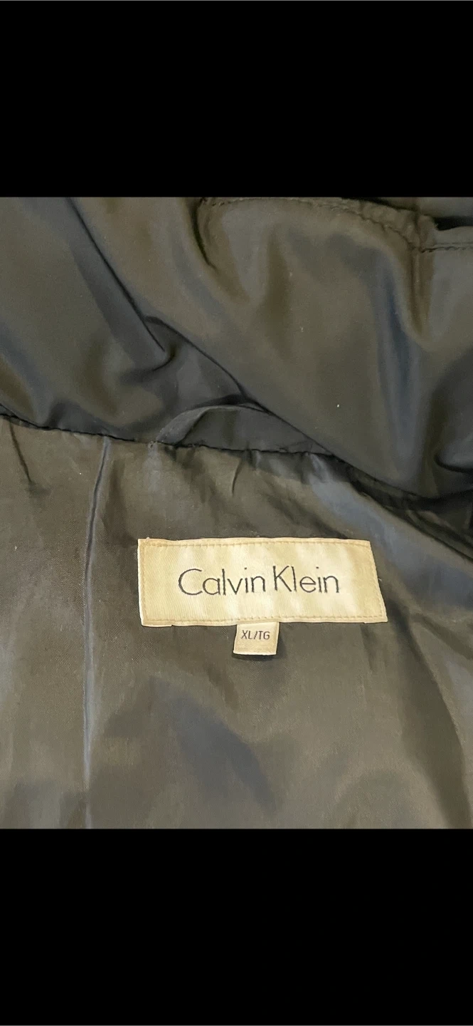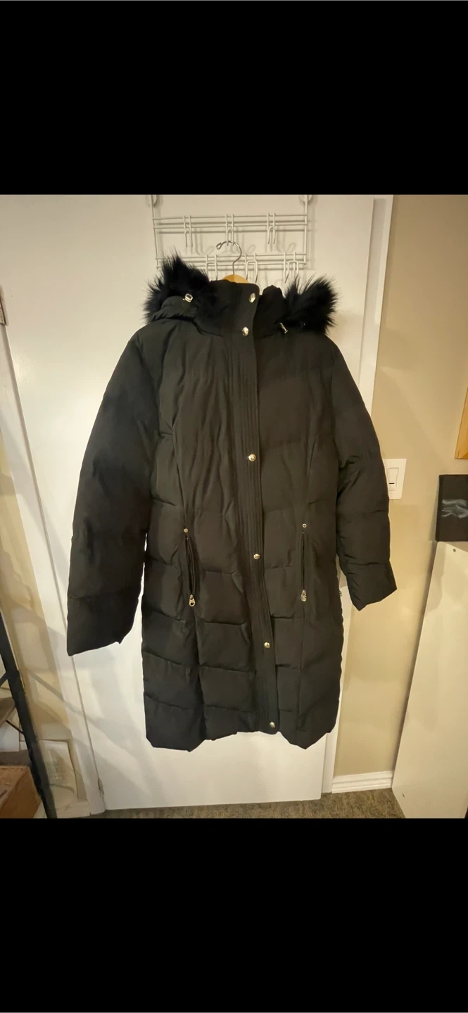 Selling a Calvin Klein black winter coat. It's in great condition and perfect for the cold weather! The coat features a faux fur hood, a zipper, and button closure. It also has pockets with zippers.