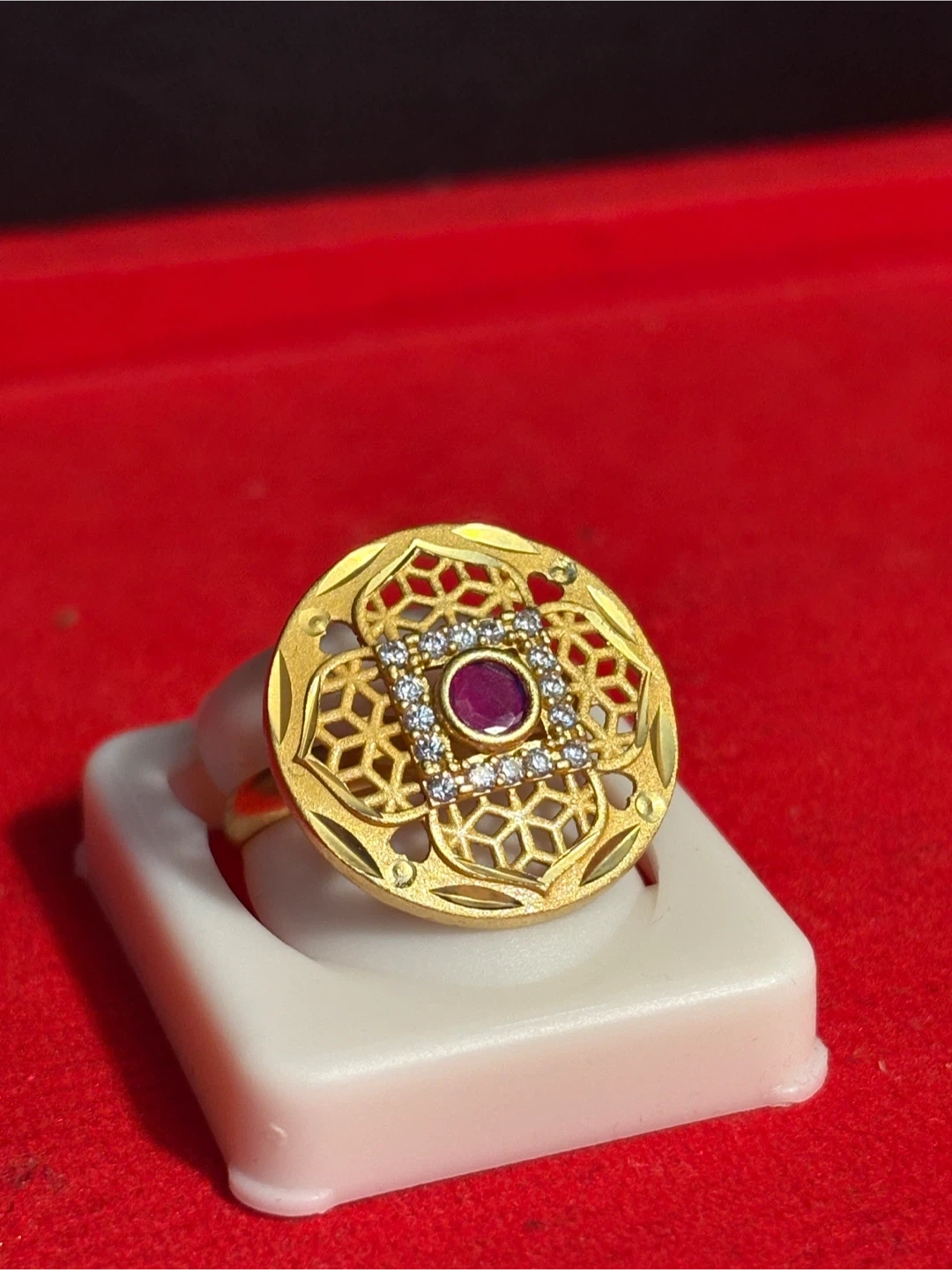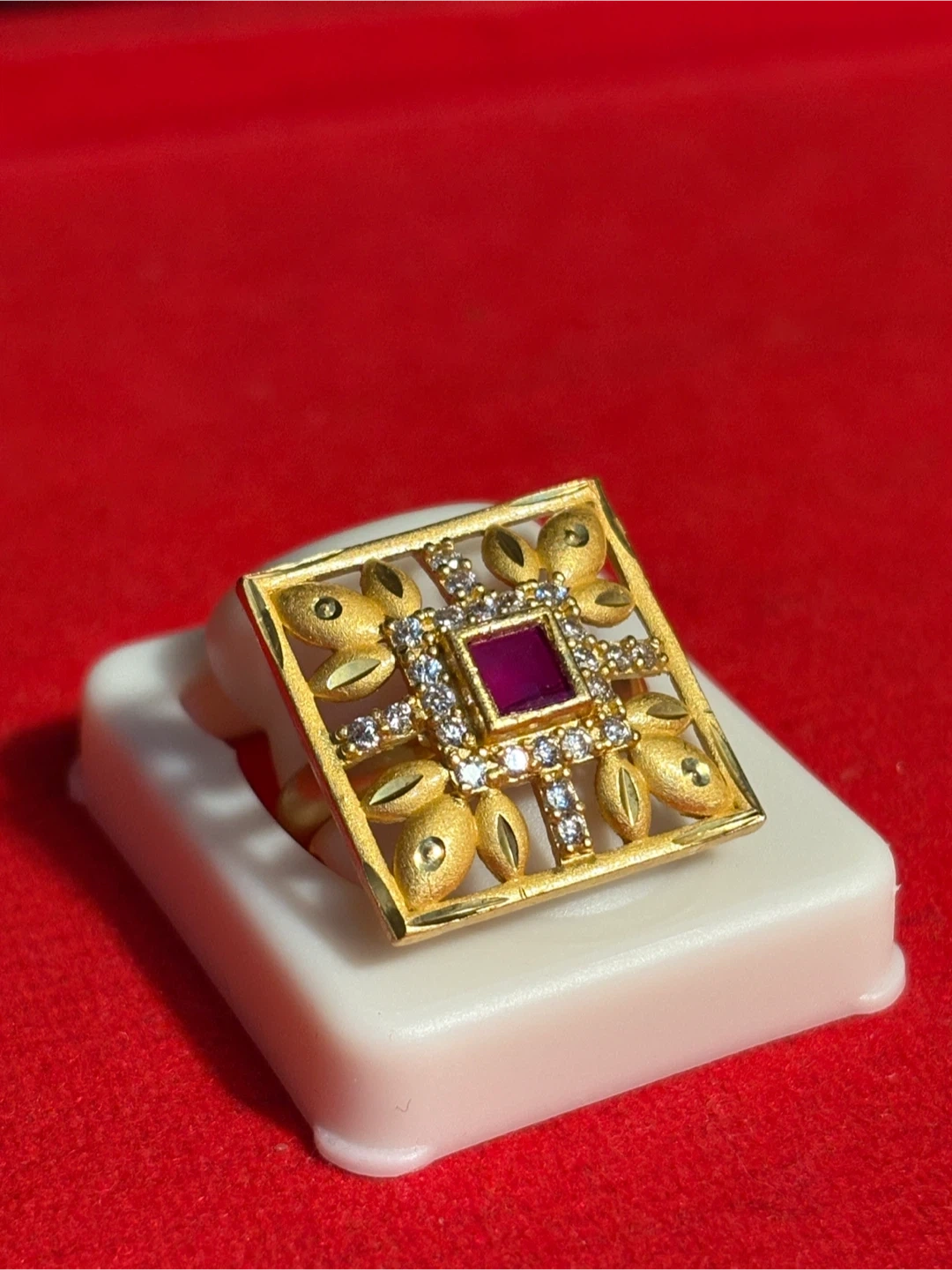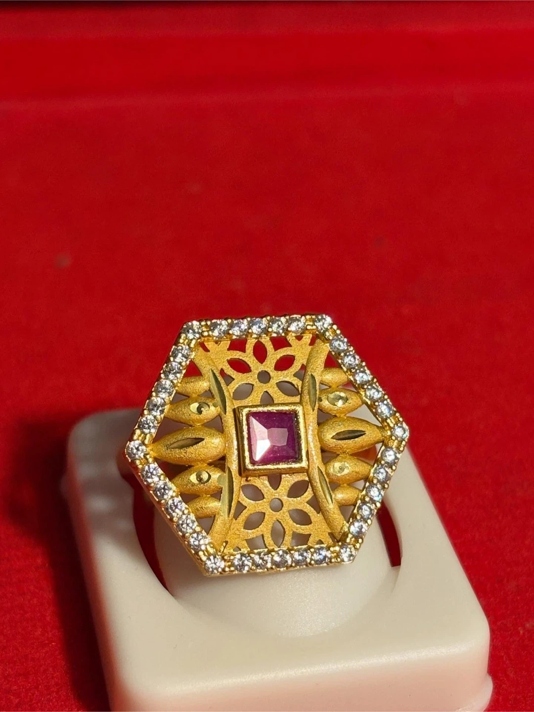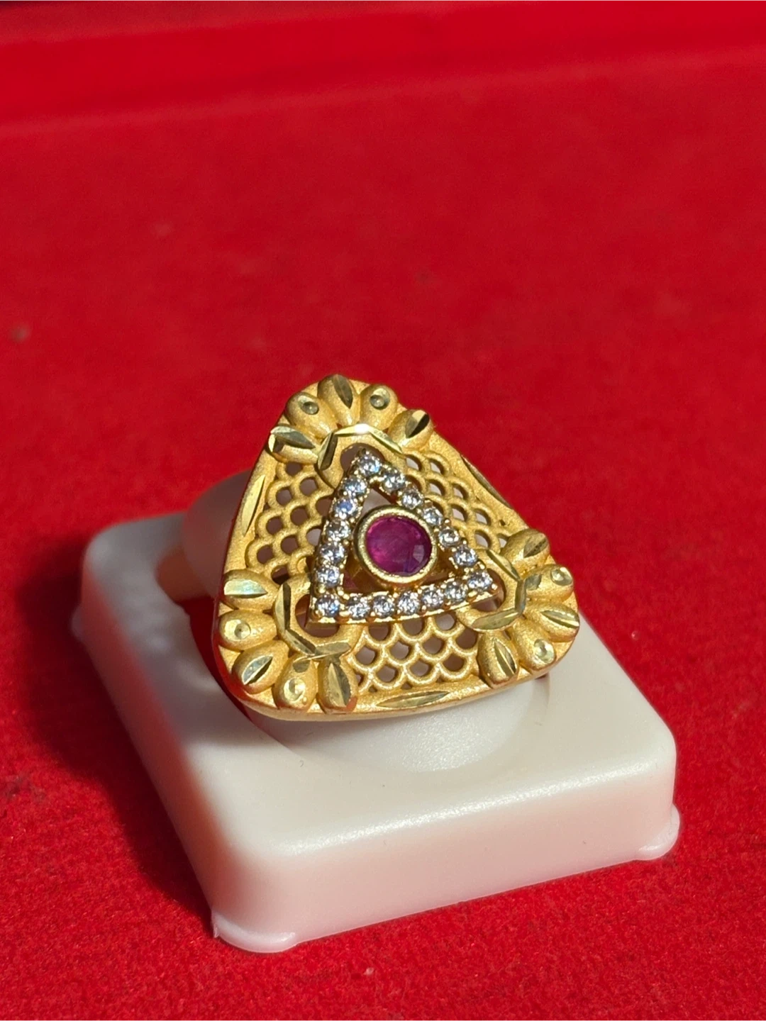 Selling a beautiful gold ring featuring a ruby and diamond accents. It has a unique design and is in great condition. Perfect as a gift or for yourself!