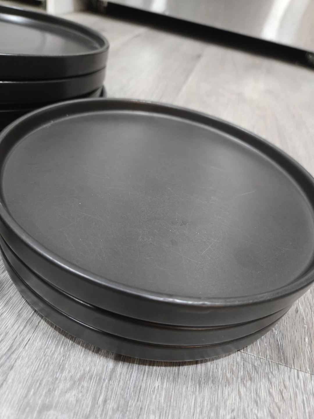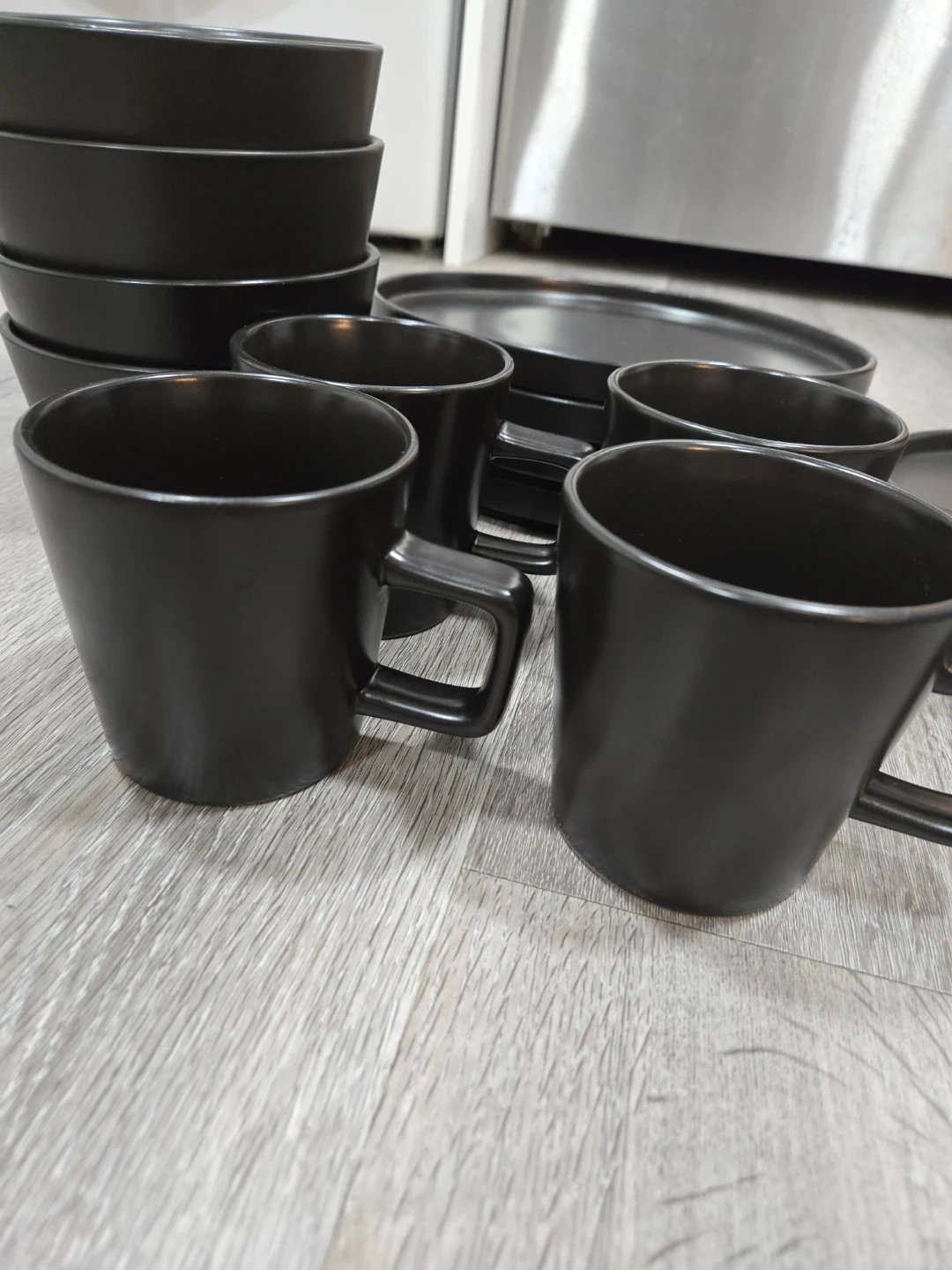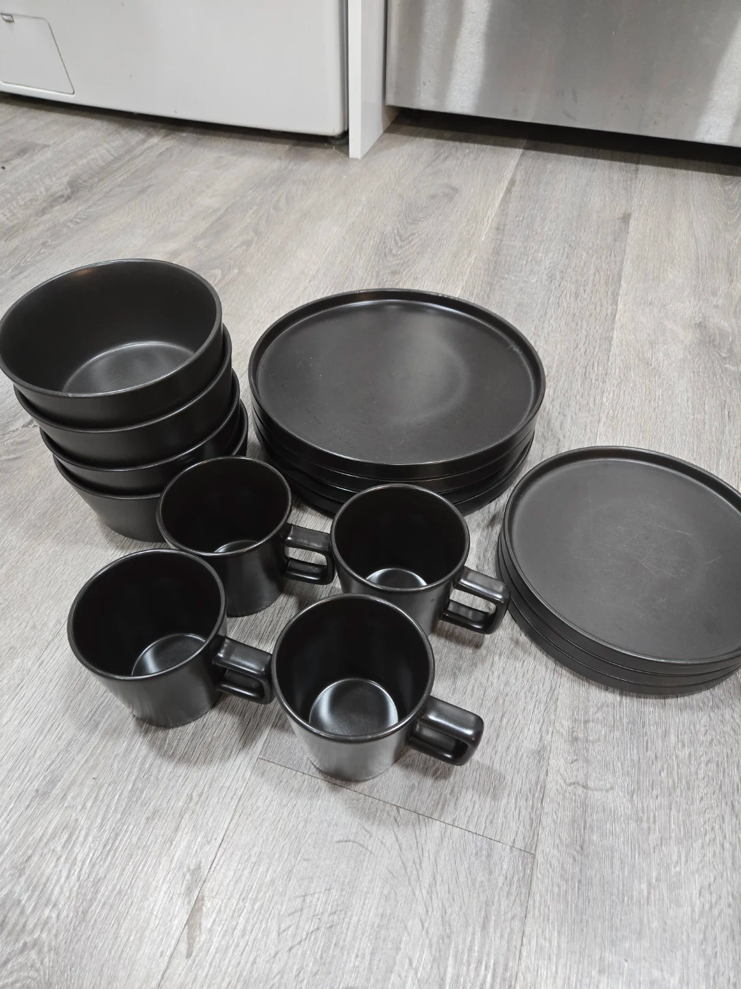 Free dinnerware set in black. This set includes plates, bowls, and mugs, perfect for setting a modern table. They have some signs of use but are still in good condition!