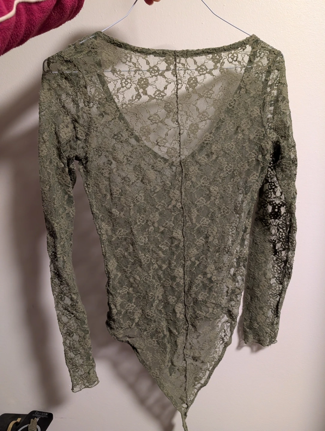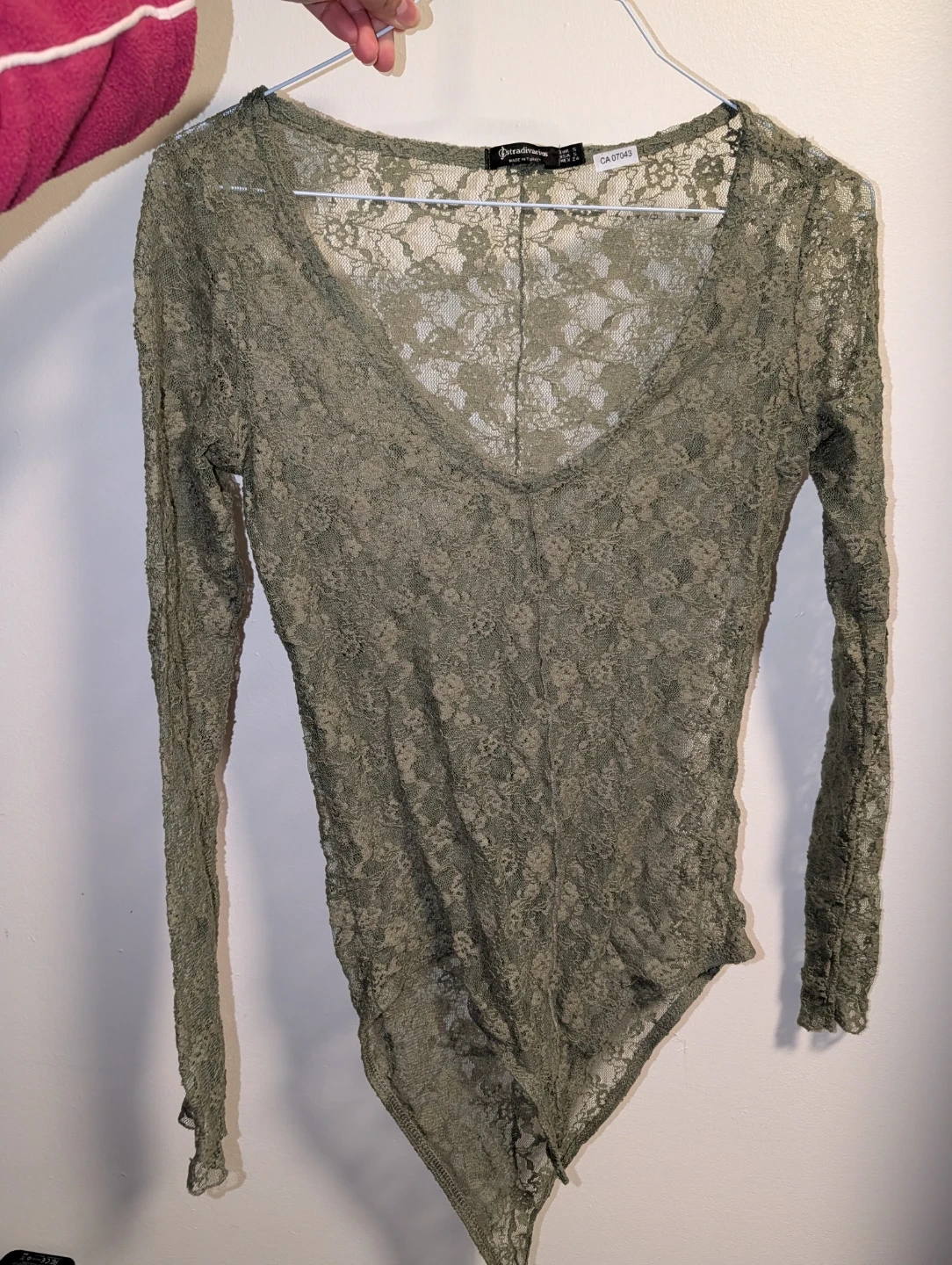 Here's a cute olive green lace bodysuit from Stradivarius! It's a size small and in great condition. Perfect for layering or wearing on its own.
