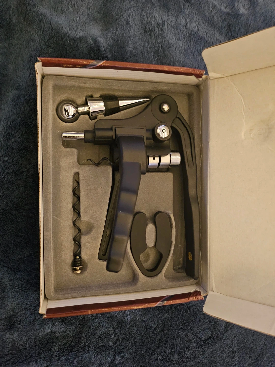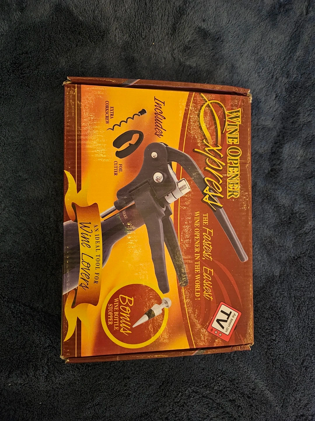 Wine Opener Express corkscrew set, complete with foil cutter, extra corkscrew and bonus wine bottle stopper! Box is included