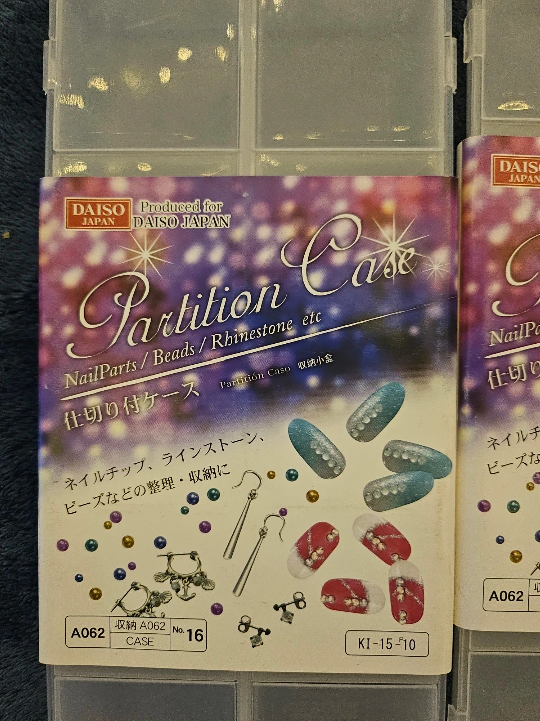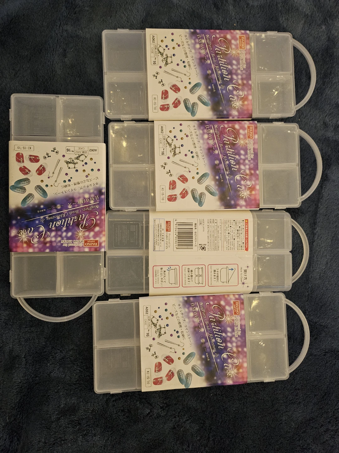 Selling five Daiso partition cases, perfect for organizing nail parts, beads, and rhinestones! They are designed to stack easily and have rounded corners for safety. Each case is size A062 and measures approximately 250 x 105 x 24 mm