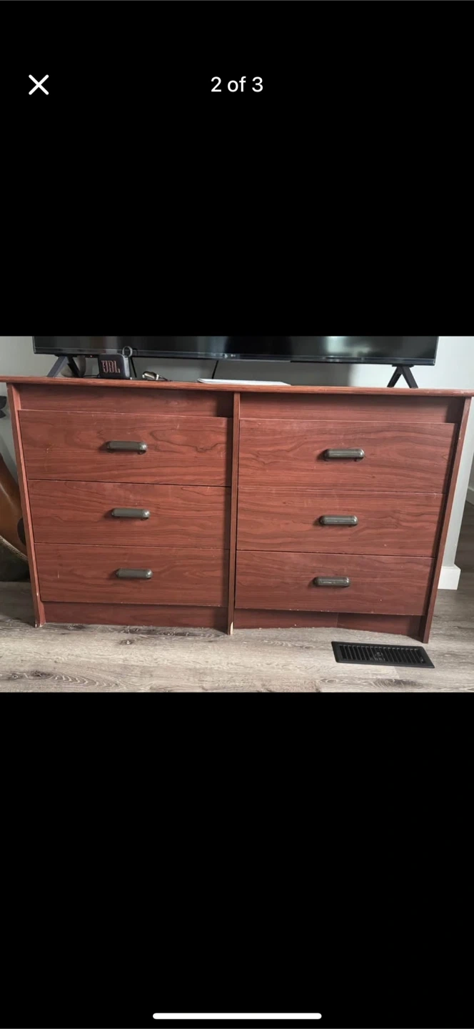 Selling a wooden dresser with a mirror. It has a warm, reddish-brown finish and plenty of drawer space for storage. Great for a bedroom or dressing area!