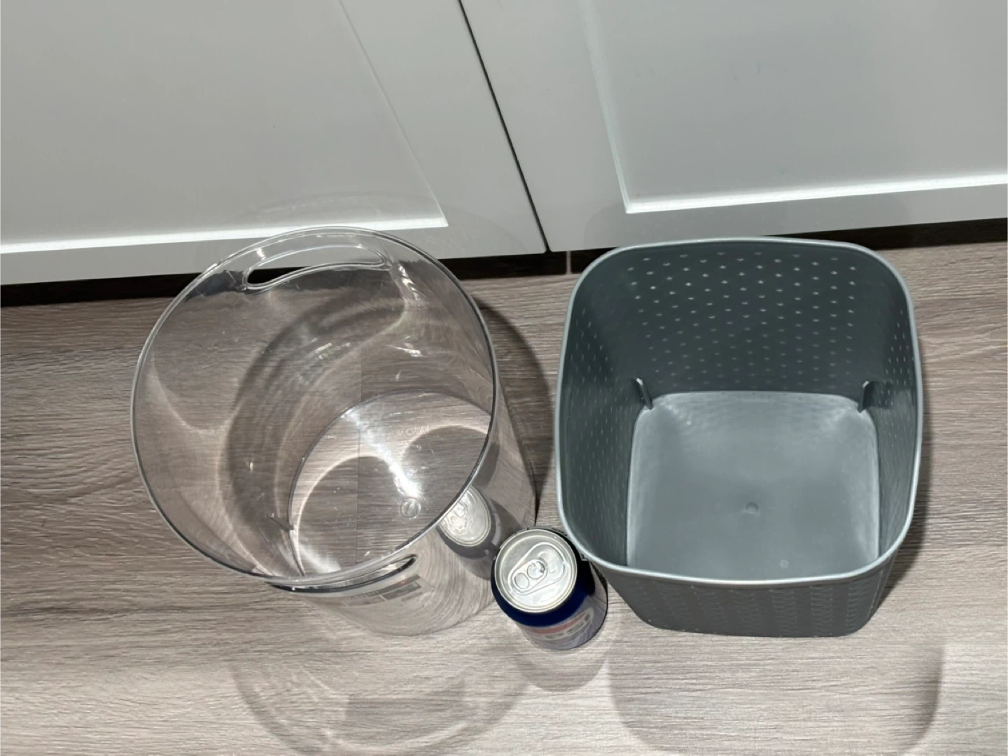 Two garbage bins or trash bins . Great size for bedrooms , offices and bathrooms . A clear plastic bucket and a grey woven basket.