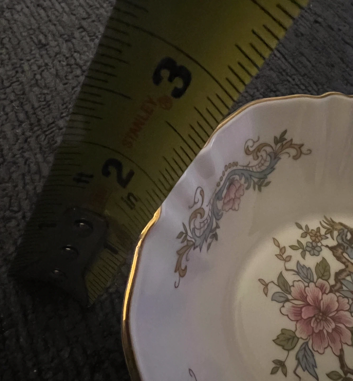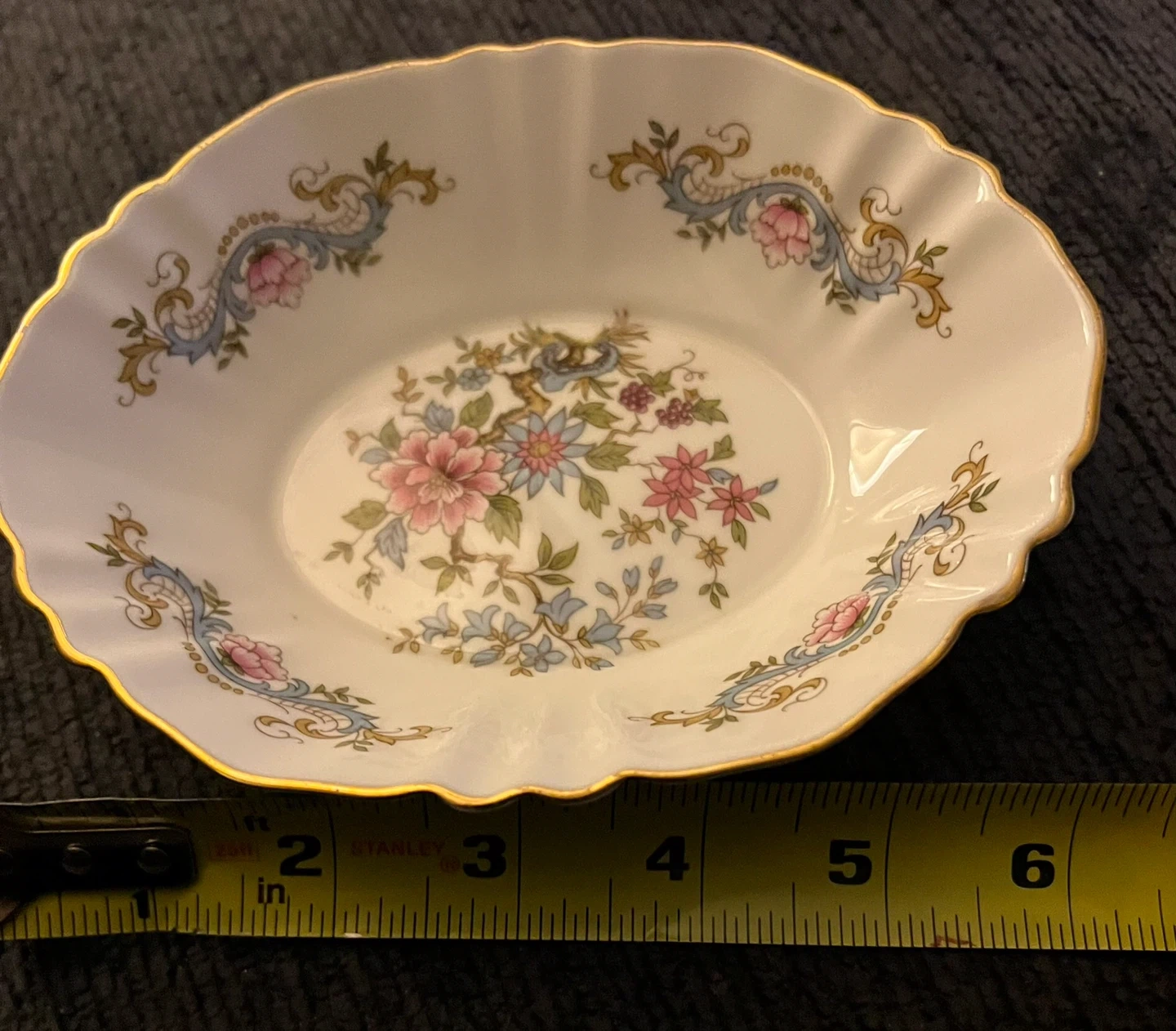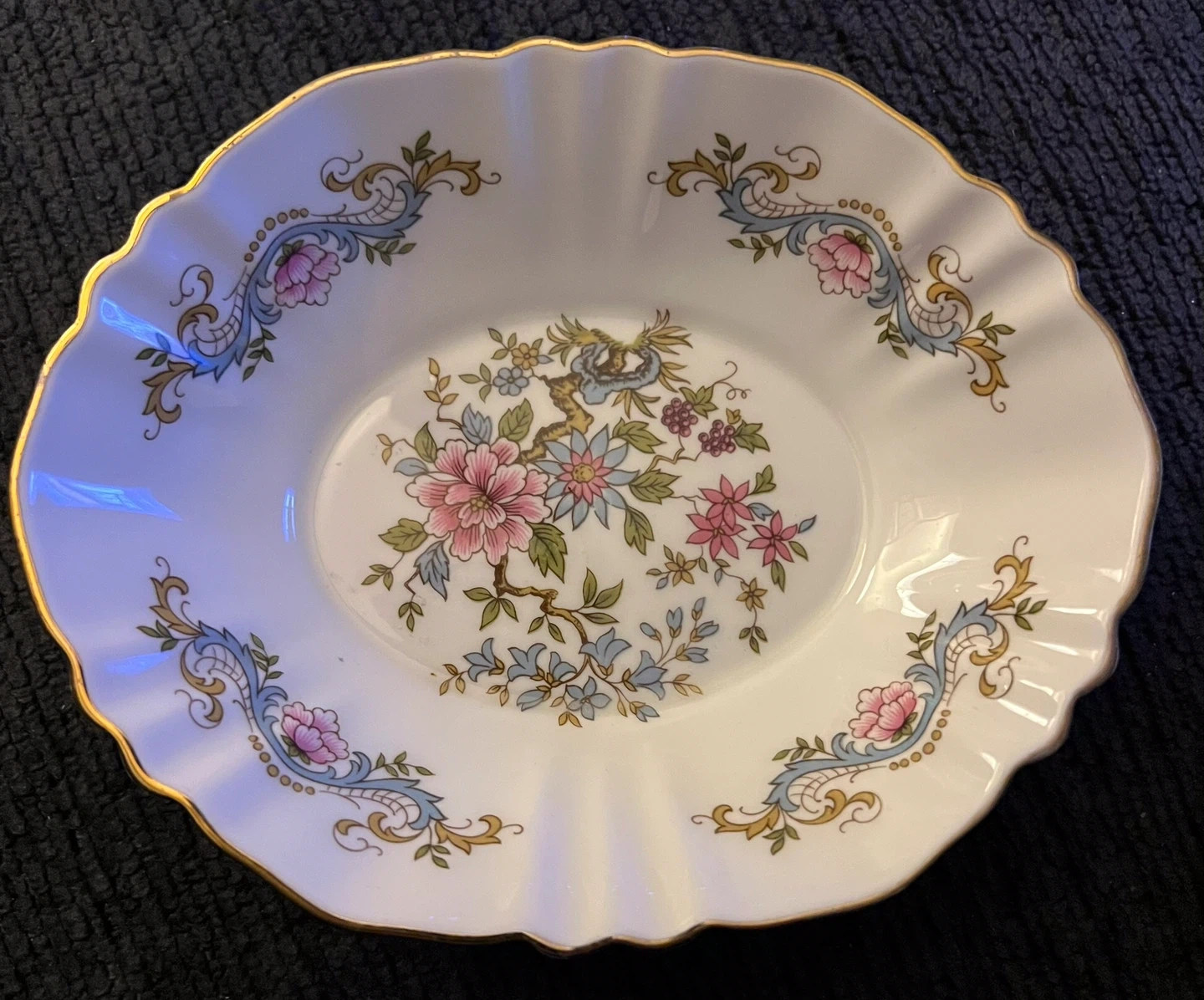 Selling a lovely vintage Paragon fine bone china trinket dish! The dish features a beautiful floral design with pink floral and blue and tan accents, and a gold scalloped rim. It measures approximately 6 inches in diameter. Perfect for adding a touch of elegance to your home! PAR164 by Paragon. Discontinued 1960 at the latest. (Acquired by Royal Albert then by Royal Doulton)