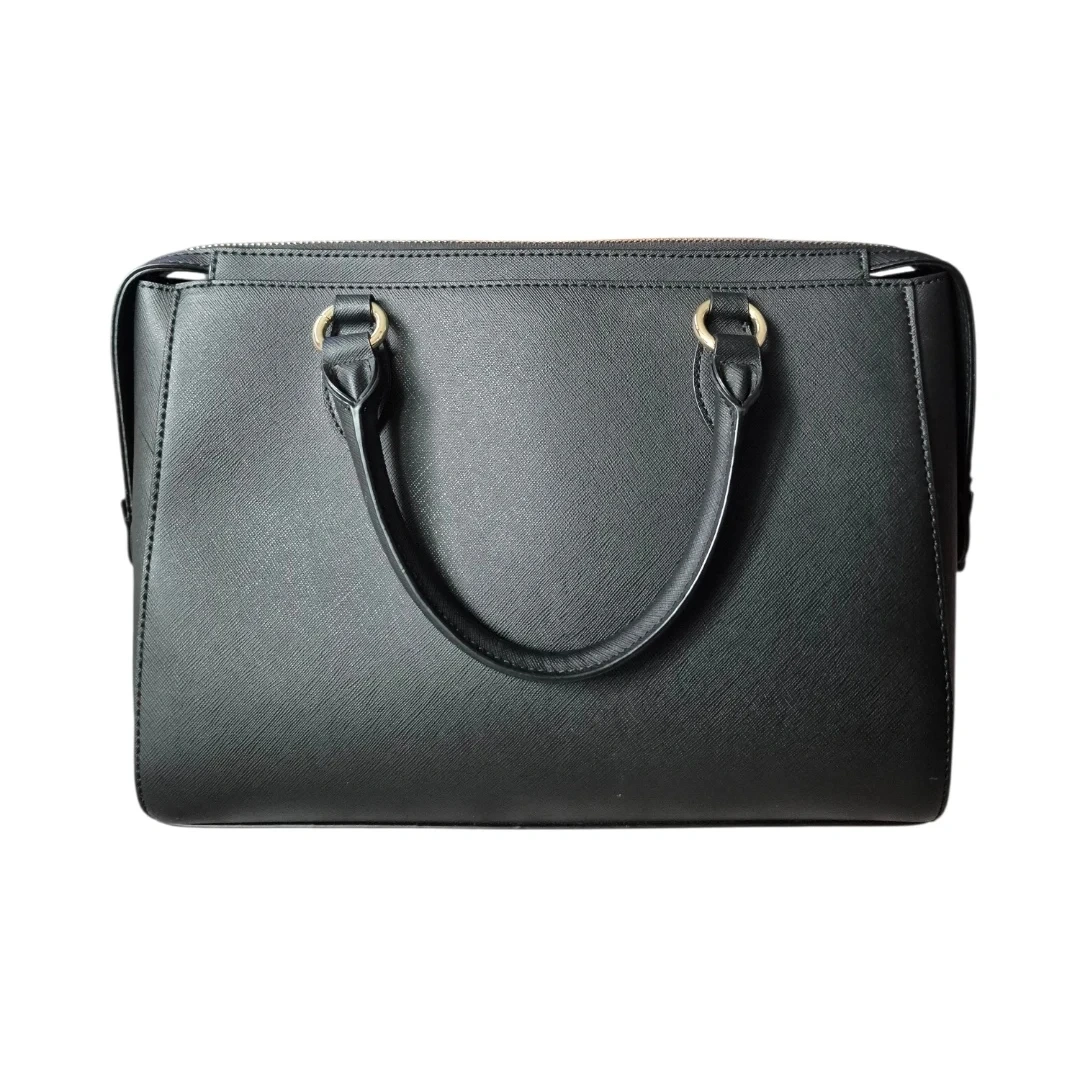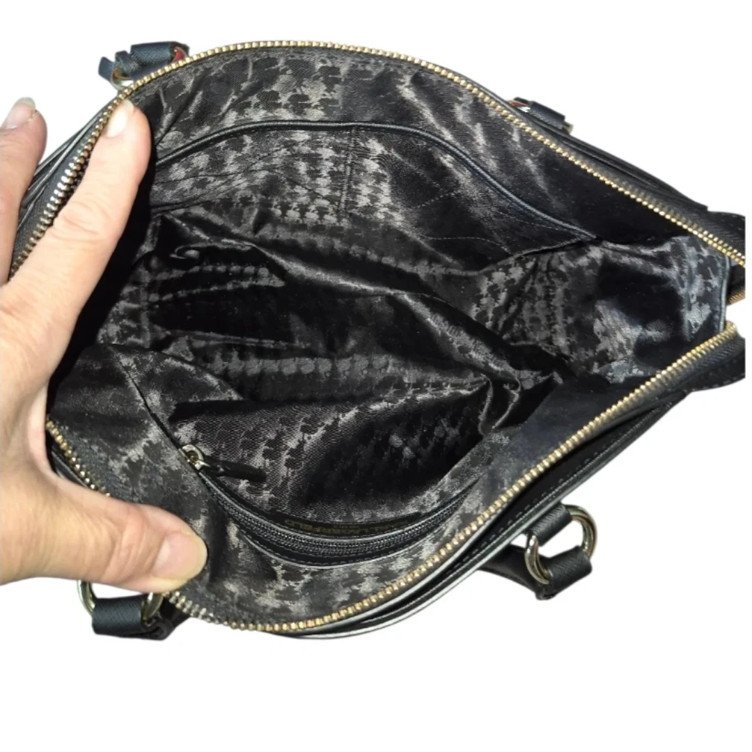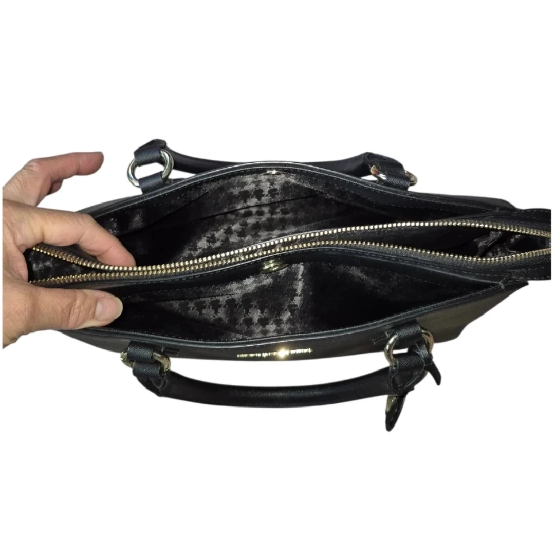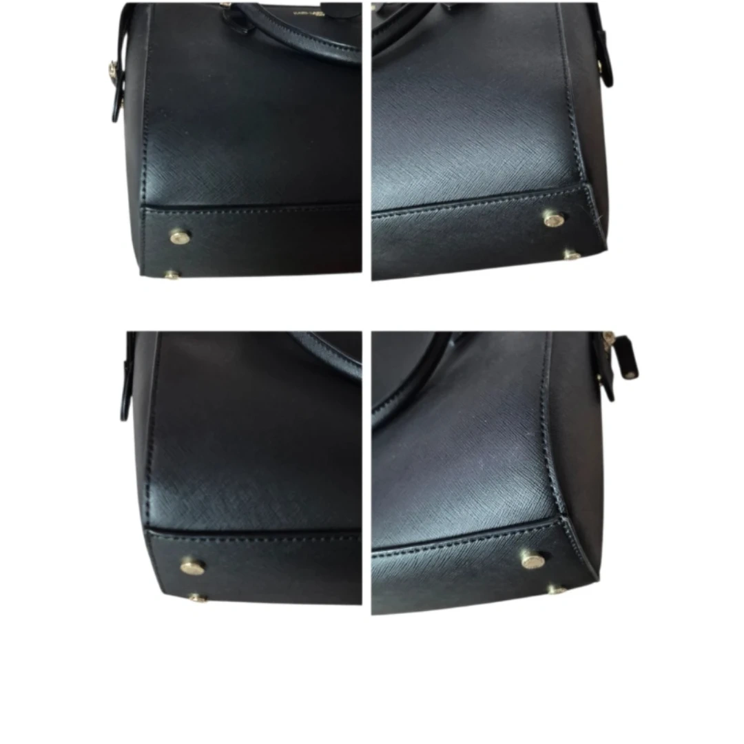 Features: 3 separated pocket compartments. Inner divider zip compartment. Zip wall pocket side 2 slip pockets. Double leather handles. Gold tone raised logo. Hang charm. Bottom footings. Faux Saffiano Leather.