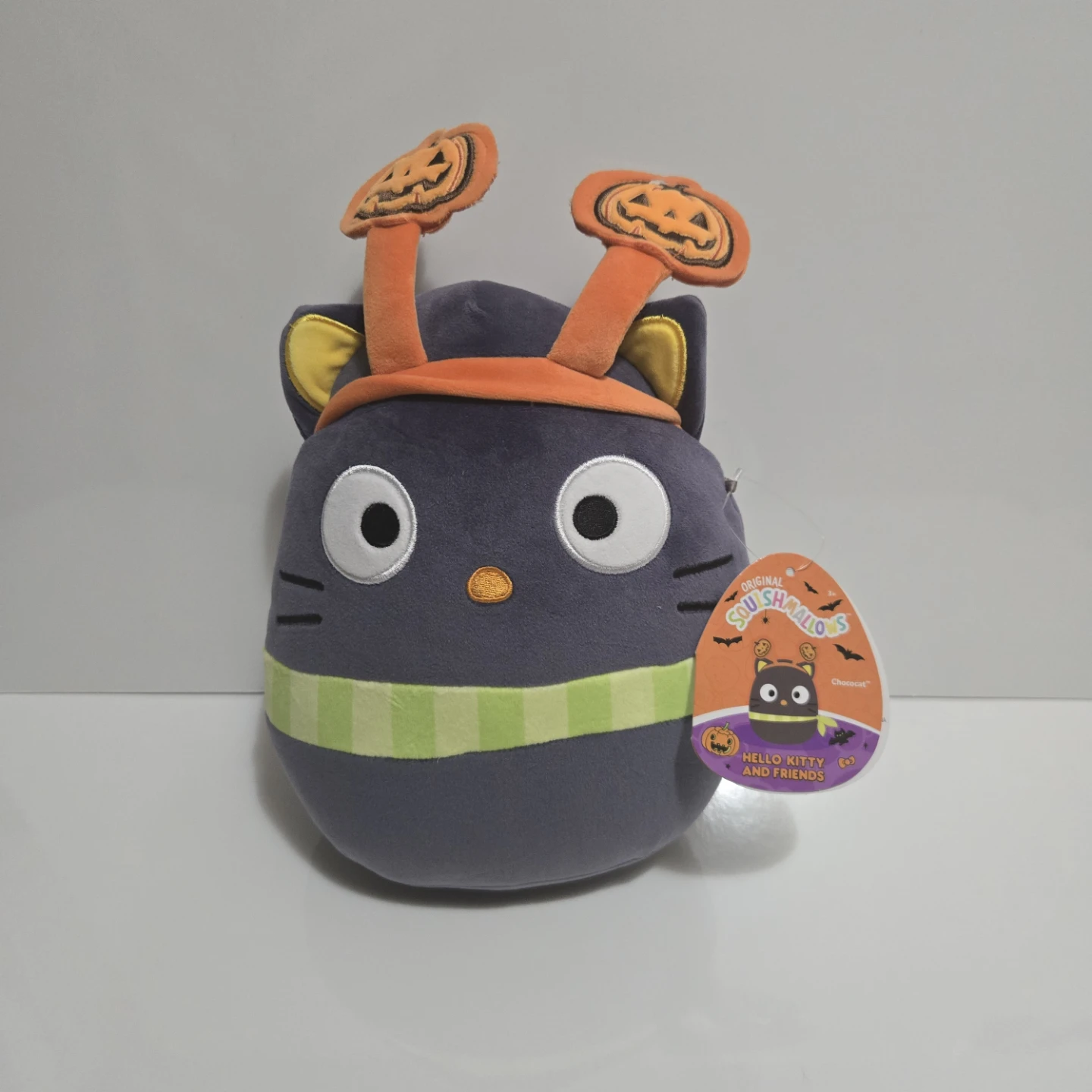 Selling a super cute Squishmallows Hello Kitty and Friends Chococat plush! This one has a Halloween theme, complete with little pumpkin ears.