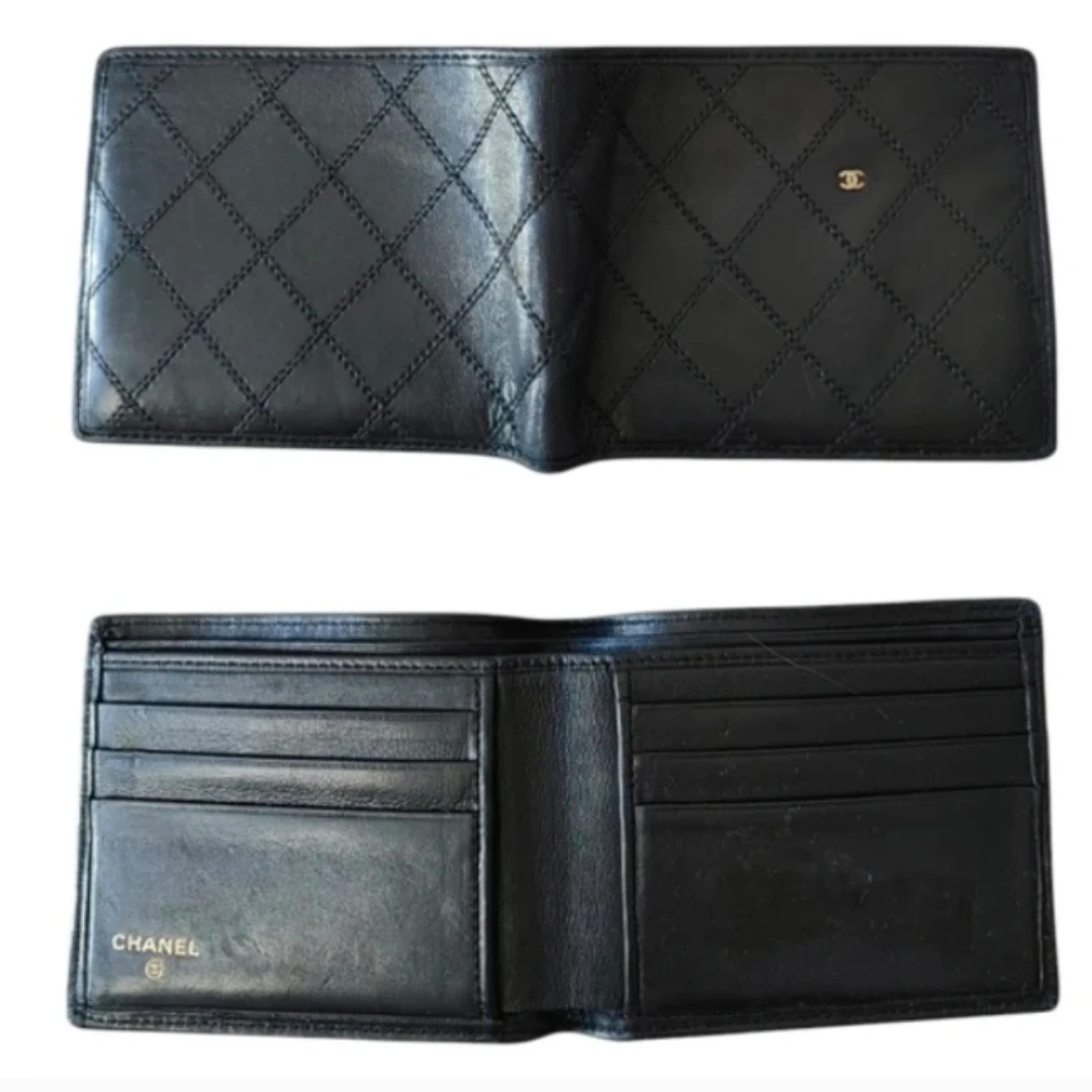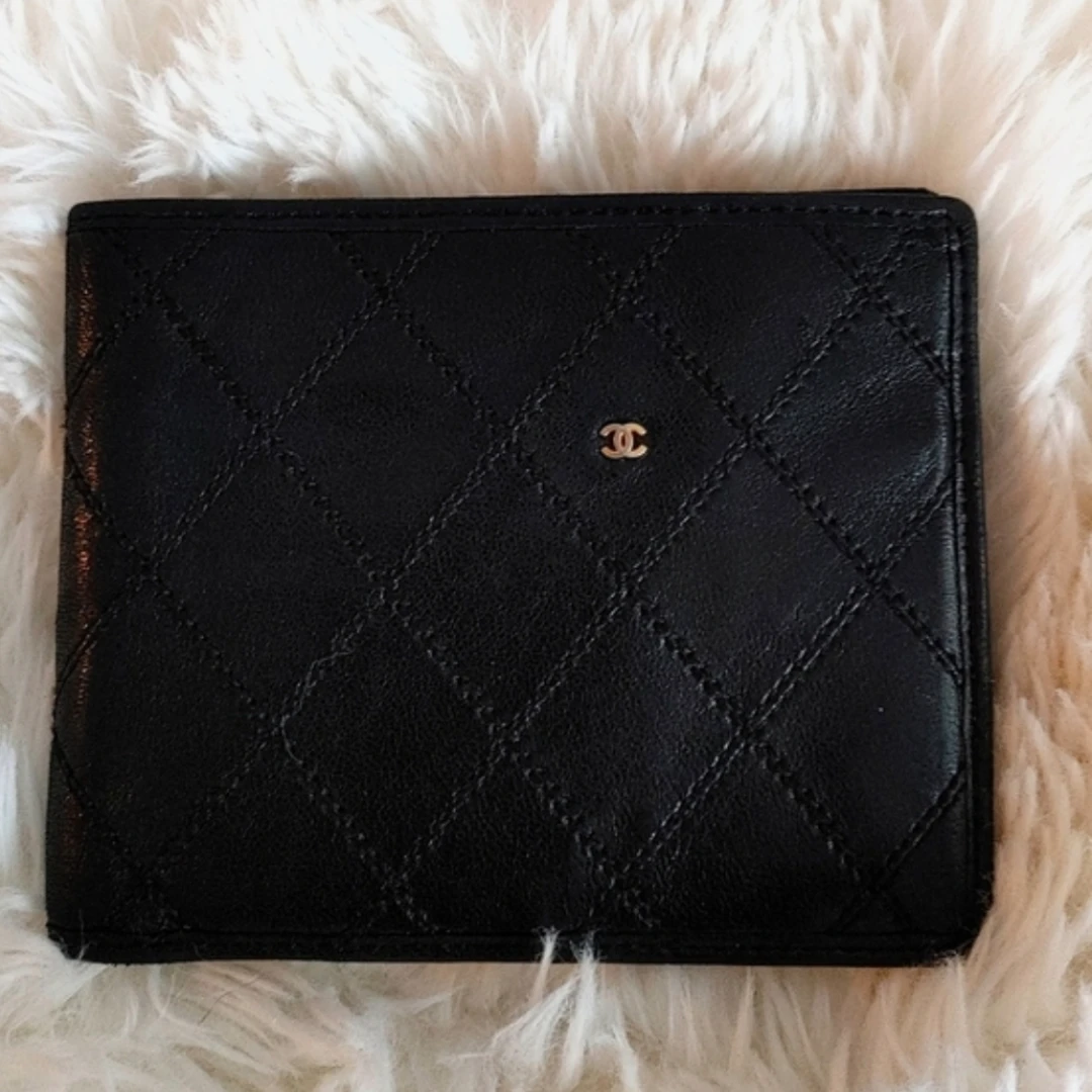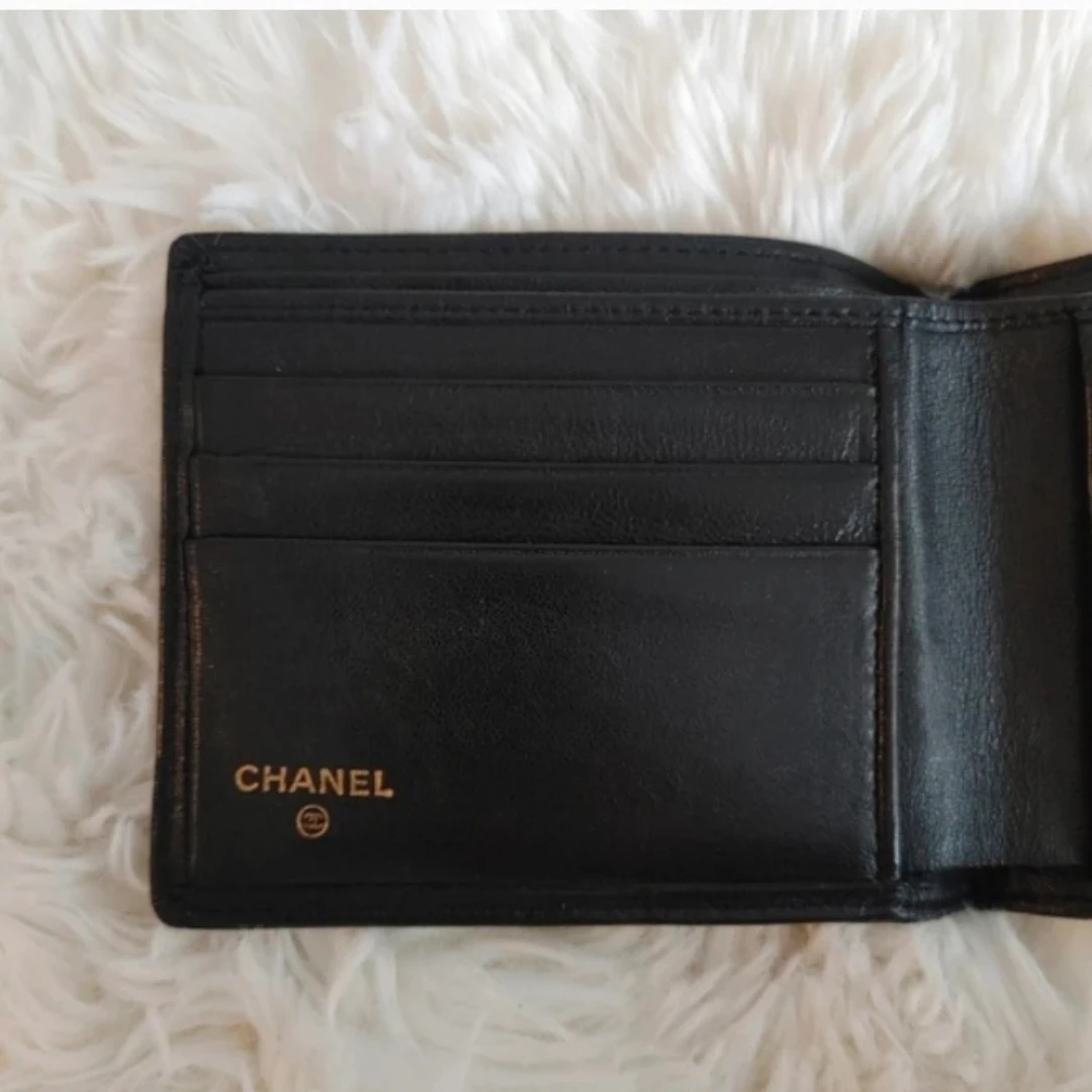 Authentic Chanel Timeless Diamond Black Lambskin Leather Bifold Wallet.