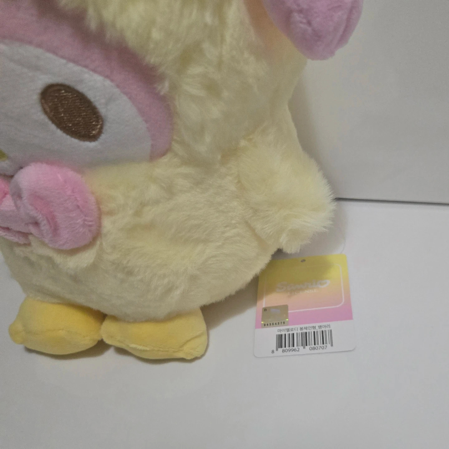 This is a super cute Sanrio My Melody plush! It's yellow and features My Melody dressed as a chick. Giftable