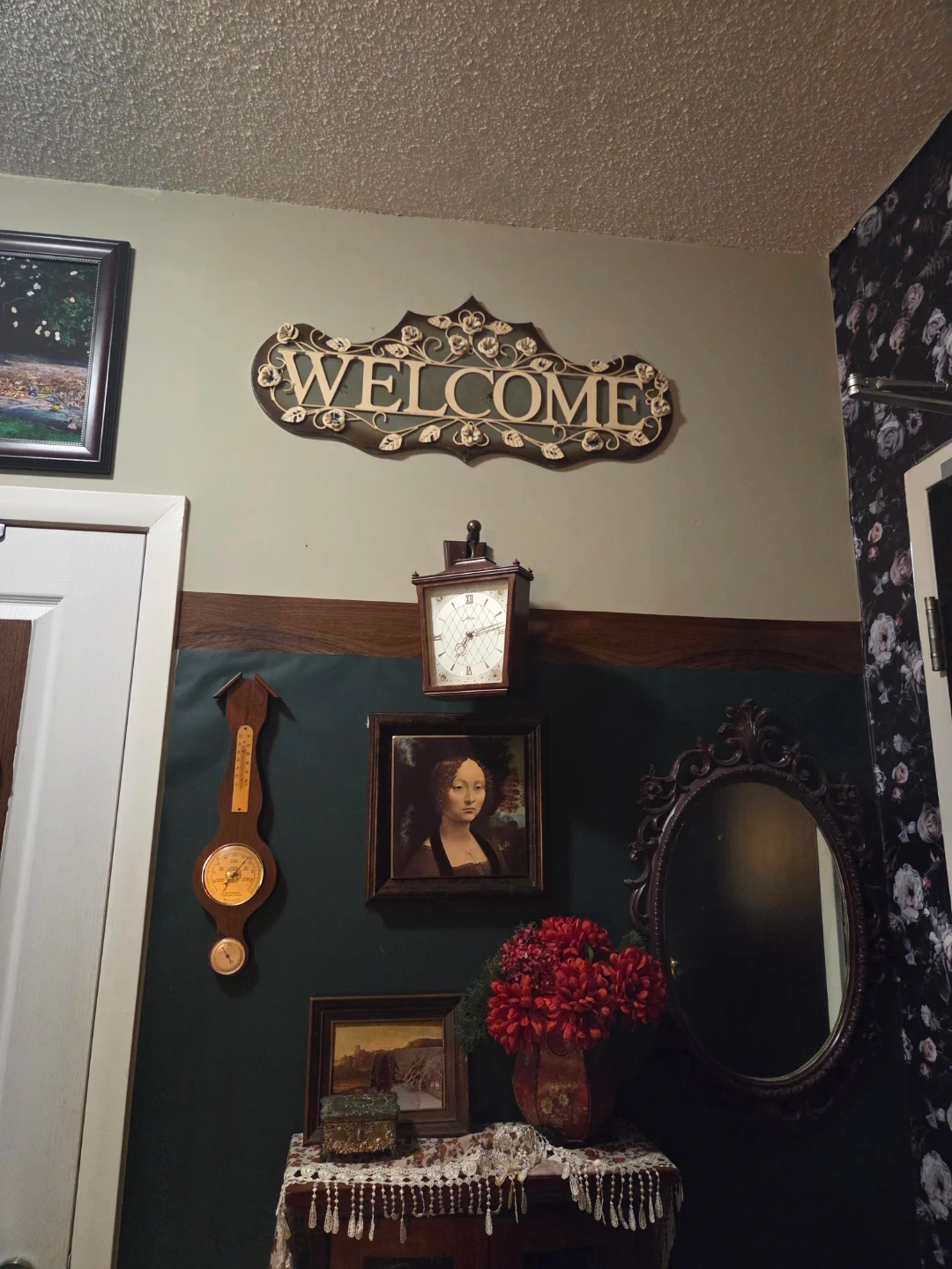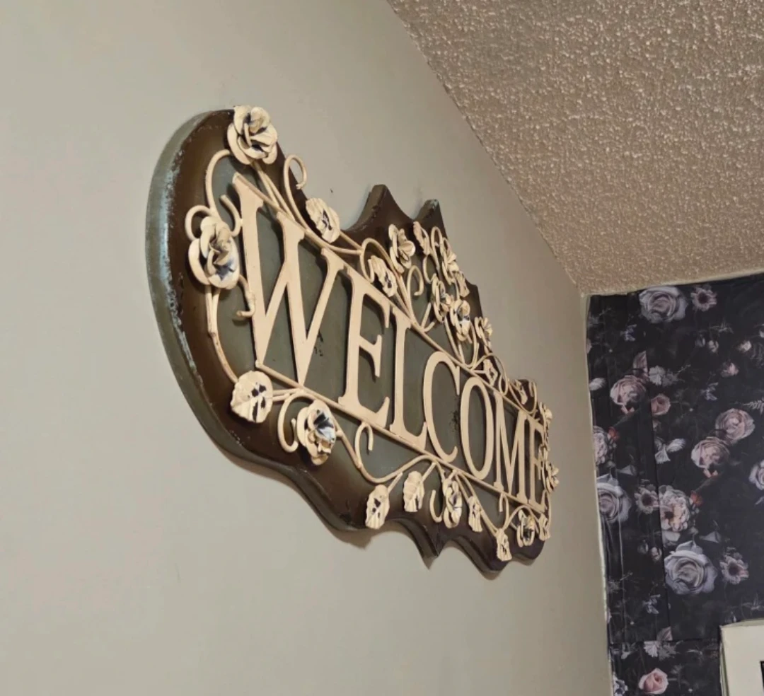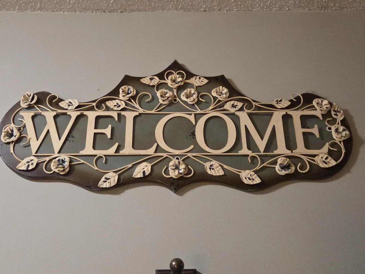 This is a decorative "Welcome" sign for your wall. It has a rustic, floral design that would look great in an entryway or living room. It's in good condition and ready to add a touch of charm to your home