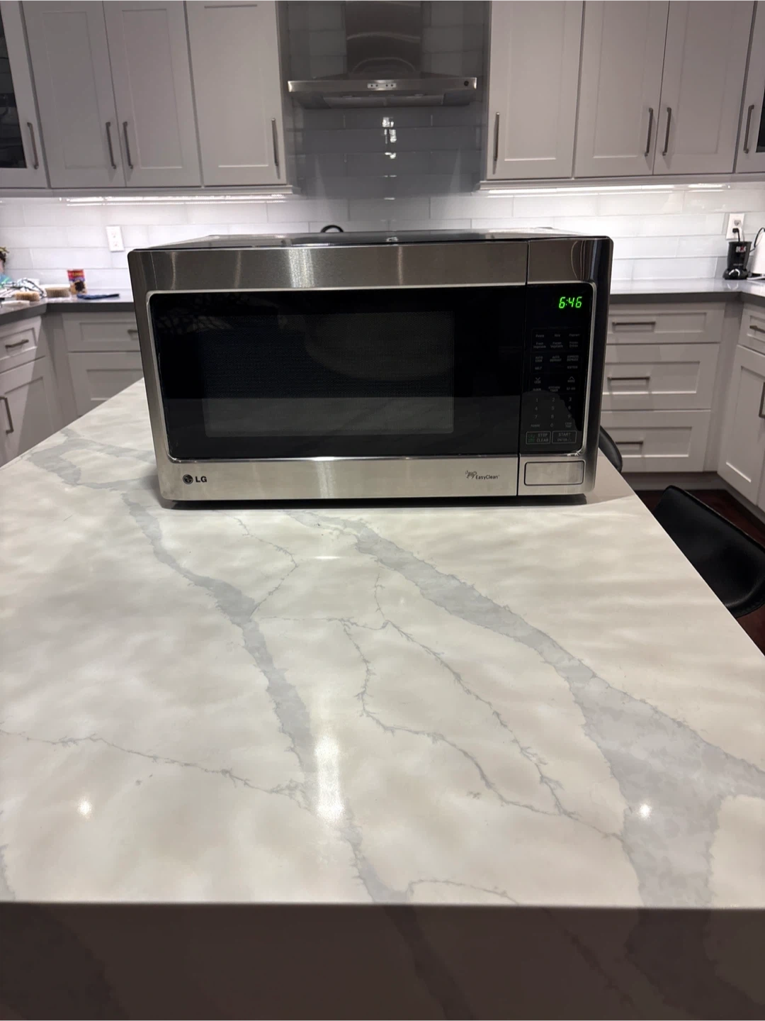 Selling an LG microwave in stainless steel finish. Good condition. Just 1 inch to wide after kitchen renovation Small chip on glass plate.