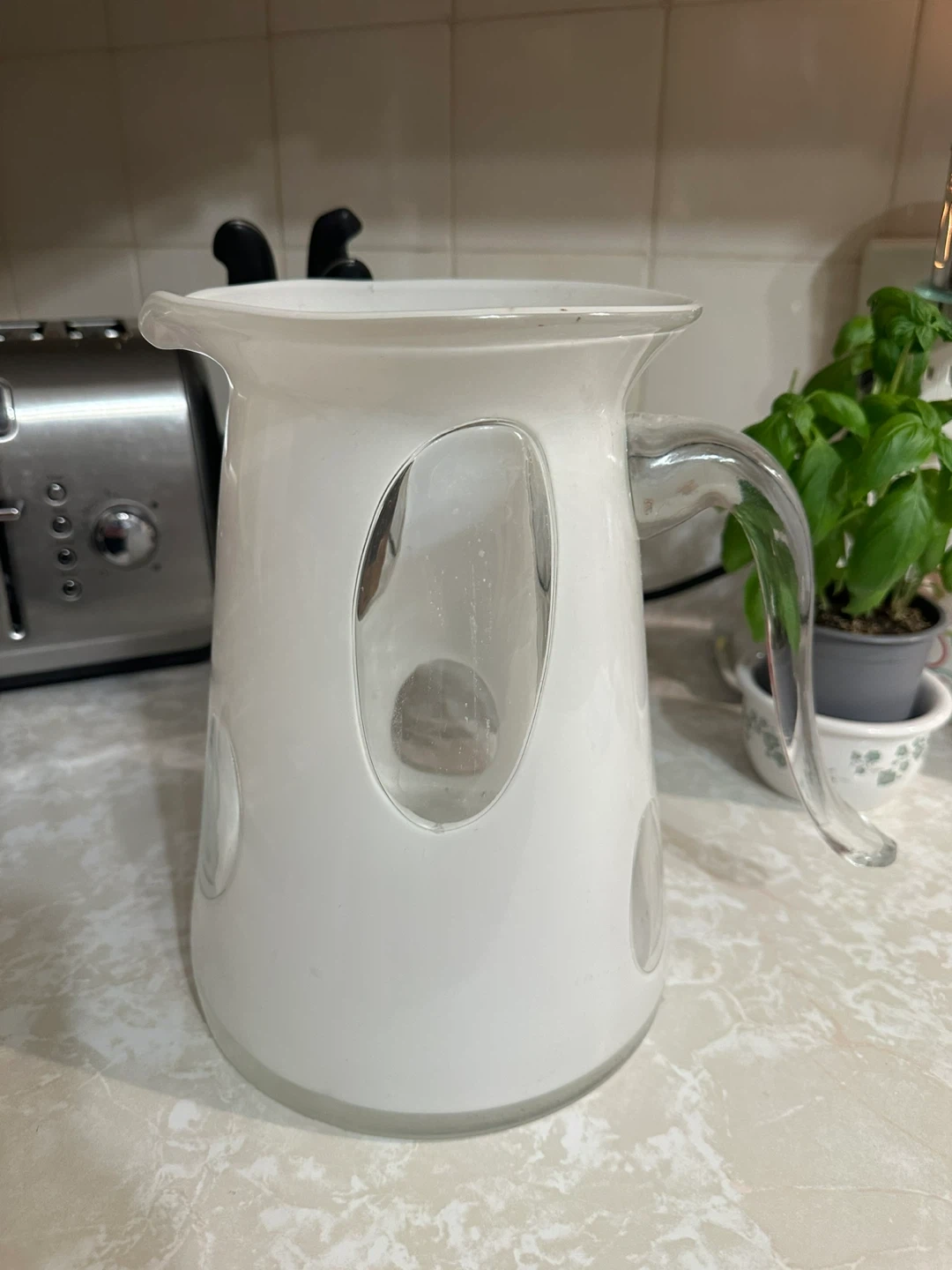 Selling a lovely white glass pitcher! It's in great condition and would look beautiful on any table. The glass handle is comfortable to hold, and the design is quite unique