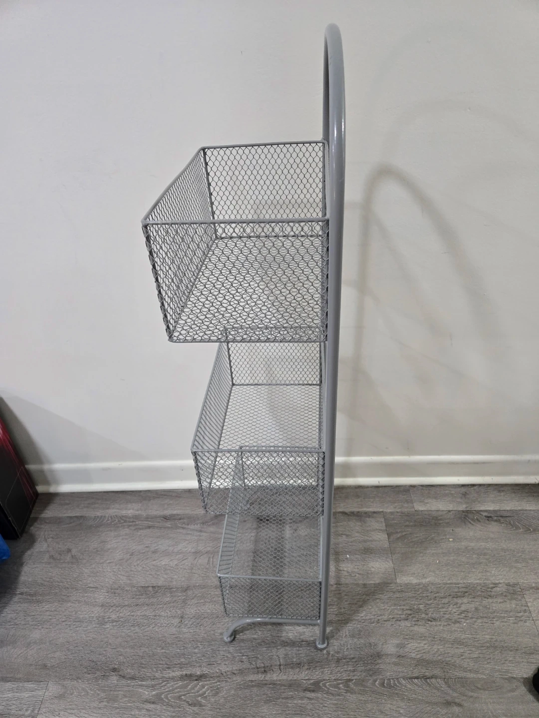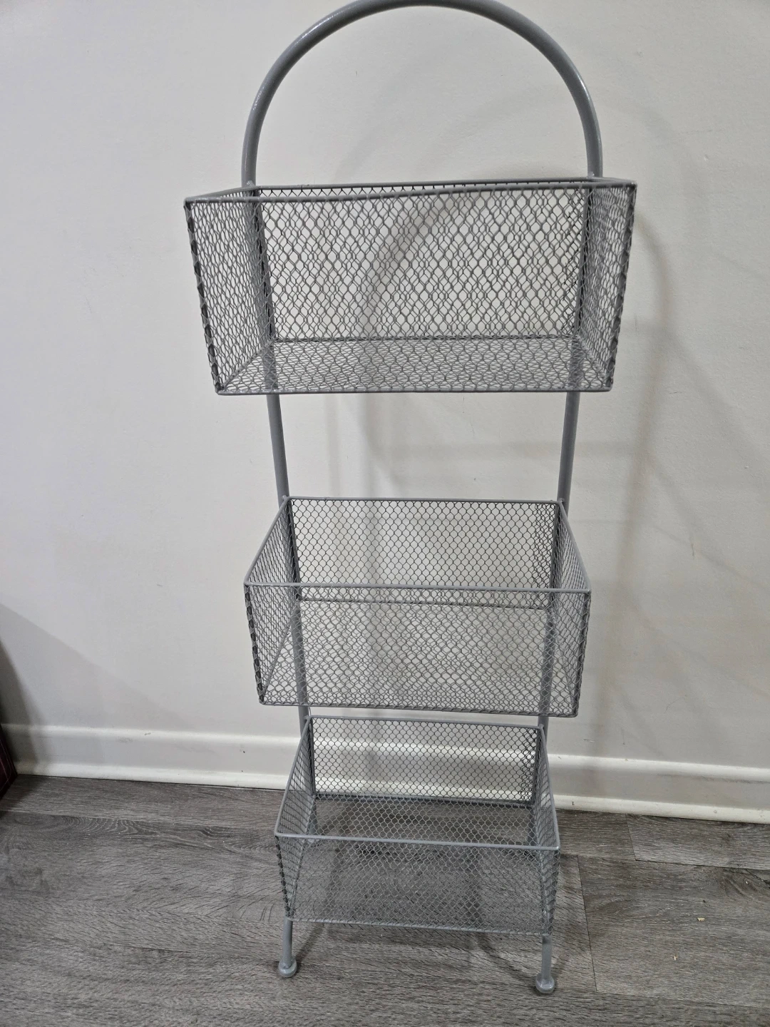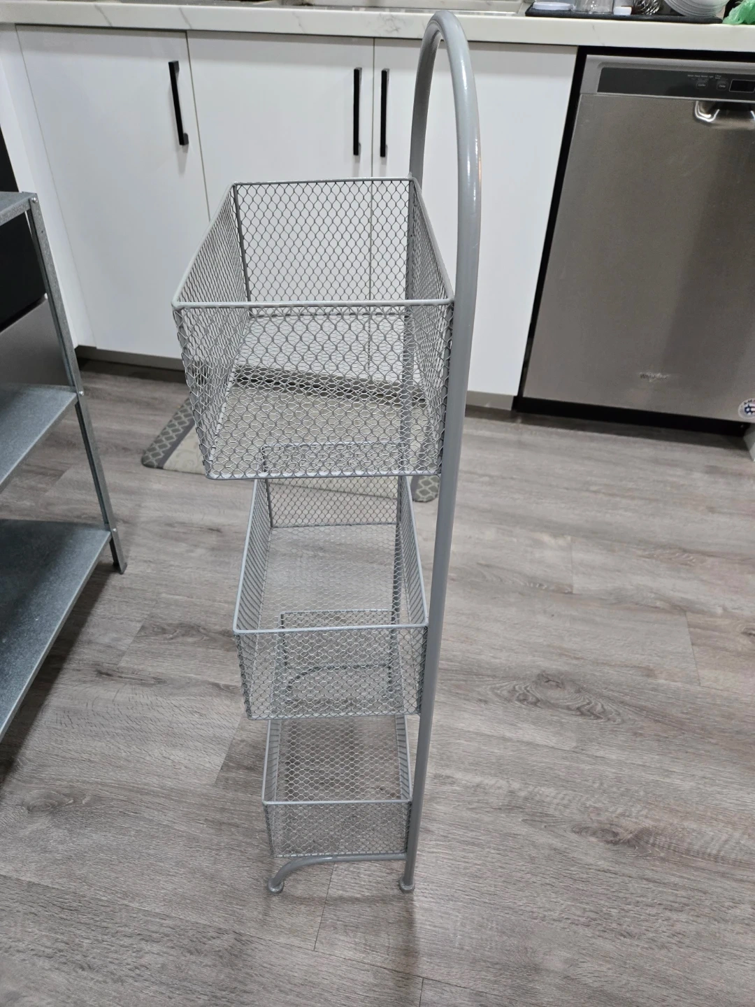 Selling a handy grey metal wire basket storage rack. It features three tiers of baskets, perfect for organizing items in your kitchen, bathroom, or any other space where you need a little extra storage