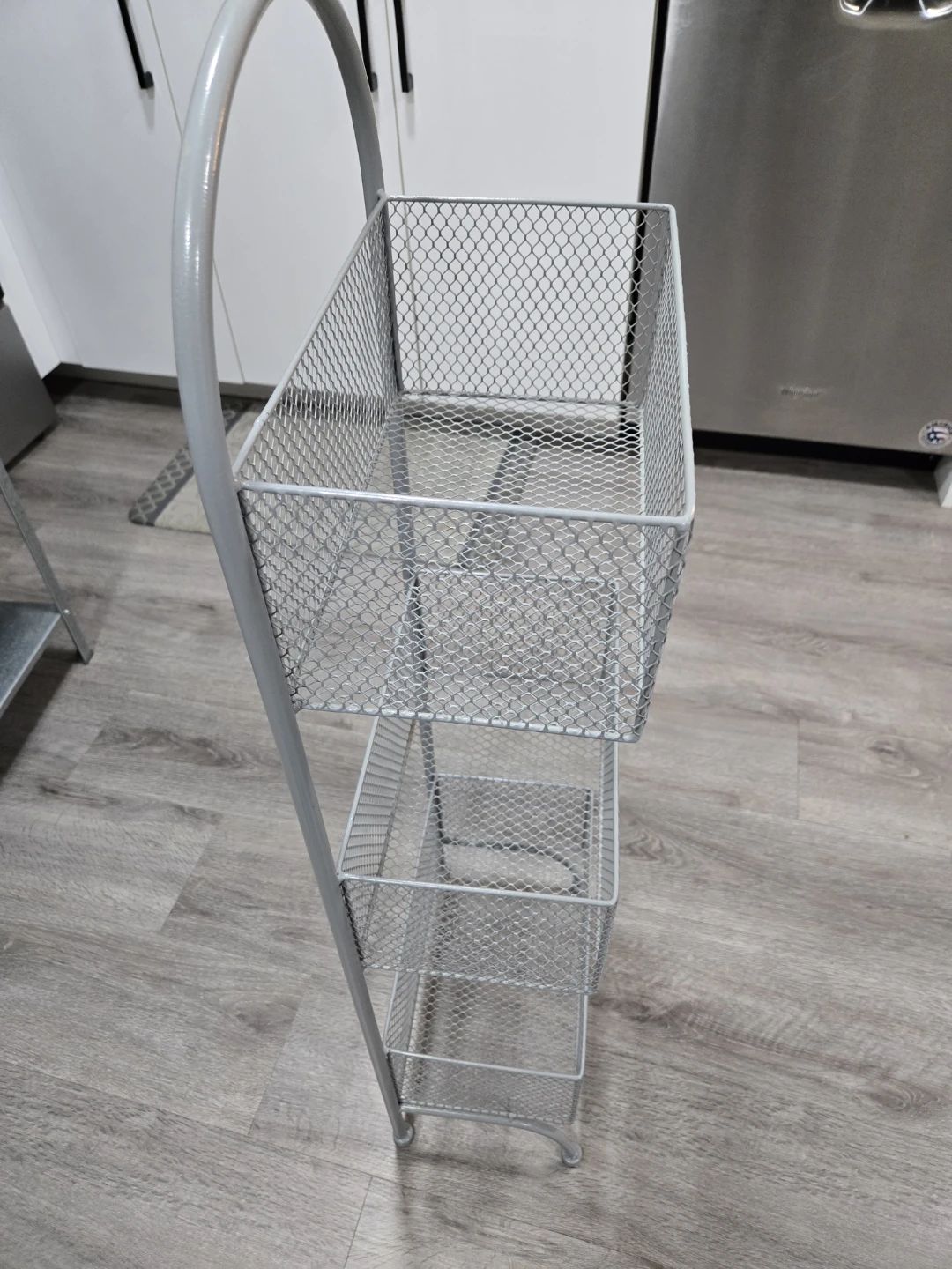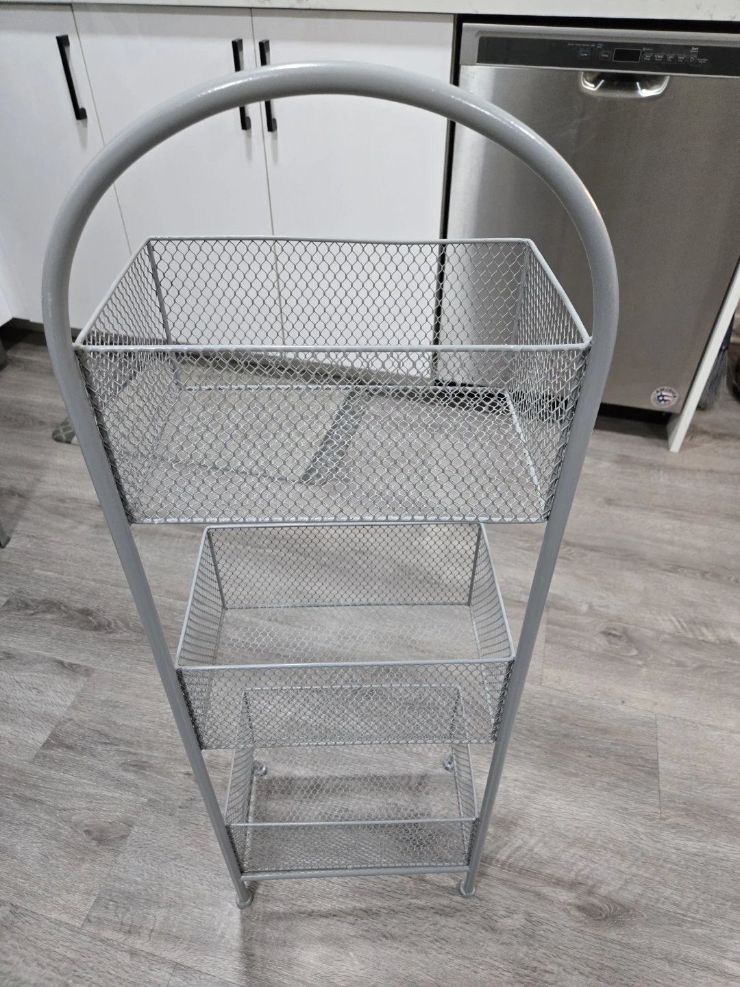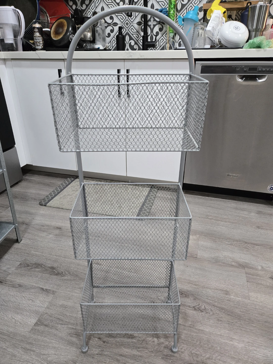 Selling a handy grey metal wire basket storage rack. It features three tiers of baskets, perfect for organizing items in your kitchen, bathroom, or any other space where you need a little extra storage