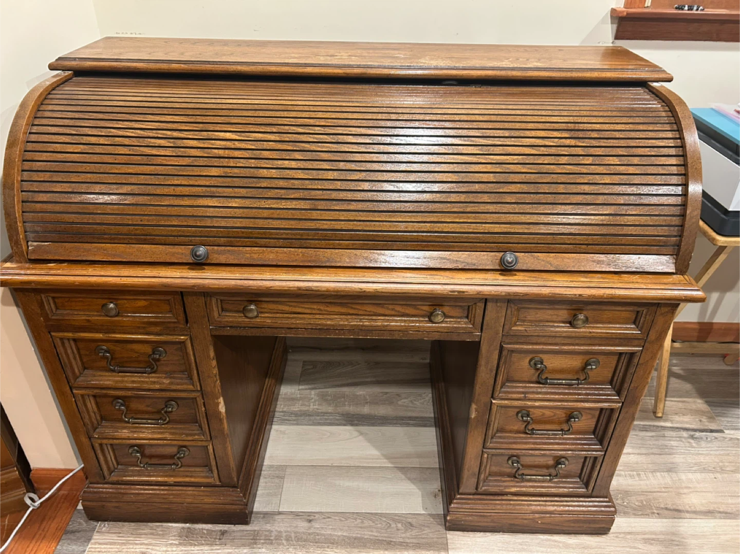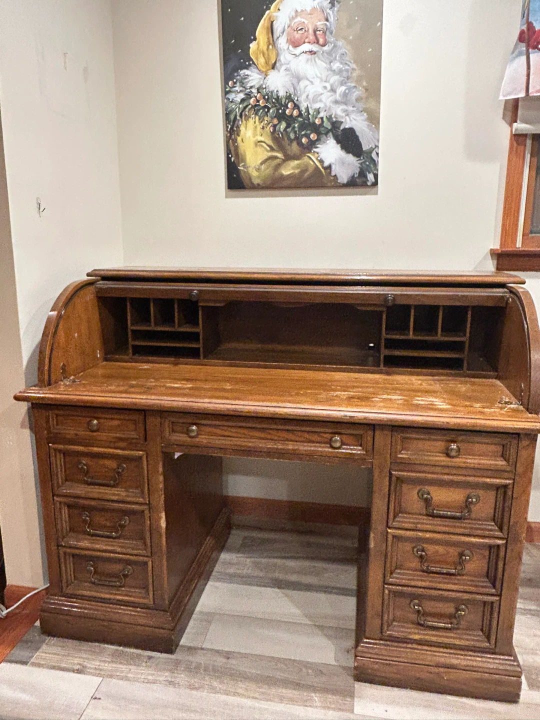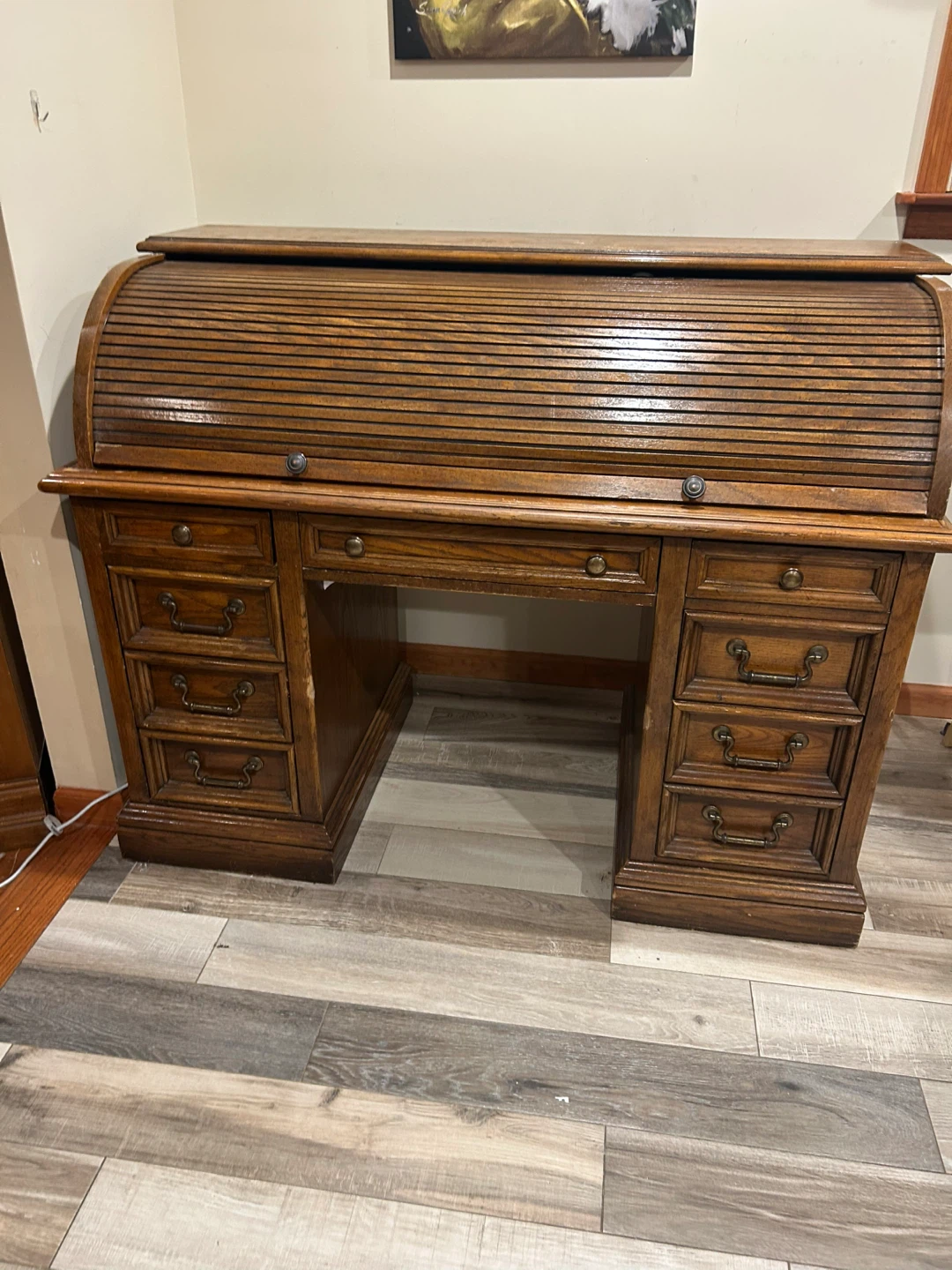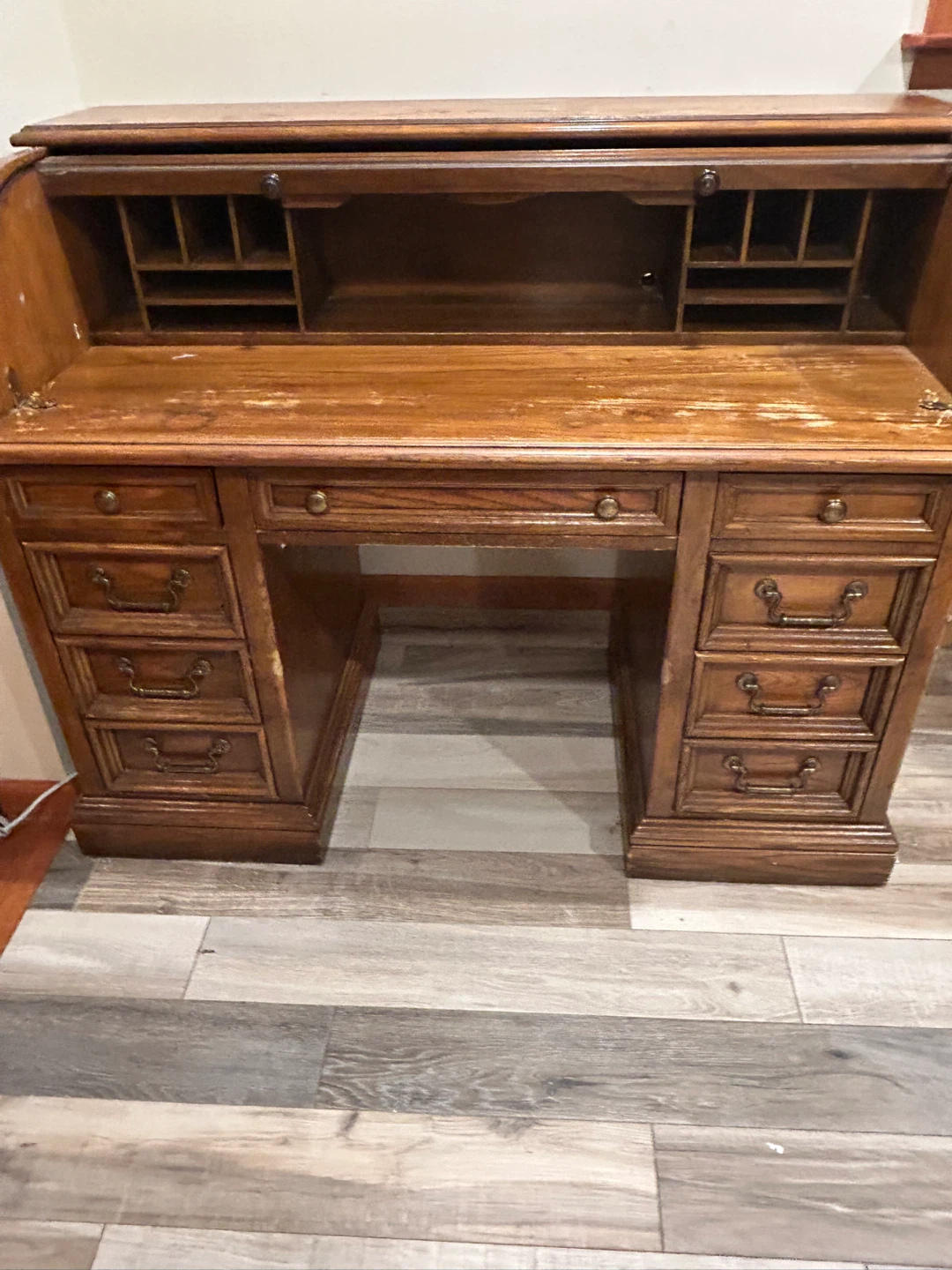 Selling a roll top wooden desk. The desk has several drawers on each side. There is some wear and tear on the desk but still functional. It is a large desk .