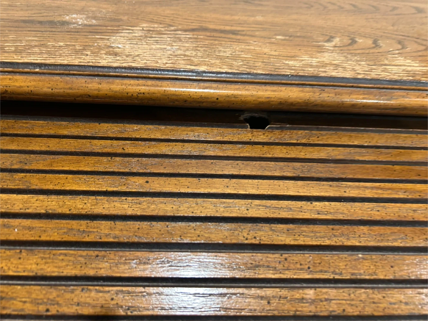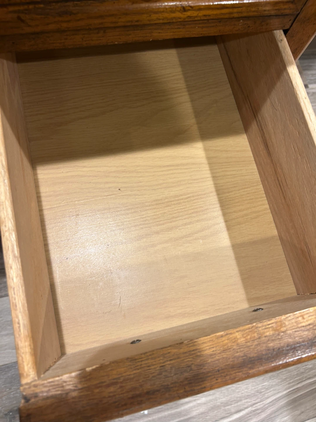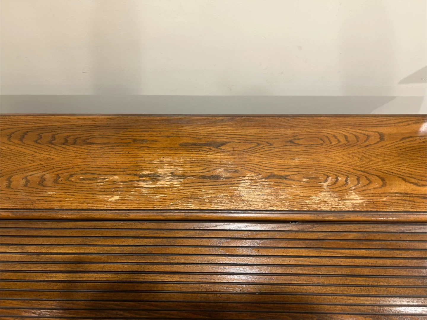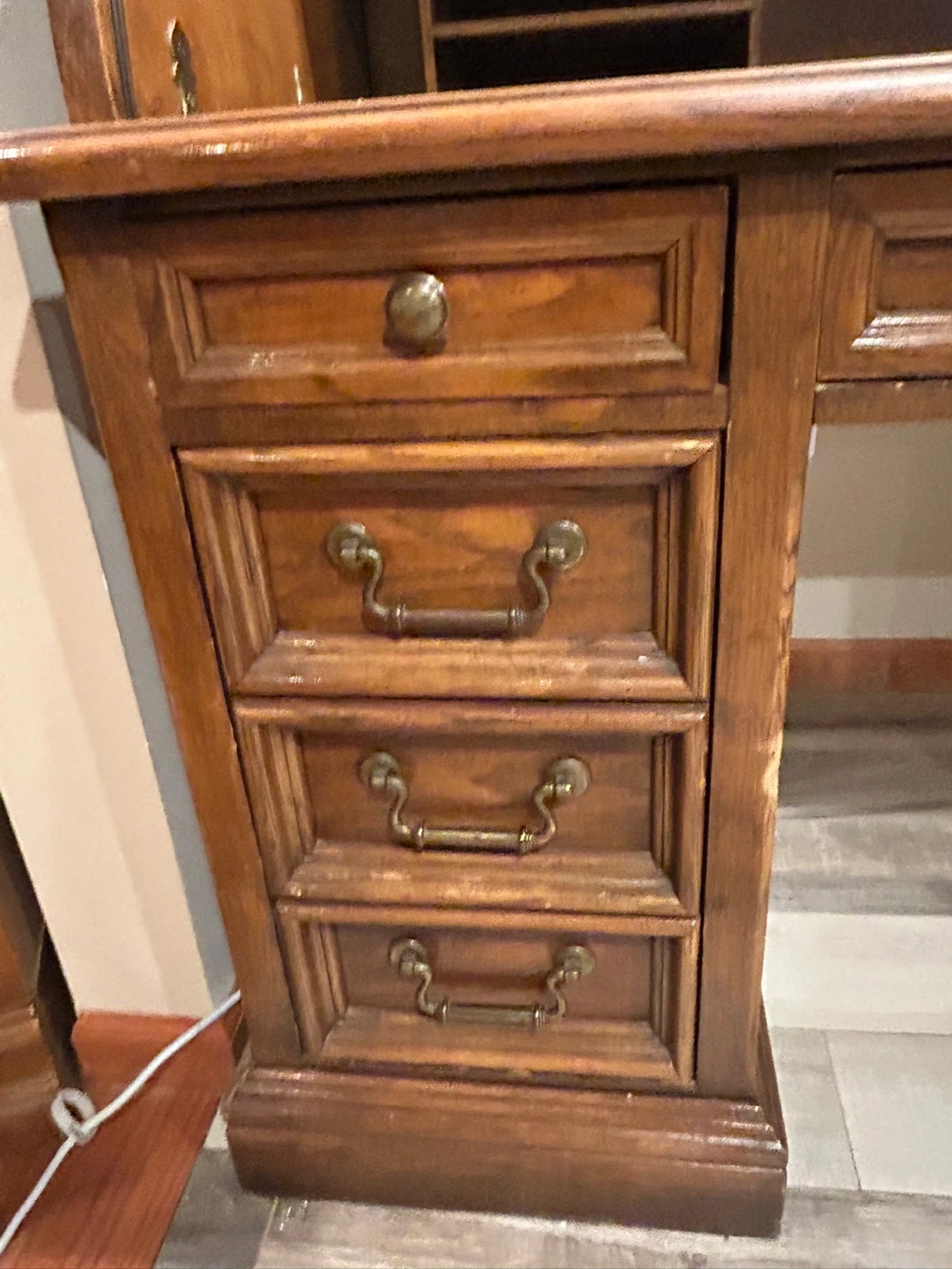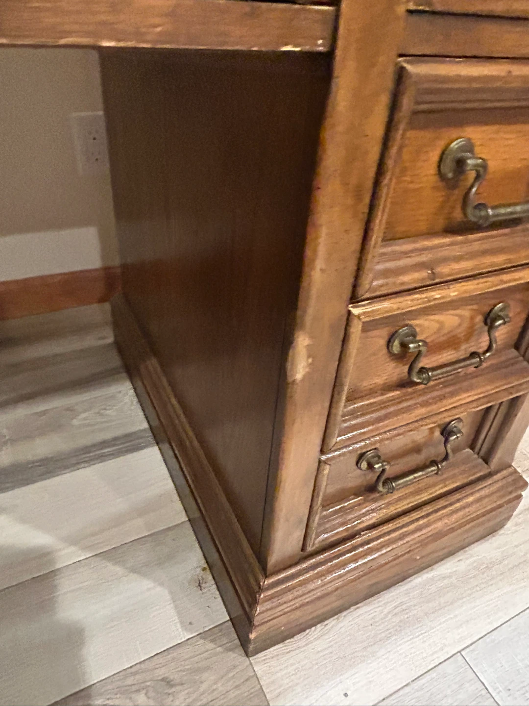 Selling a roll top wooden desk. The desk has several drawers on each side. There is some wear and tear on the desk but still functional. It is a large desk .