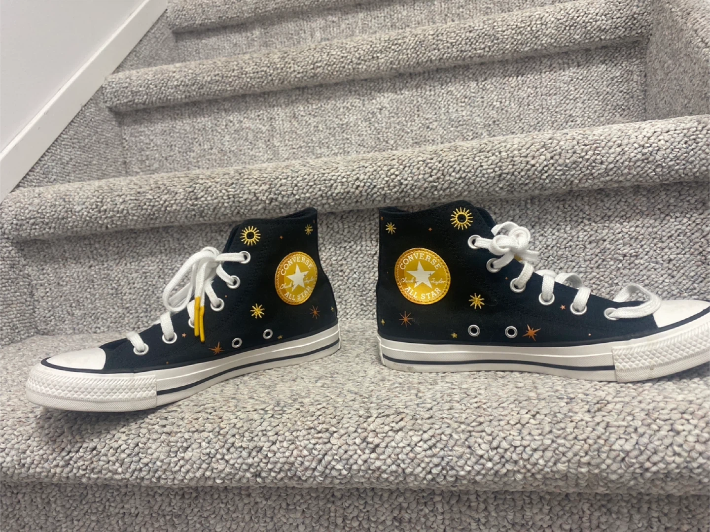 Selling a pair of Converse Chuck Taylor All Star high tops! They are black with a cute celestial sun and star design. The size is a women's 8. They are in great condition and ready for a new adventure! Size 7 pick up cash only