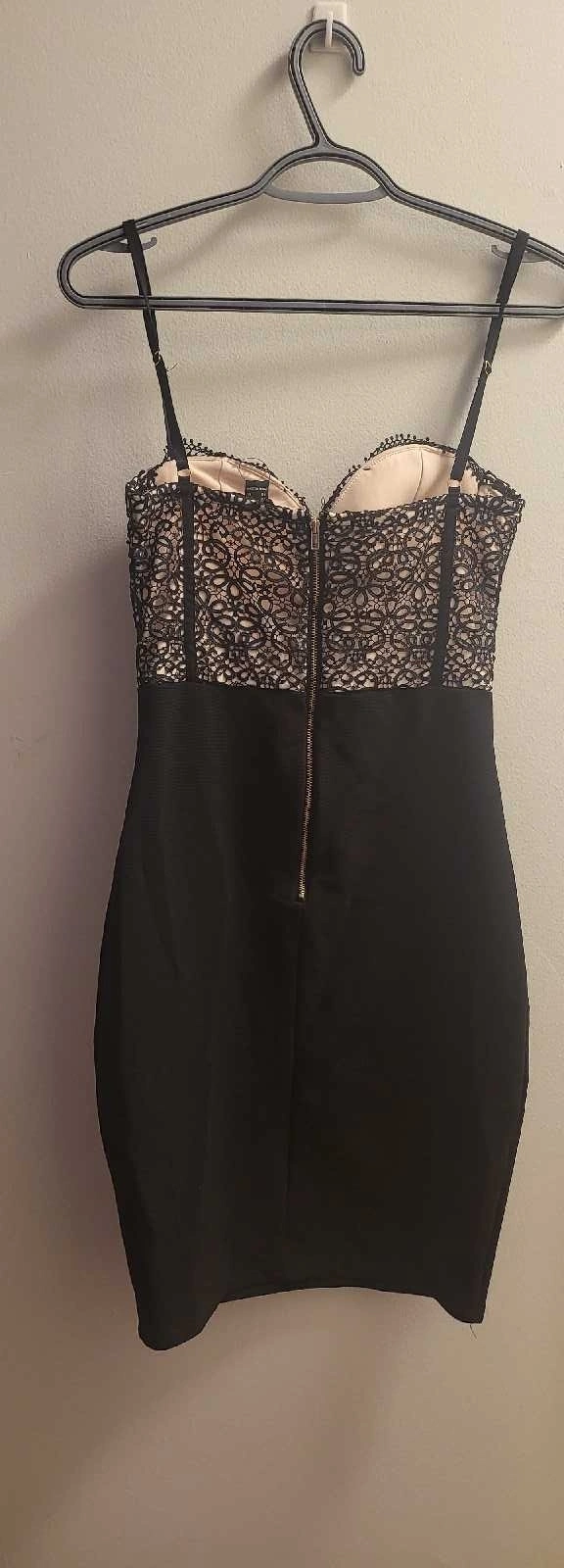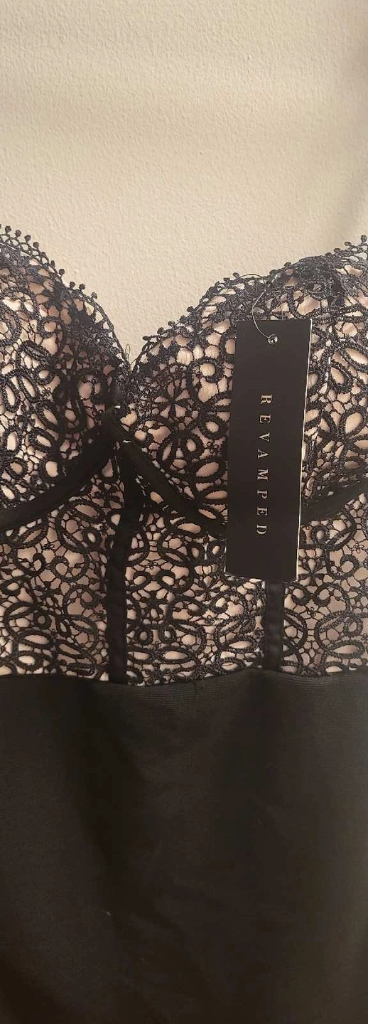 Get ready to turn heads in this Revamped black mini dress, size medium! It features a beautiful lace bodice and a bodycon fit that's perfect for a night out.