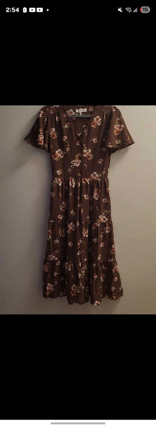 This is a brown, floral print maxi dress in good condition. Perfect for a summer outing or a casual day! * Tiered hem * V-neck * Short sleeves * Brand: Montreau Los Angeles Looking to give this lovely dress a new home. The listed price reflects its condition and style, drawing from comparable listings on Kijiji. If you're reading this, the dress is still available!