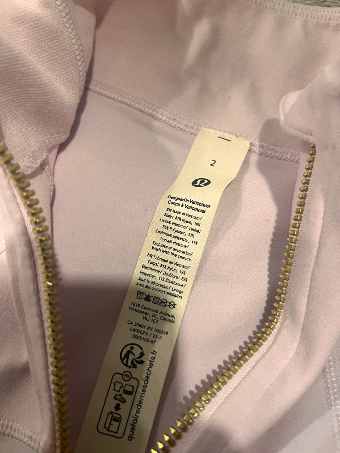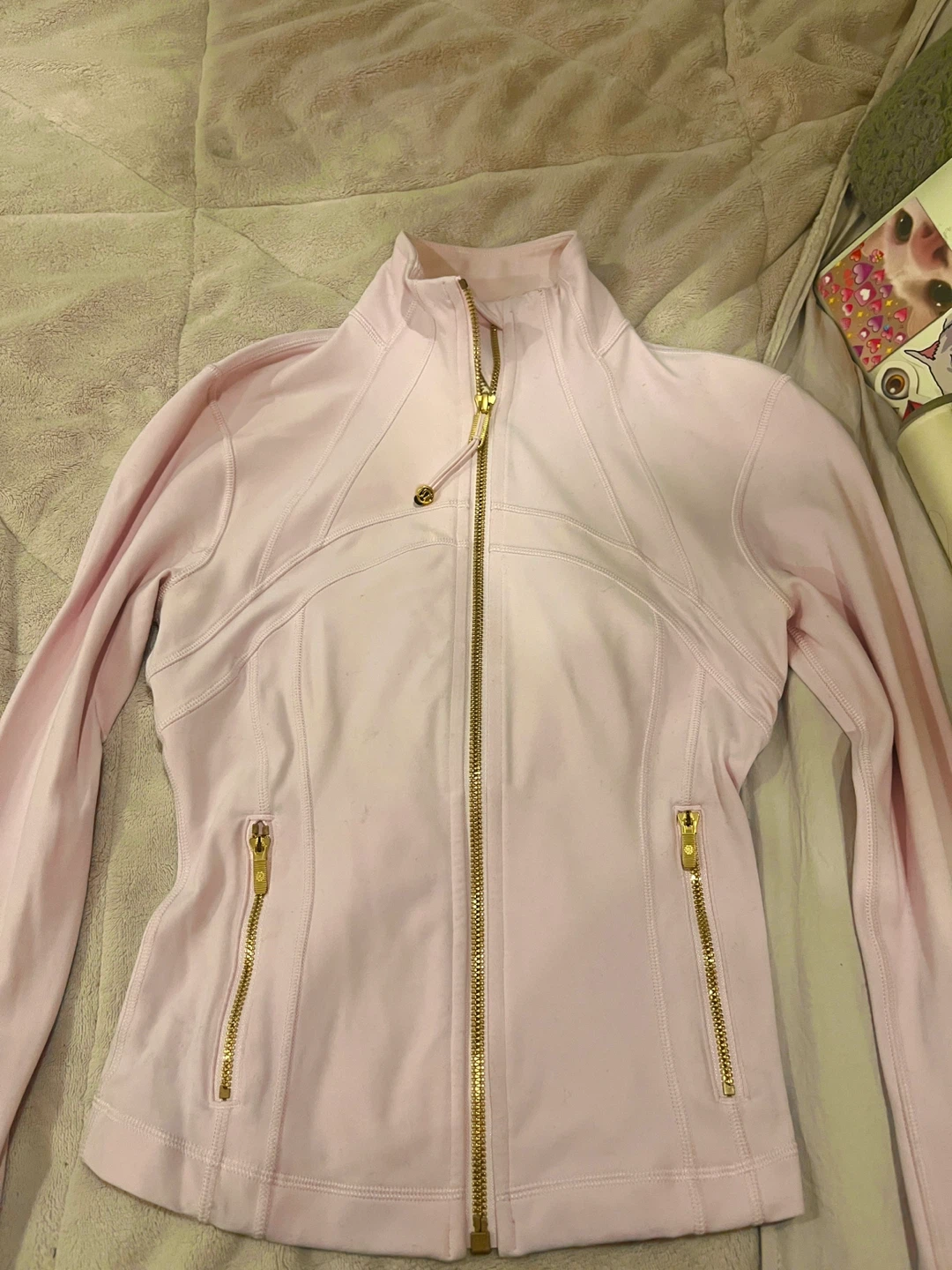 Selling a Lululemon Define Jacket in size 2! It's in great condition and ready for a new owner. The jacket is a light pink color with gold zippers. There is a bit of stains but they are washable