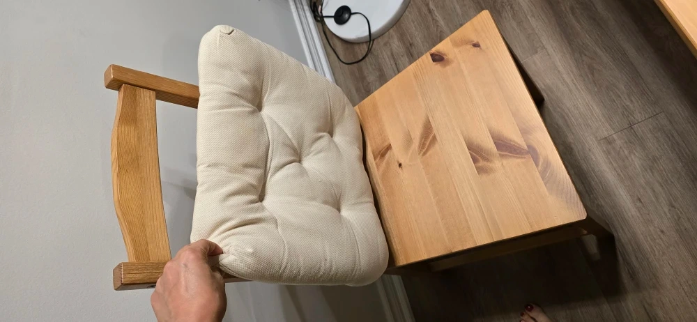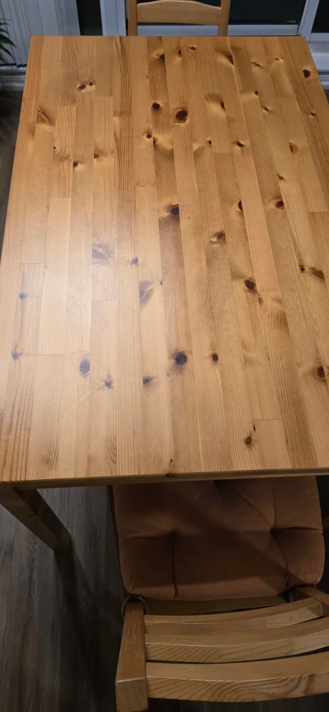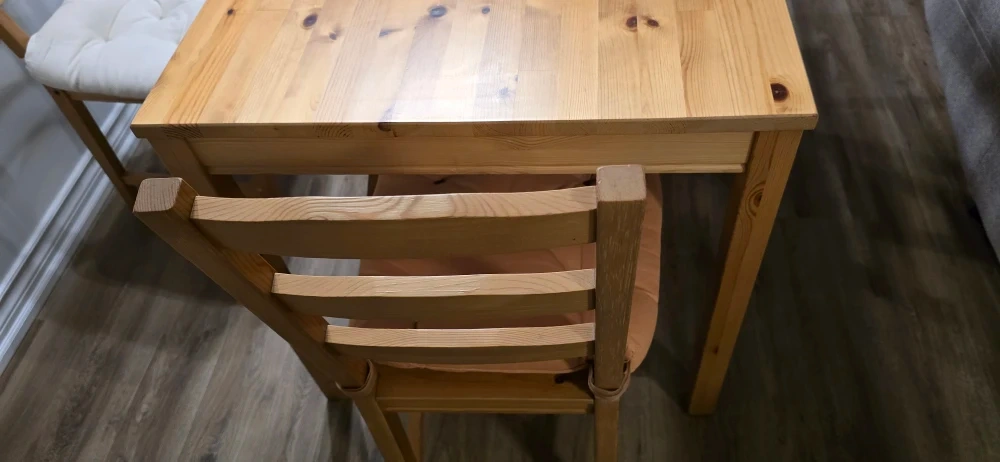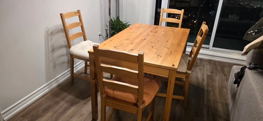 Selling a solid wood dining table from IKEA with four matching chairs. The set is in great condition and ready for a new home.