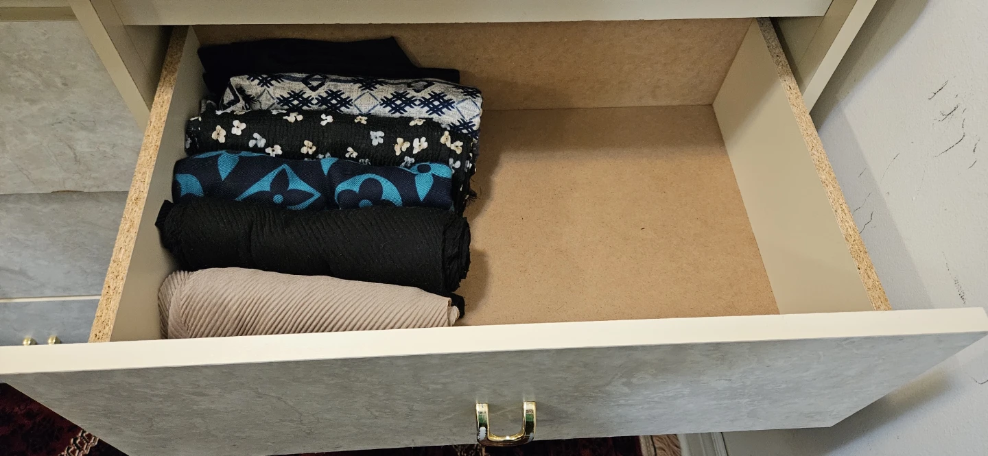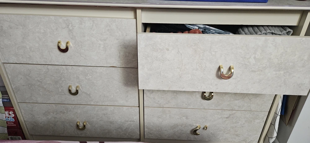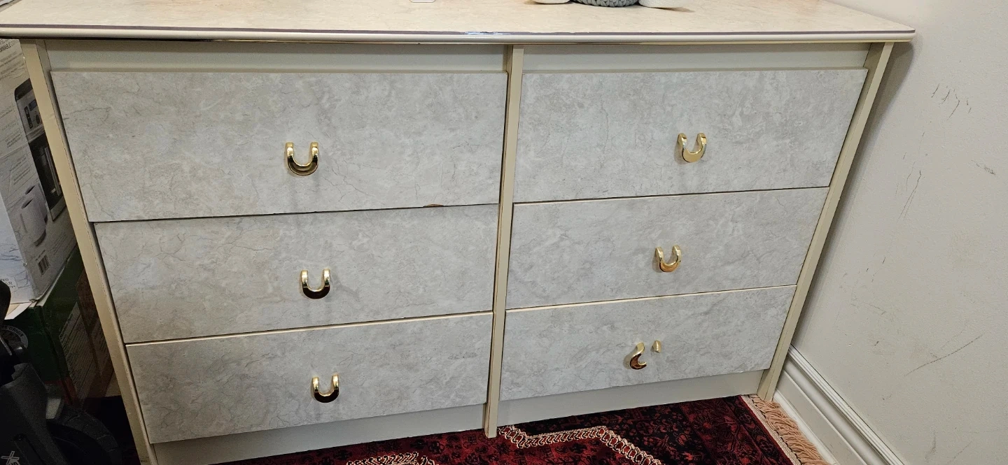 Here's a dresser with a unique marble-look finish and stylish gold handles. It has six drawers, providing ample storage space with end table. It's a great addition to any bedroom or living area!