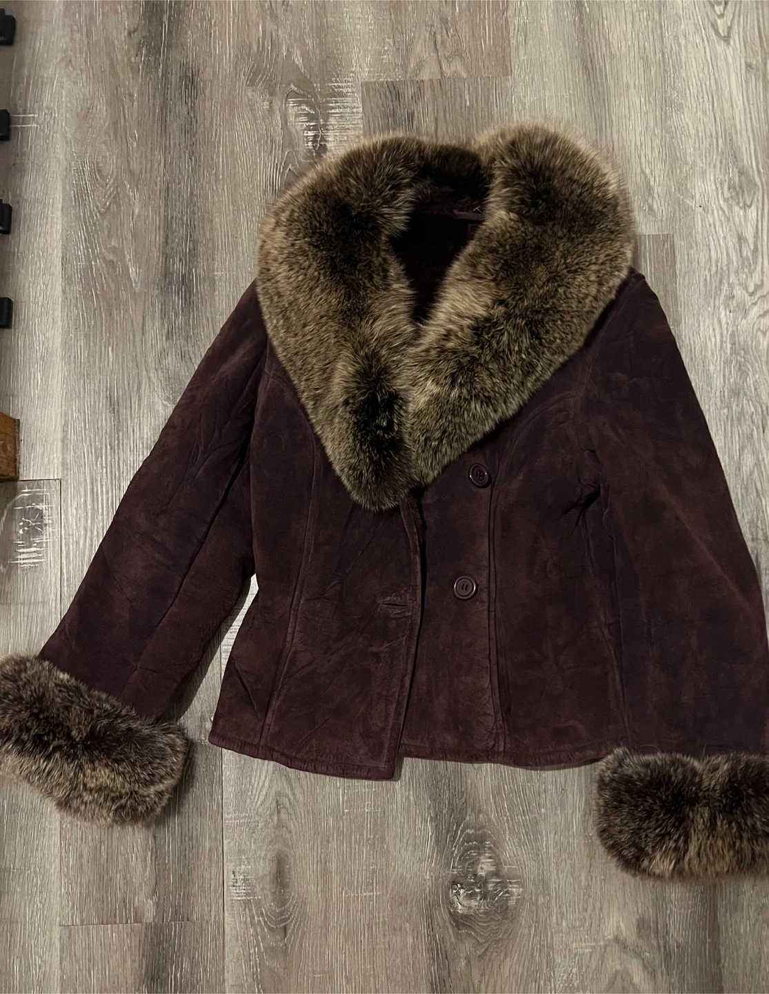 Selling a Danier suede jacket with a fur collar and cuffs. It's a size M and in great condition. Perfect for adding a touch of warmth and style to your wardrobe!