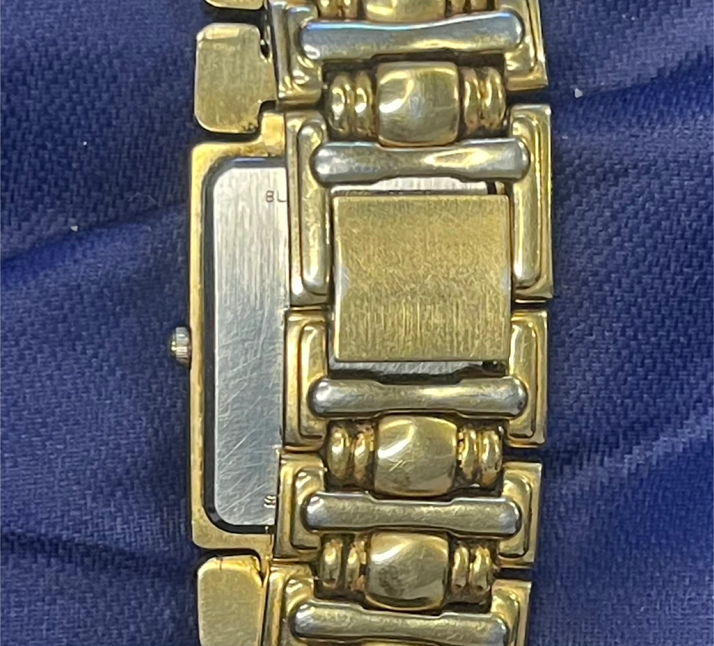 Chunky gold-tone links, rectangular face, and a clean minimalist dial —