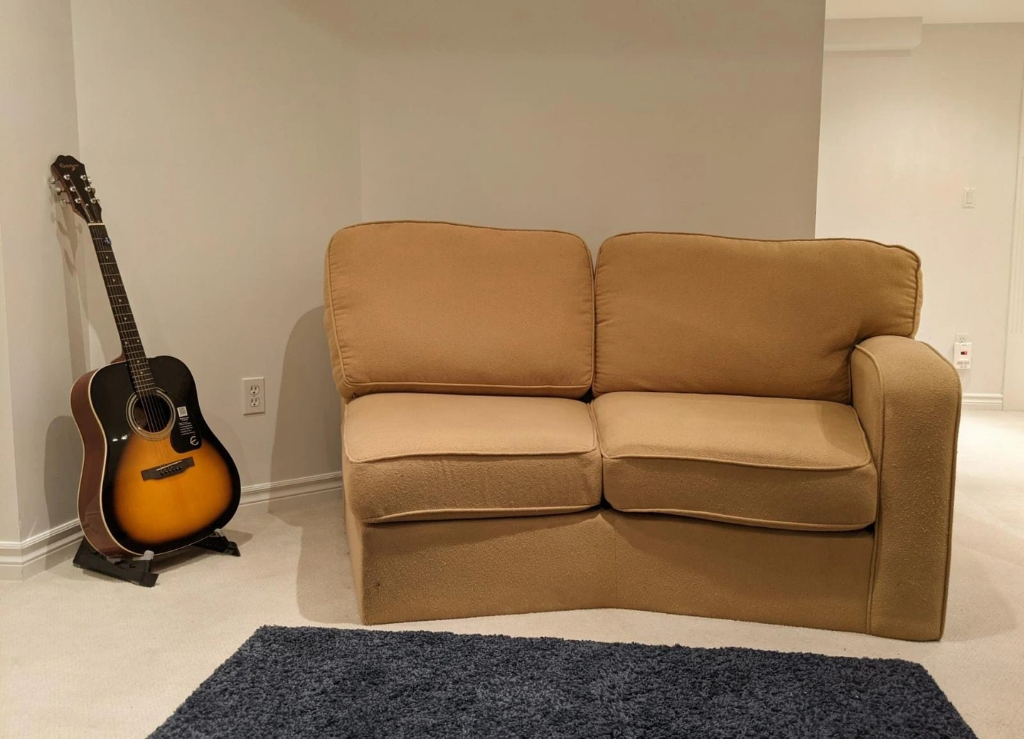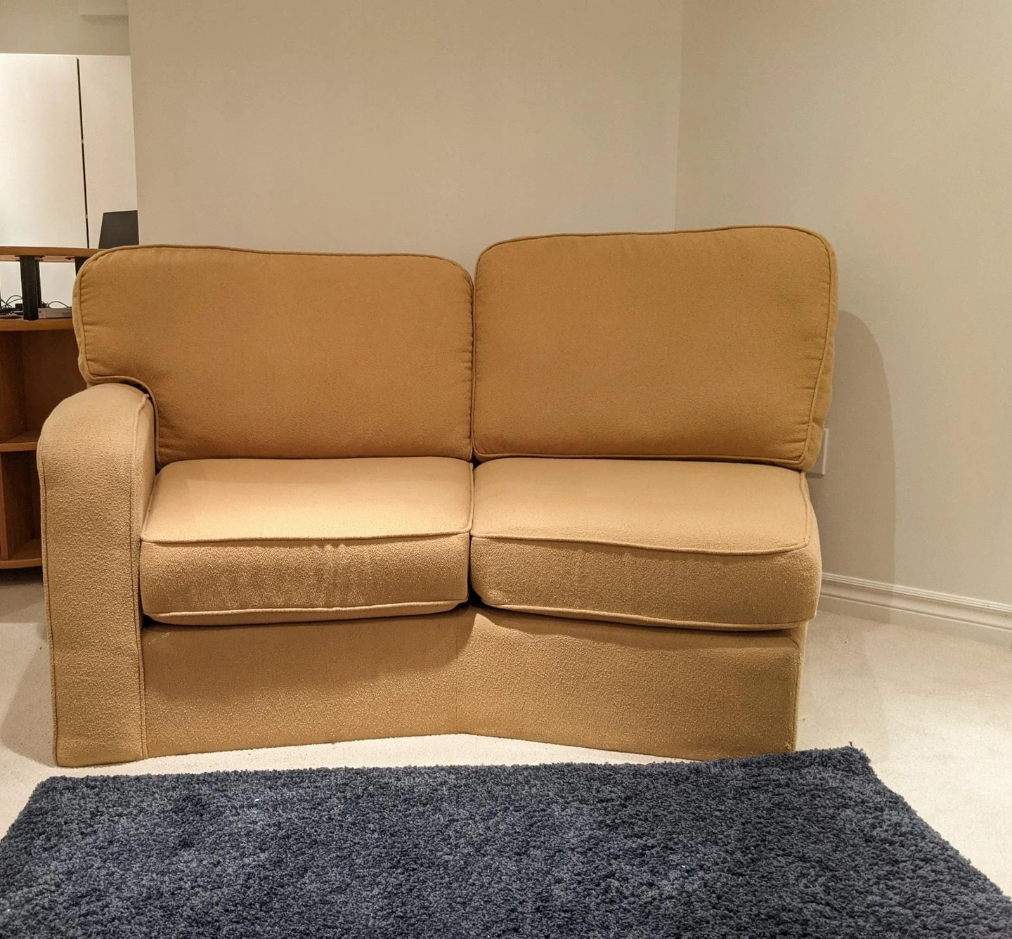 Selling this modern and super-comfy 4-seater curved sofa in a warm beige fabric. Prefect for living rooms, basements, entertainment spaces, or a cozy family room setup.