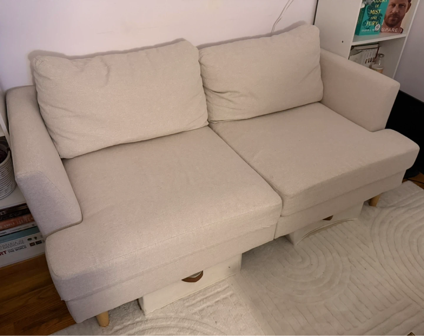 Selling a comfy beige loveseat sofa! It's in great shape and ready for a new home. Perfect for a small apartment or cozy living room.