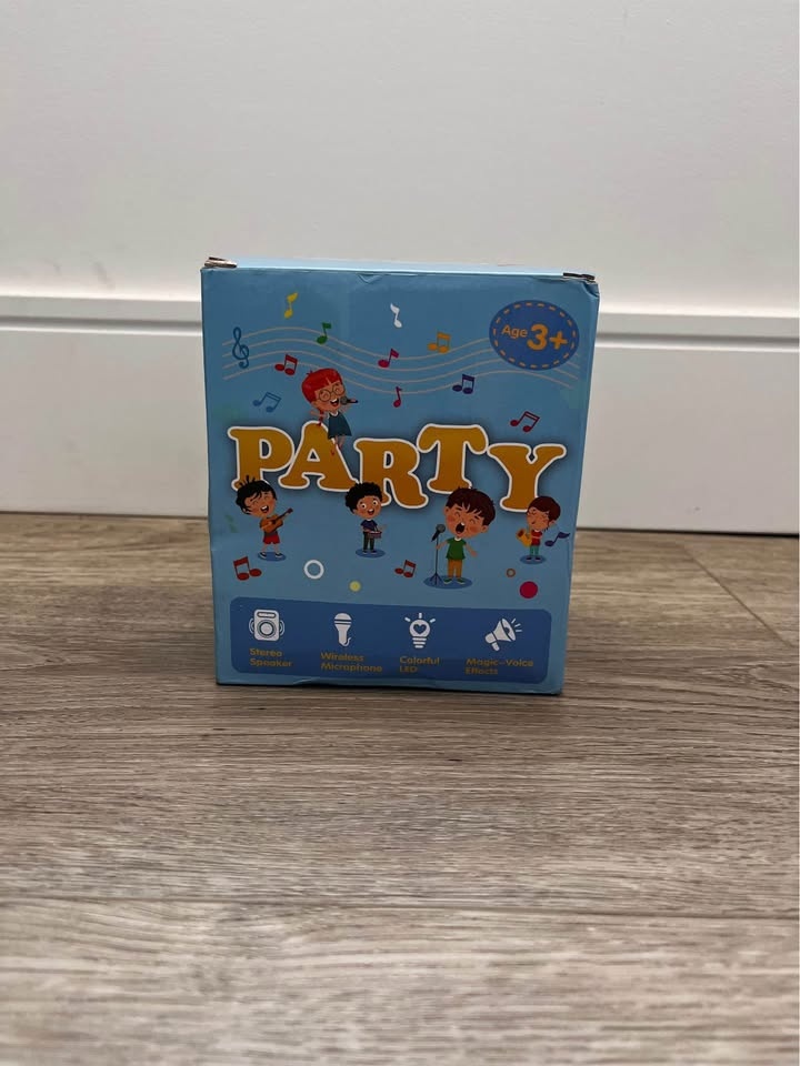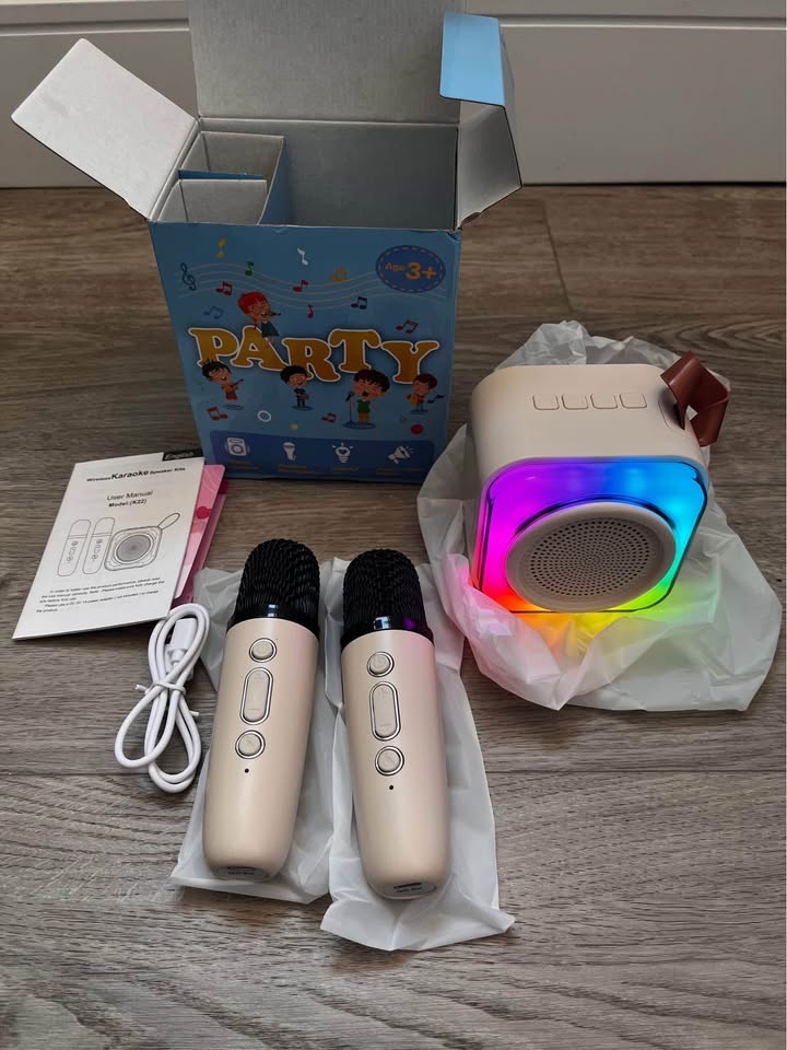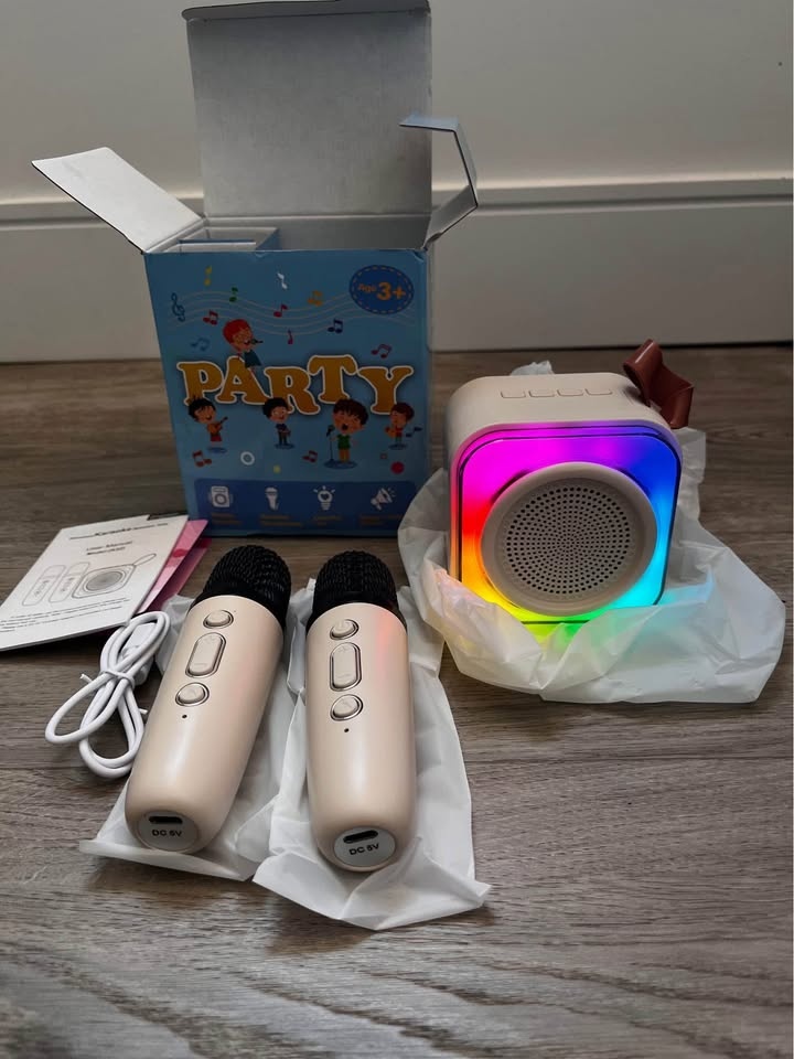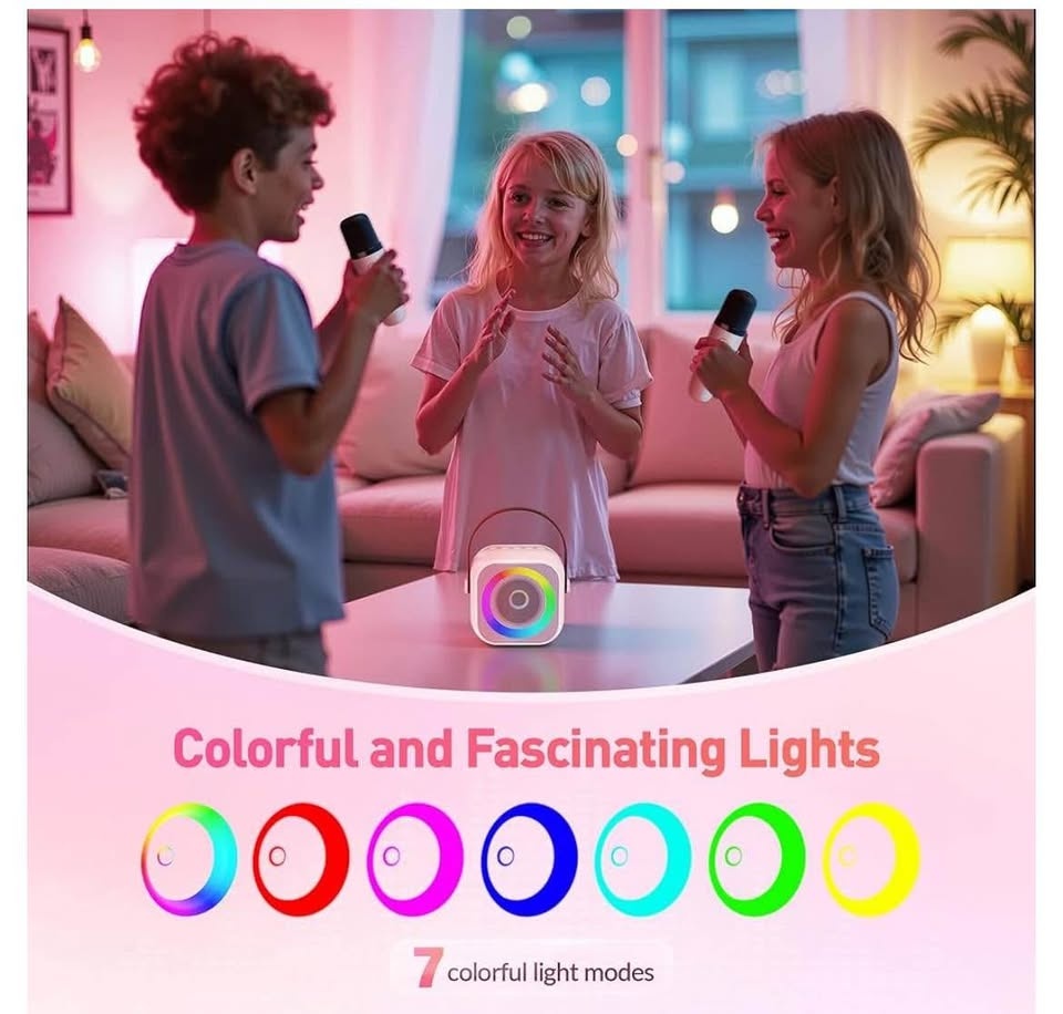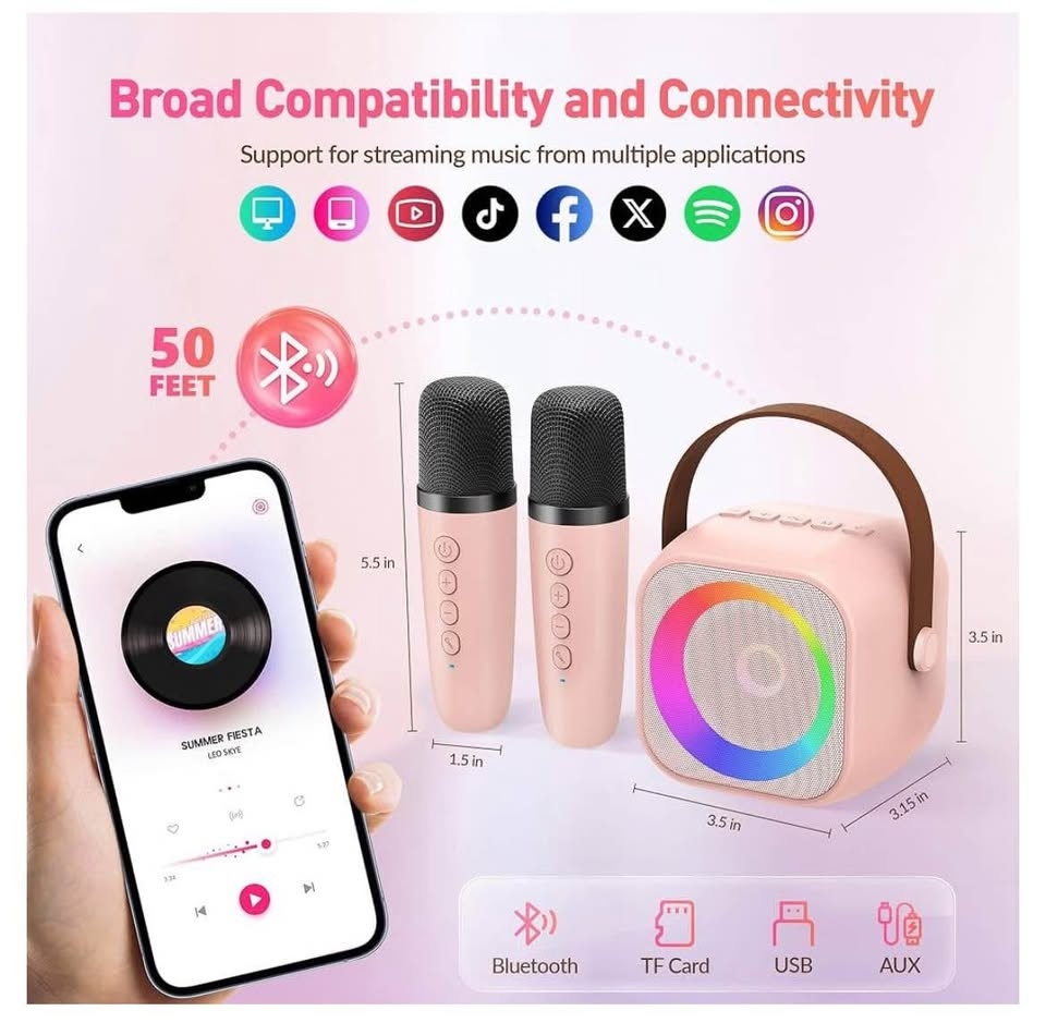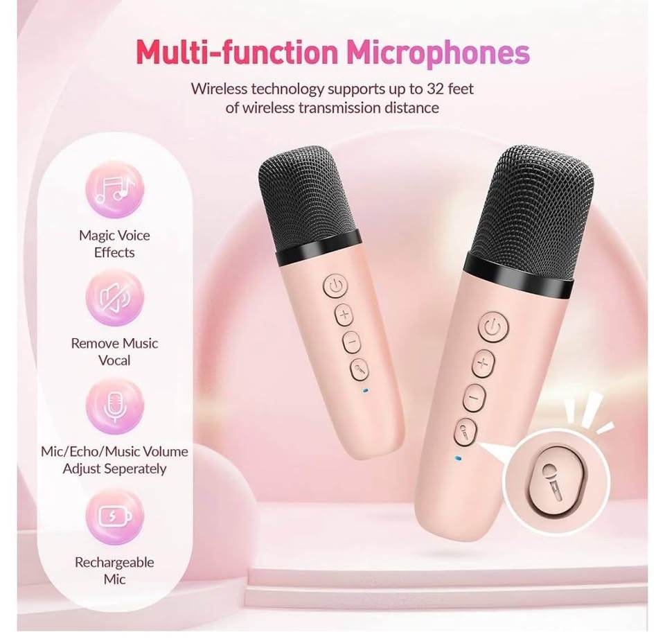 New mini karaoke machine for kids and adults. Portable Bluetooth speaker with 2 wireless microphones. Pink color. Compatible with smartphones, tablets, PCs, laptops, and speakers. Features HI-FI sound quality, 8-10 hours of playtime, funny voice changes (girl's, boy's, baby's, monster's), vibrant LED lights, Bluetooth connectivity, audio effects, voice modulation, and KTV-level sound effects. Great gift idea for ages 4-10 and up!