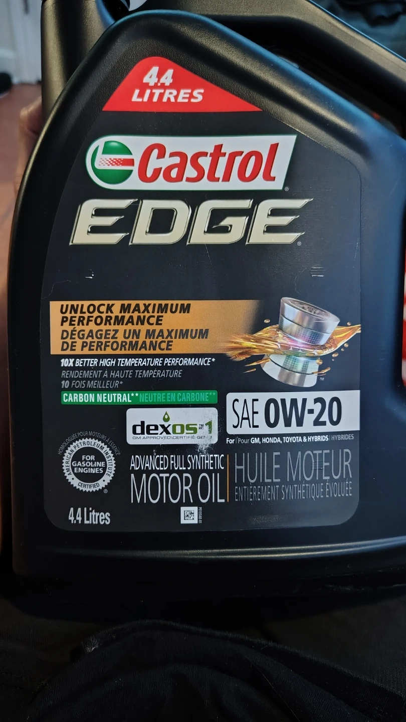 Selling a 4.4 Litres jug of Castrol Edge motor oil, SAE 0W-20. It's an advanced full synthetic motor oil designed for gasoline engines and provides maximum performance