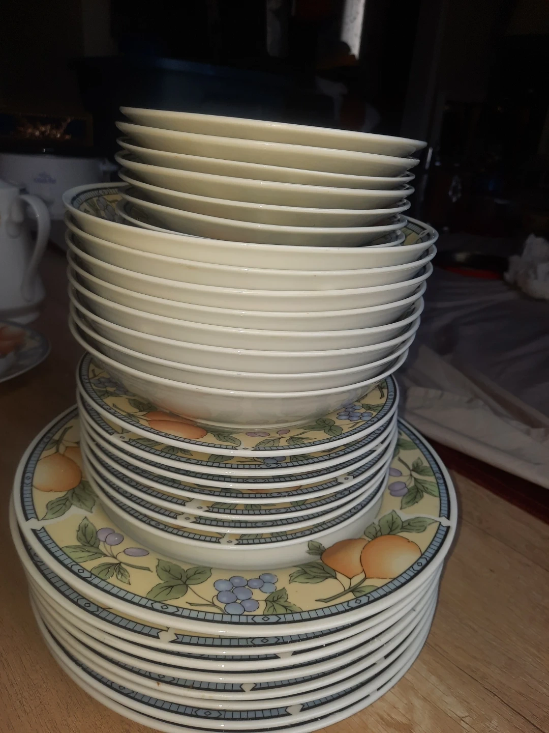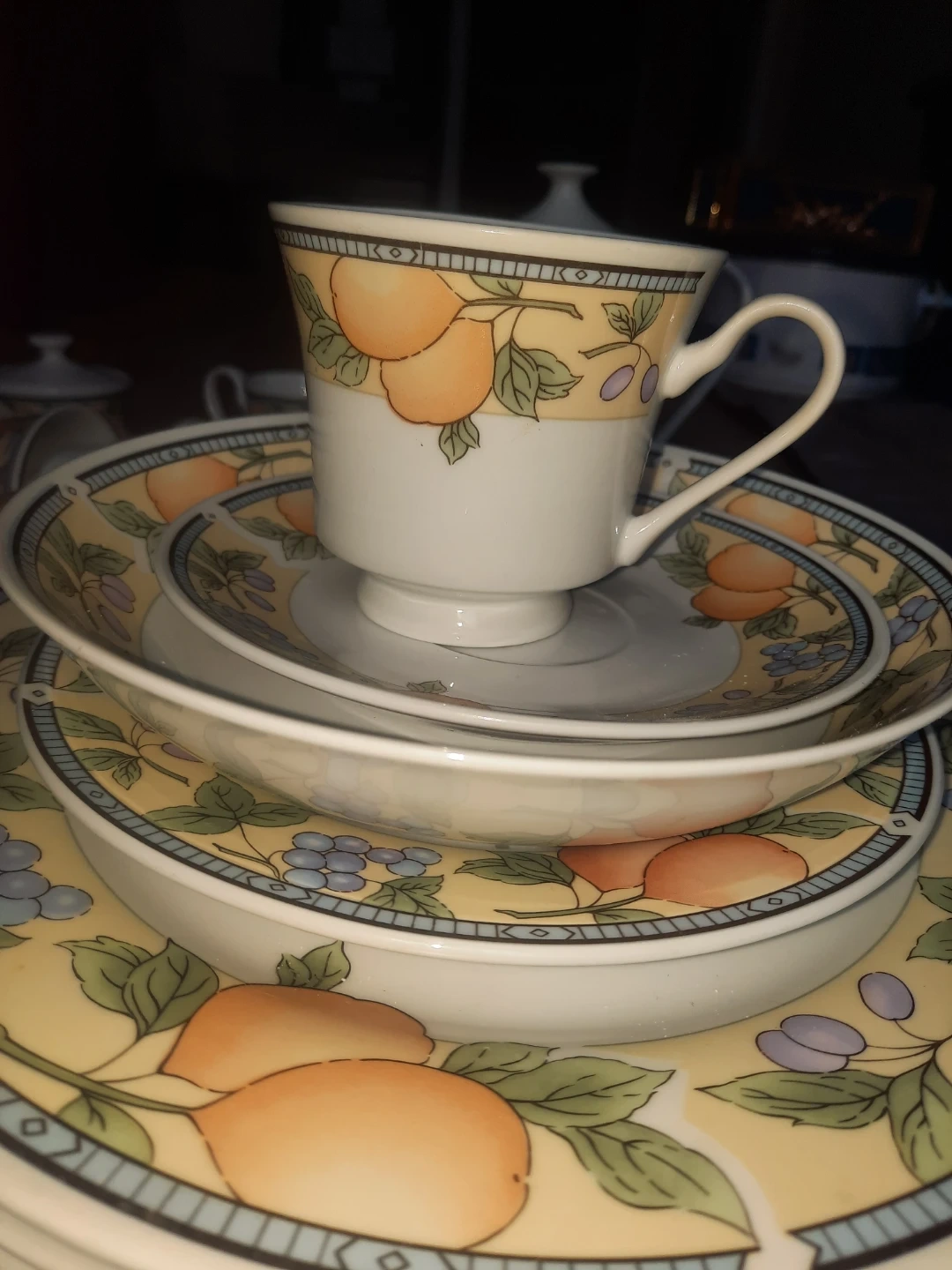 The set features a lovely fruit and floral design around the edges. Perfect for adding a touch of elegance to your dining table!